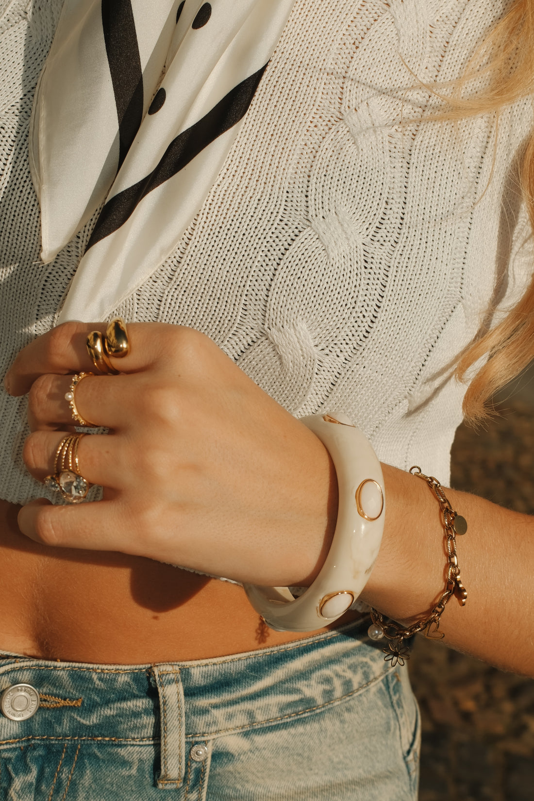 De Elin bangle is een stijlvolle statement armband in een zachte crème marmerlook. De goudkleurige...