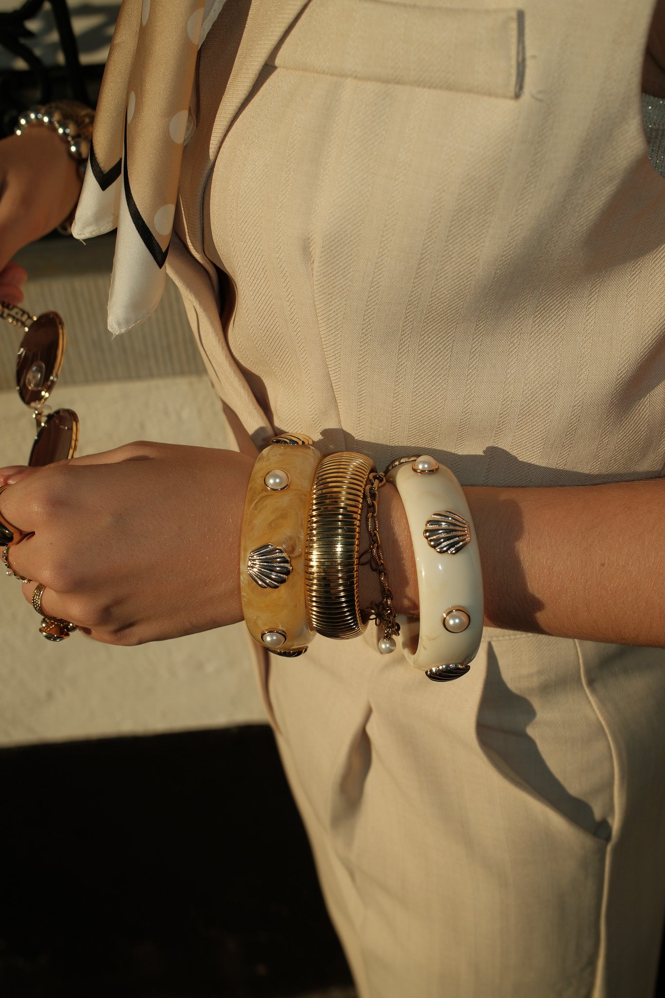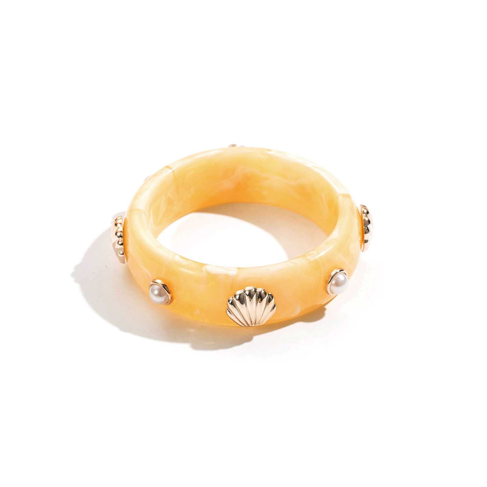 De Zaya armband is een stijlvolle eyecatcher met een warme, zomerse uitstraling. De brede cuff in gemarmerd honingkleurig hars wordt verfijnd door goudkleurige schelpdetails en subtiele parelaccenten. Draag haar solo voor een krachtig statement of combineer met andere gouden armbanden voor een luxe, gelaagde look. Perfect voor zonnige dagen en zwoele avonden.