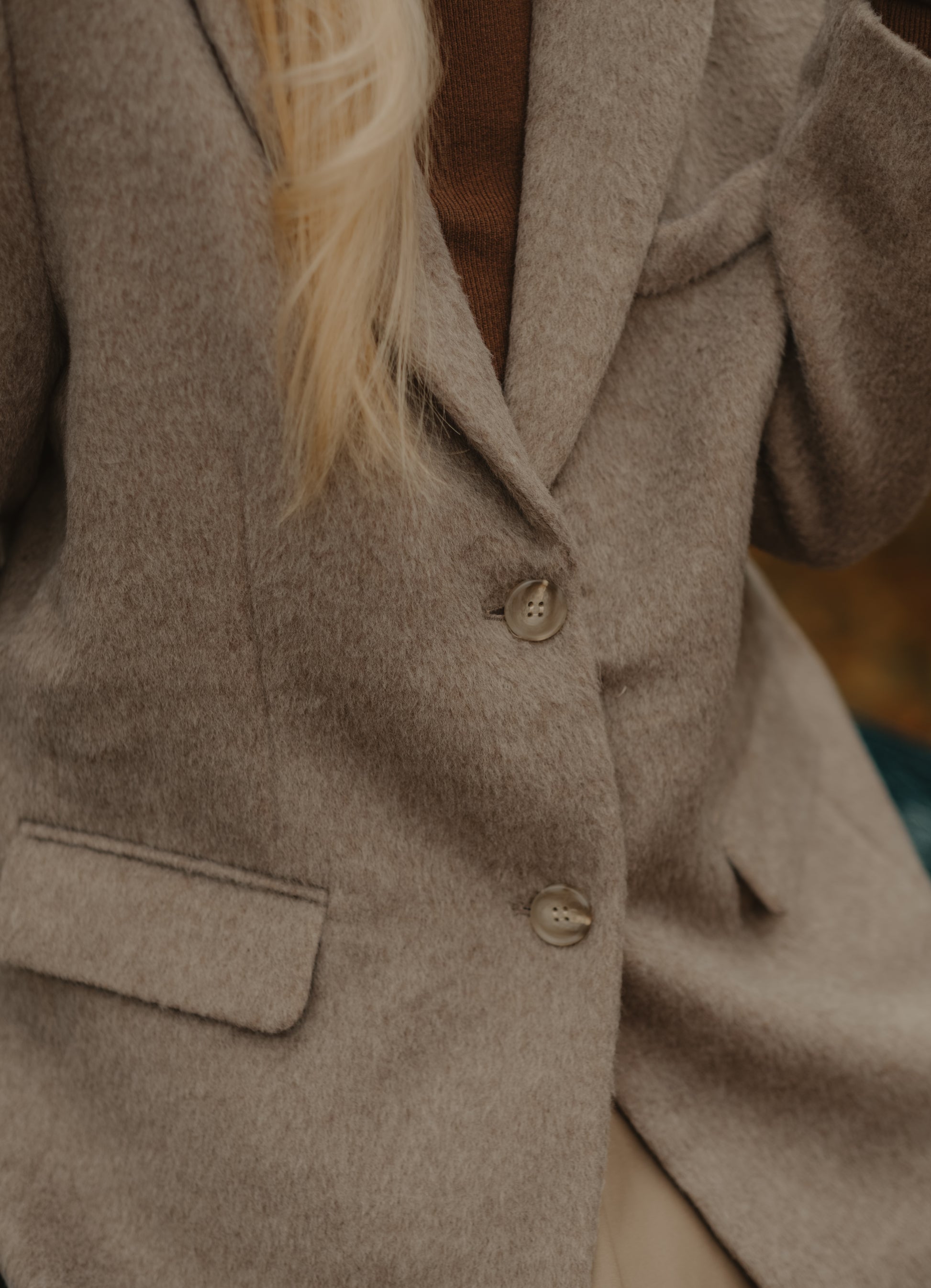 De Blazer Bambi taupe combineert zachtheid met verfijning. De warme taupe kleur en wollige textuur geven deze blazer een elegante, maar toegankelijke uitstraling. Dankzij de klassieke reverskraag en rechte pasvorm oogt Bambi tijdloos en chic, terwijl het zachte materiaal zorgt voor een comfortabele fit.