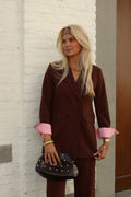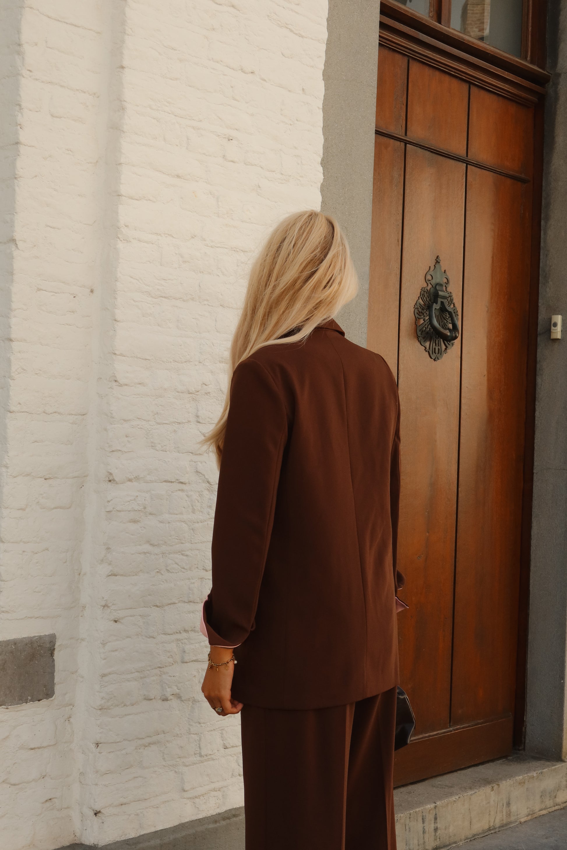 De Blazer Roos in bruin is een stijlvolle double-breasted blazer die klasse en originaliteit combineert. Het diepe bruin zorgt voor een tijdloze uitstraling, terwijl het verrassende roze detail aan de binnenkant van de mouwen een speelse twist toevoegt. Draag de mouwen nonchalant omgeslagen om dit unieke accent te laten zien. Een veelzijdige blazer die zowel chic als modern is – perfect voor kantoor of een avond uit.