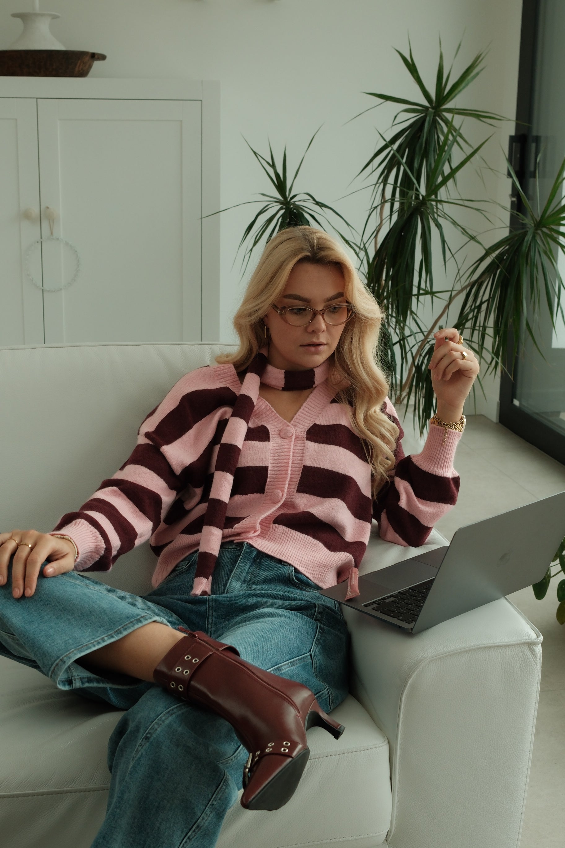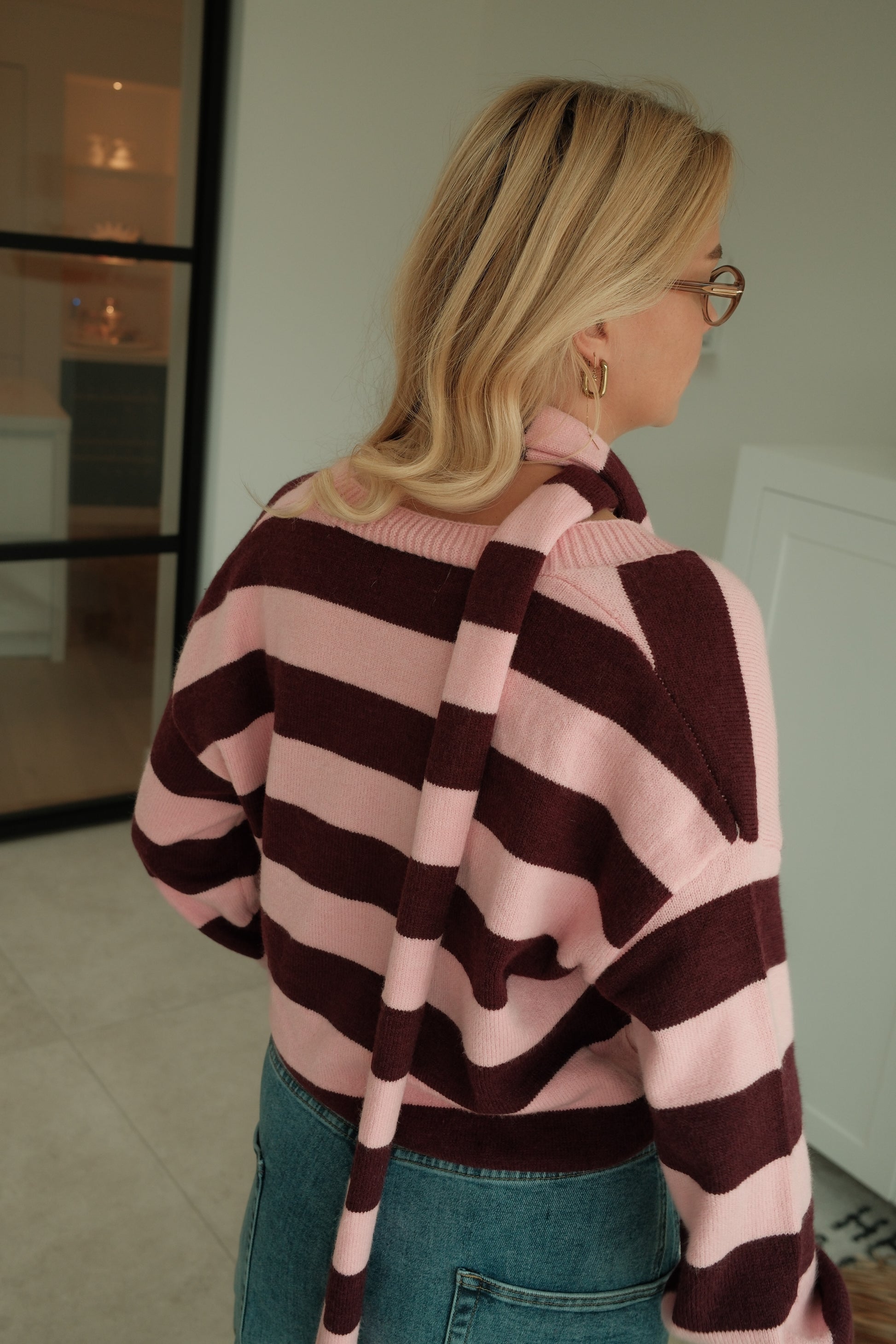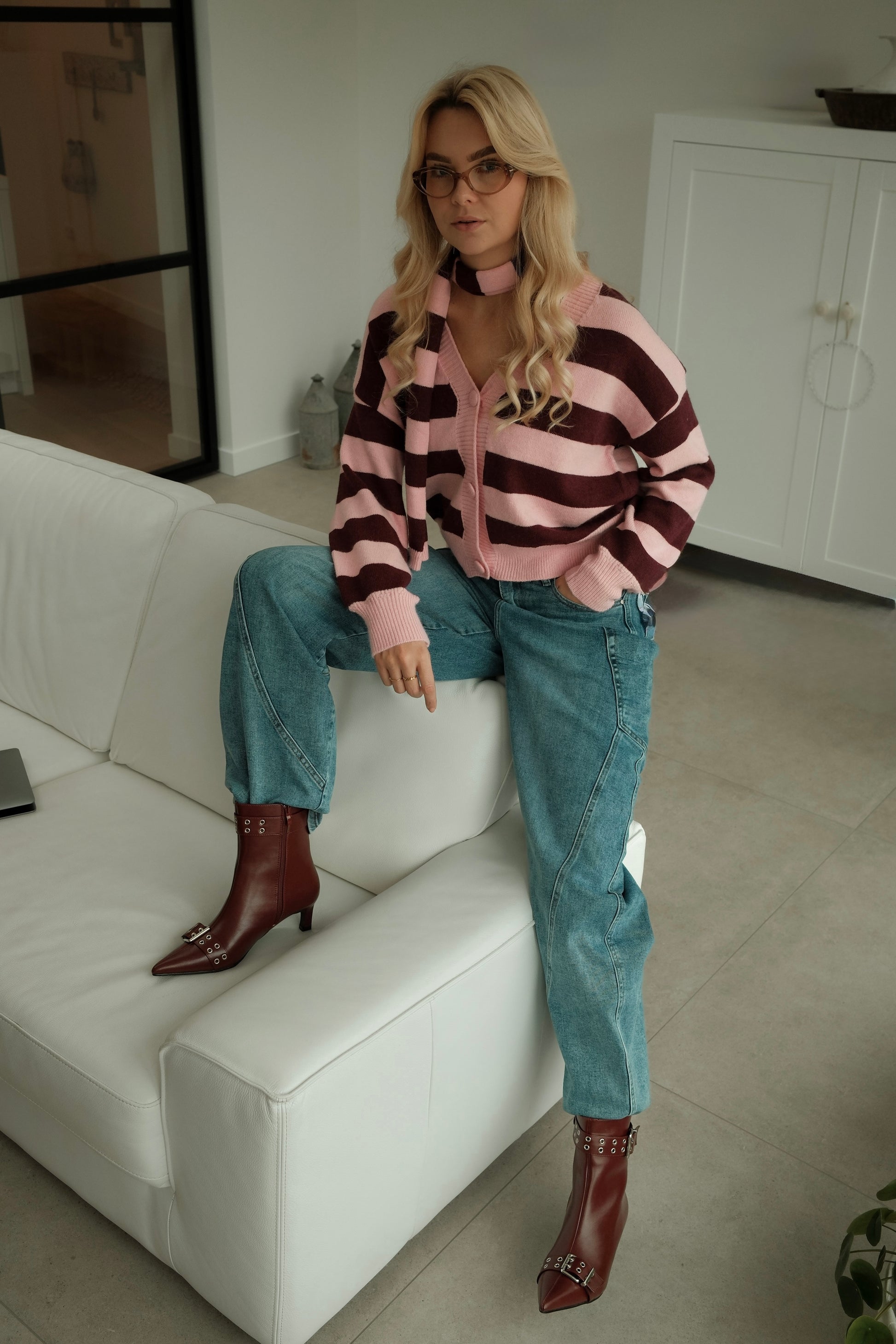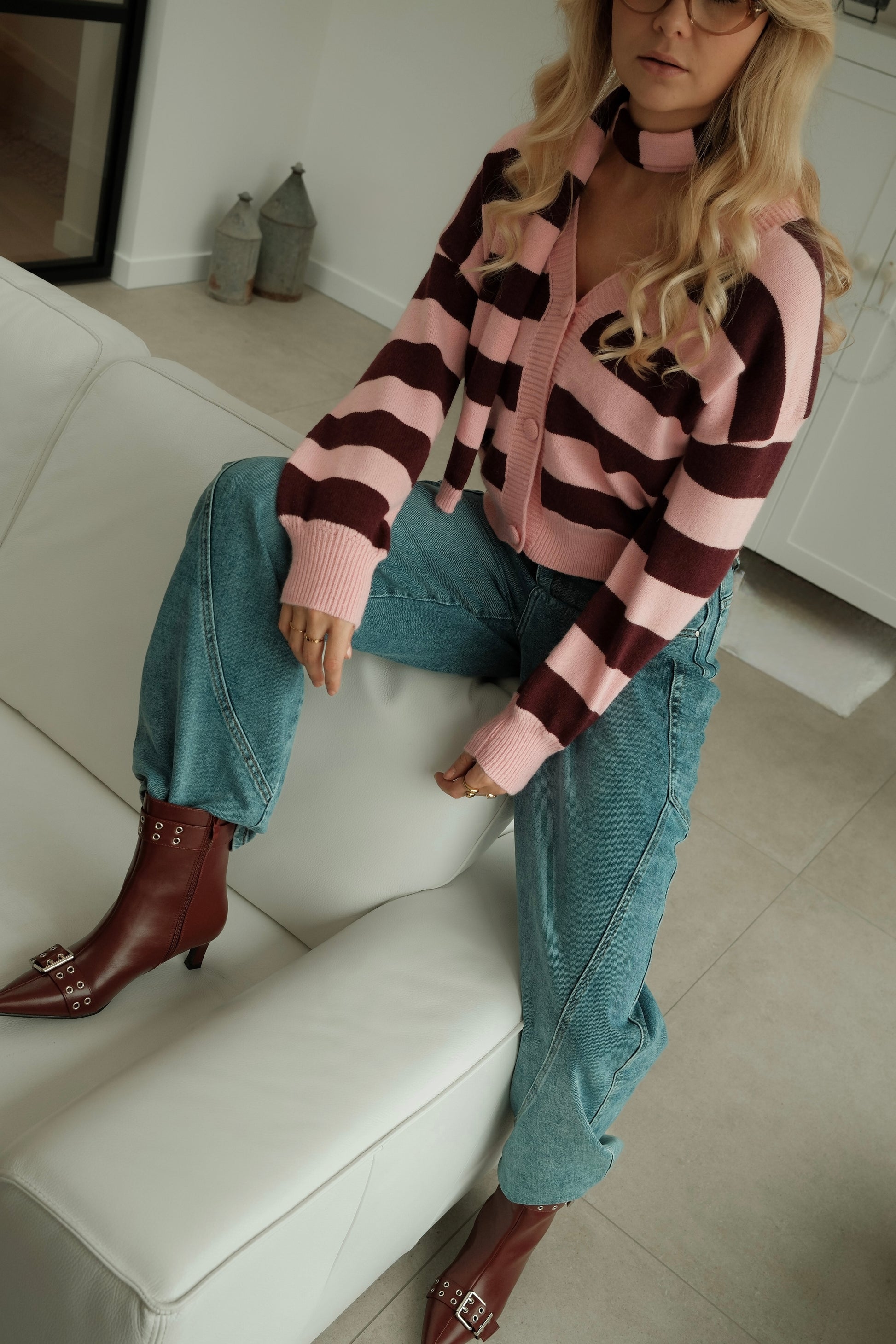 De Cardigan Knit Wave is een zachte knit met een warme, speelse uitstraling. Het golvende streeppatroon in roze en diepe bordeauxtinten geeft de cardigan een stijlvolle en moderne twist, terwijl het bijpassende losse sjaaltje zorgt voor extra warmte en veelzijdige styling. Comfortabel, vrouwelijk en perfect voor een moeiteloze everyday look.
