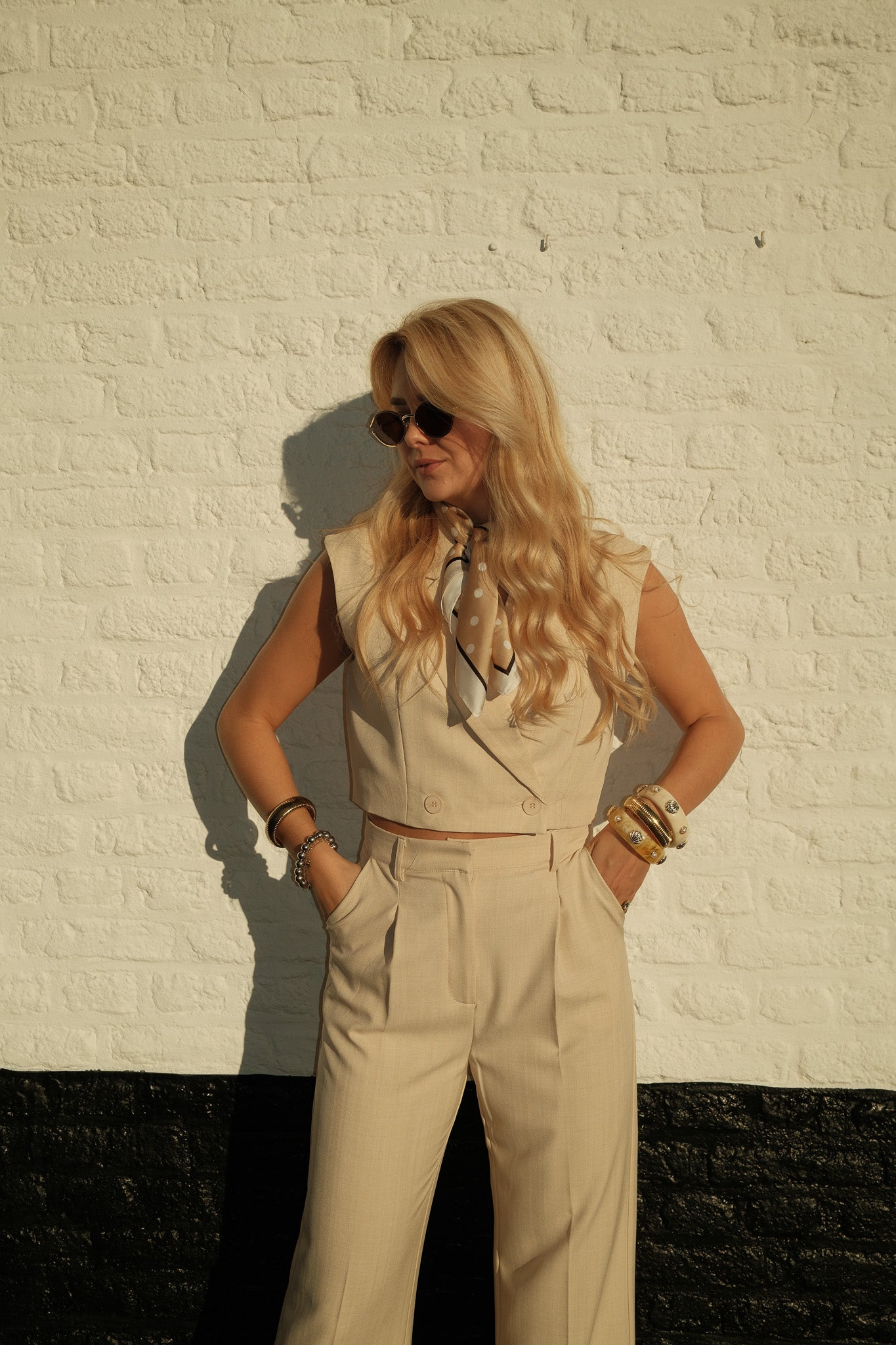 Deze stijlvolle Romy gilet beige combineert elegantie met een moderne uitstraling, perfect voor zowel zakelijke als casual gelegenheden. De cropped pasvorm en dubbele knoopsluiting geven de blazer een klassieke touch. Draag de Romy gilet met een bijpassende pantalon voor een complete outfit of combineer hem met een jeans voor een casual-chique look.