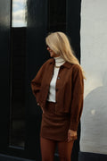 De Jasje suede Olivia - Bruin straalt elegantie en eenvoud uit. Het boxy jasje met knoopsluiting en rechte fit wordt stijlvol gecombineerd met een aansluitende mini skirt. De lichte stof geeft een verfijnde uitstraling en draagt comfortabel. Perfect om chic én modern voor de dag te komen.