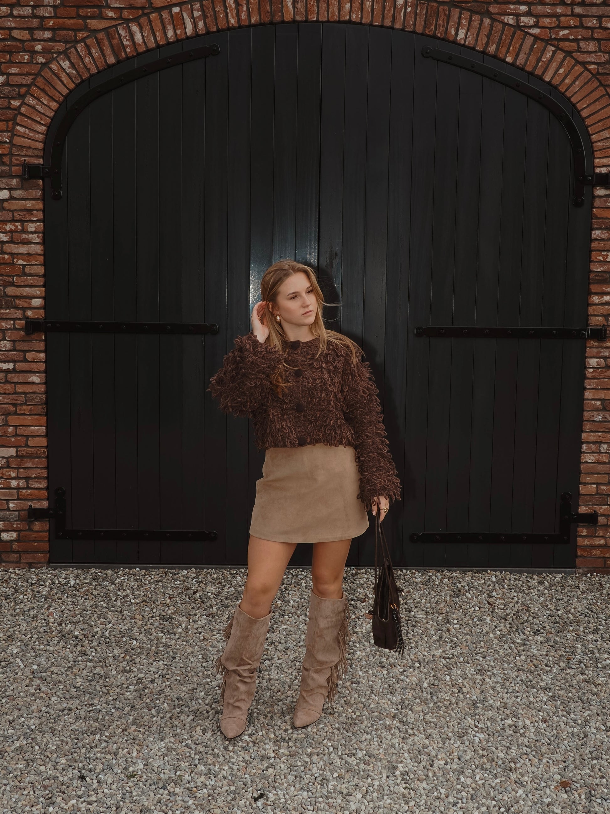 De Dava trui bruin statement knit in een bruine tint met een speels, lusachtig breipatroon. De grove textuur en ronde hals geven de Dava trui een unieke, handgemaakte uitstraling. Perfect om te dragen op een jeans of rok voor een cozy, maar opvallende look.