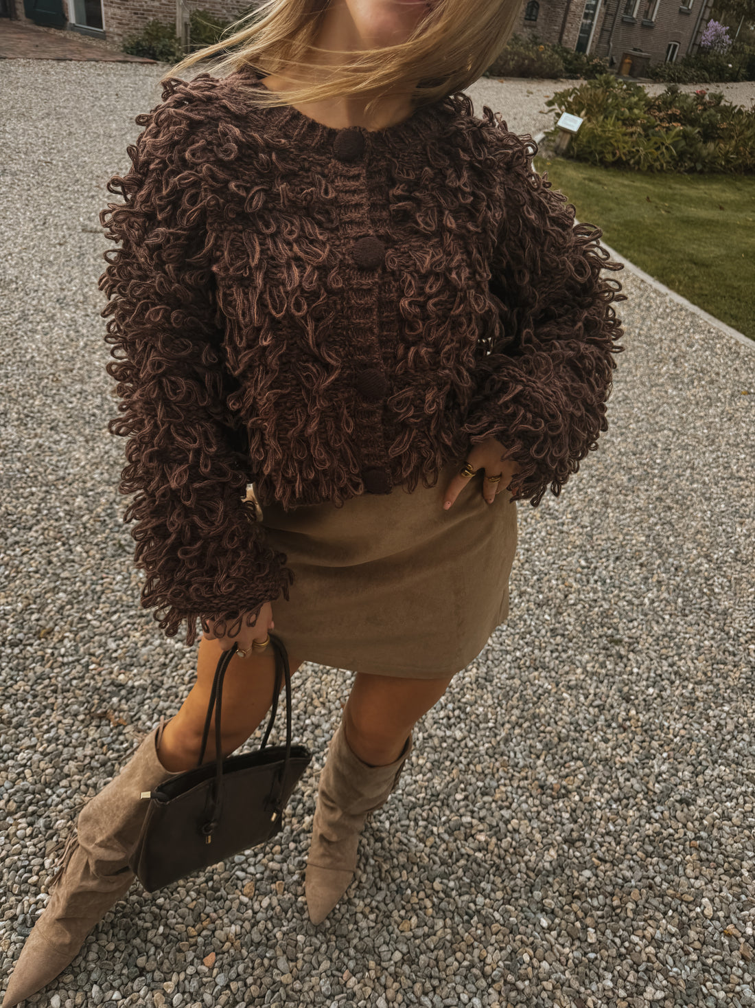 De Dava trui bruin statement knit in een bruine tint met een speels, lusachtig breipatroon....
