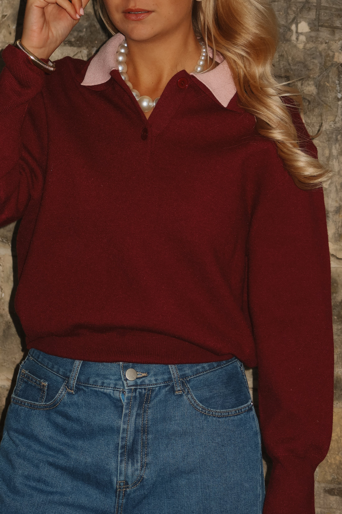 De Runa polo is een knit met klassieke kraag en knoopsluiting in een rijke bordeaux...