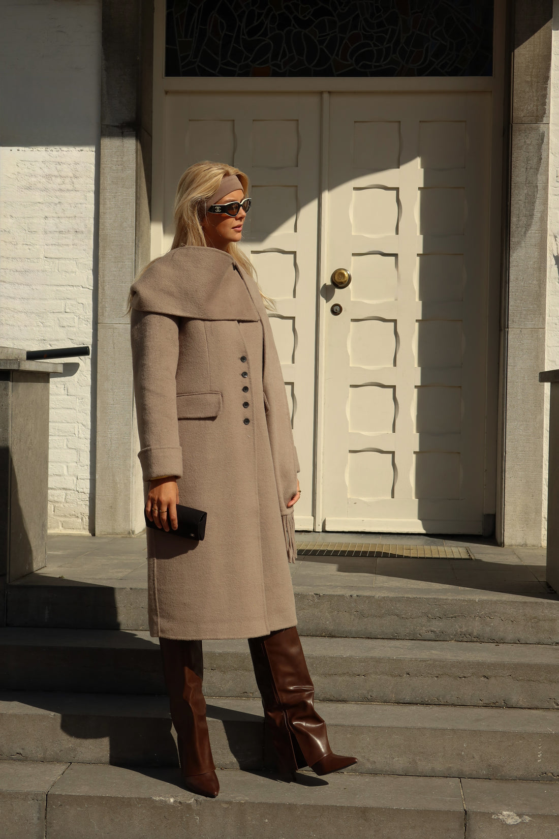 De Jas Veni in beige is een elegante lange mantel met een zachte wollen look....