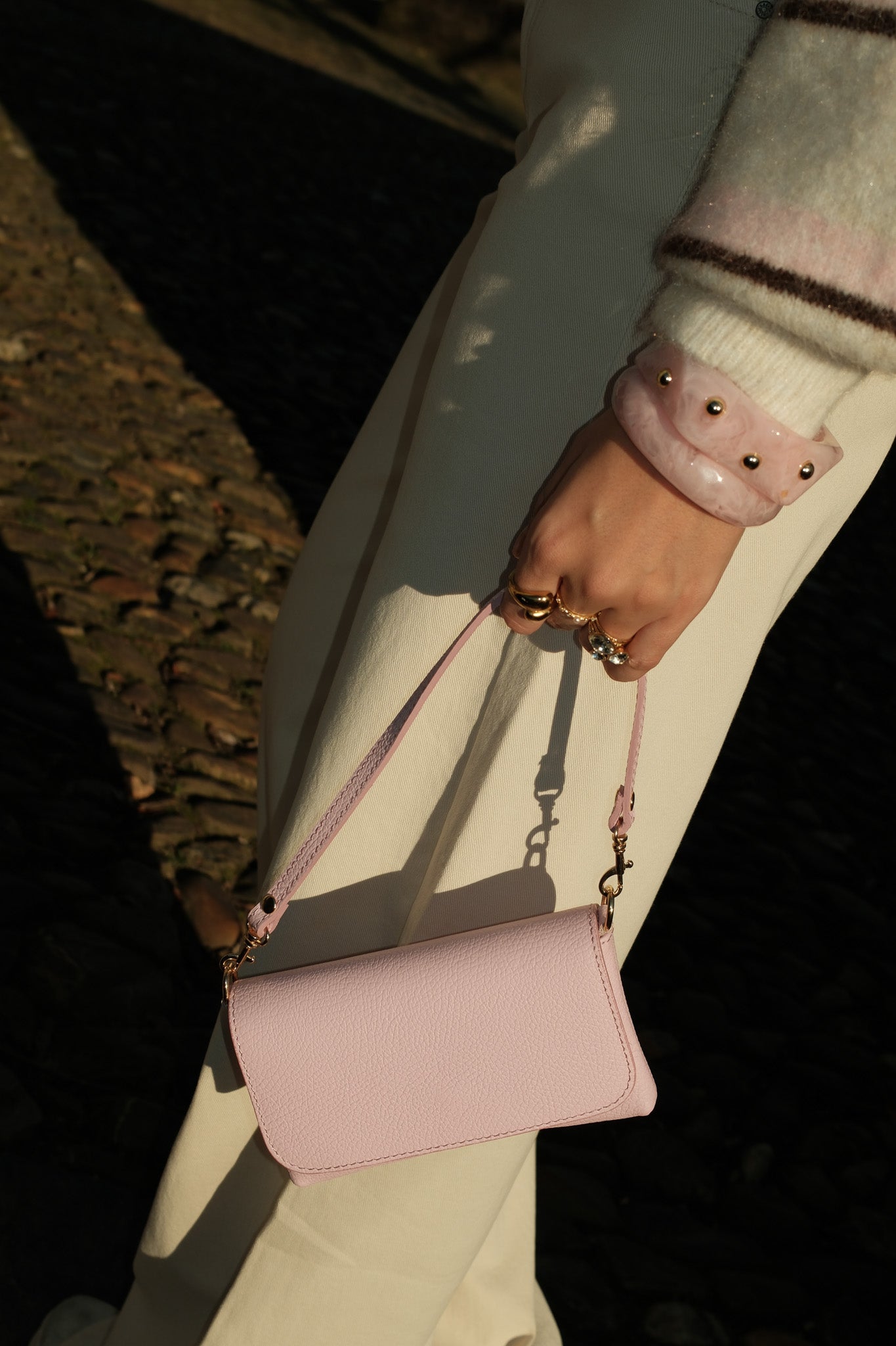 De Rosa bag is een verfijnde, compacte schoudertas in een zachte lichtroze tint. Het fijne, licht generfde materiaal geeft een luxe uitstraling, terwijl de strakke klep en goudkleurige details zorgen voor een elegante touch. Dankzij het slanke formaat draag je haar moeiteloos crossbody of als schoudertas voor een vrouwelijke, stijlvolle look. Perfect voor een dagje uit, een diner of als subtiele eyecatcher bij je favoriete knit.