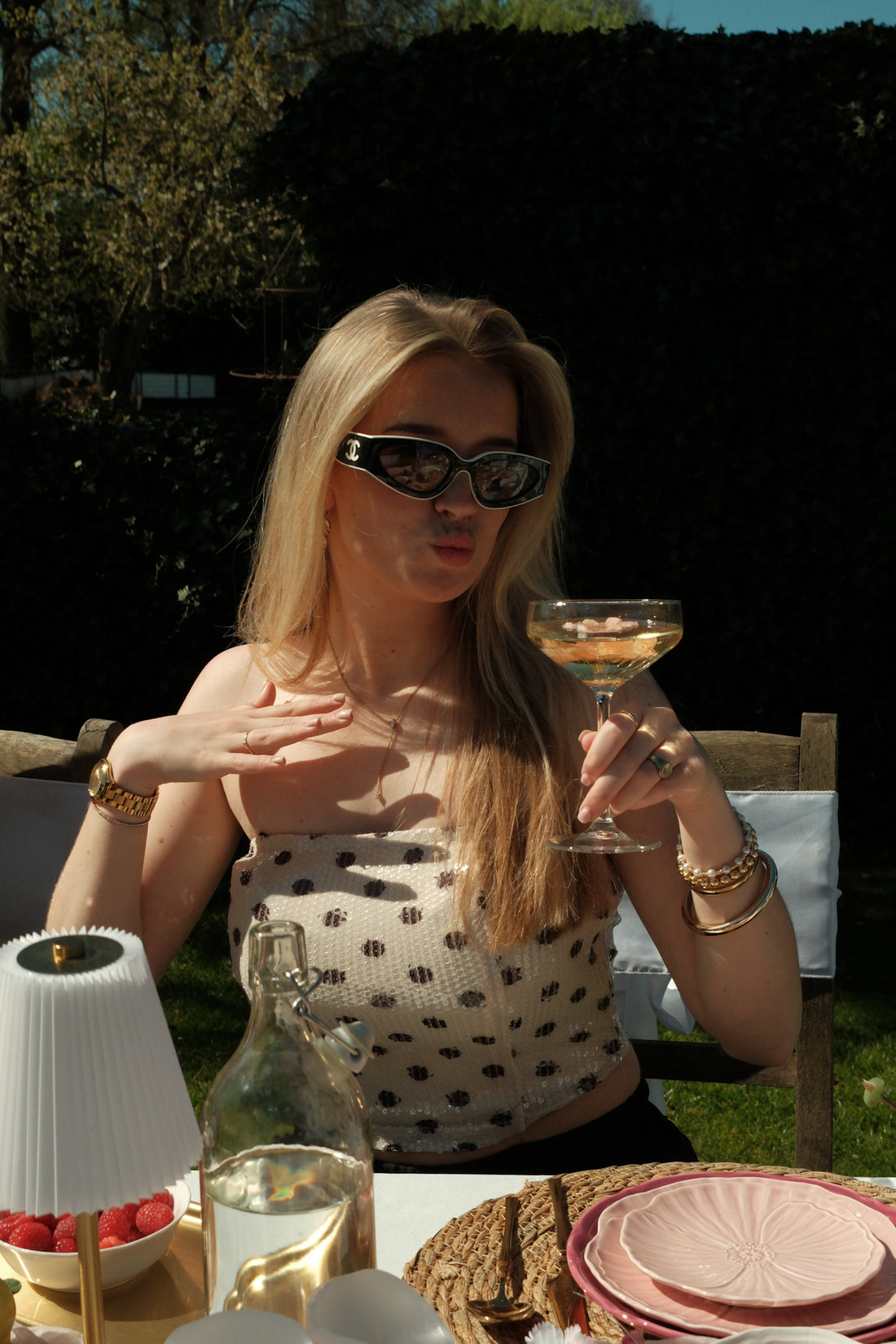 De Savi top beige is een sprankelende, cropped top die elegantie en speelsheid moeiteloos combineert....