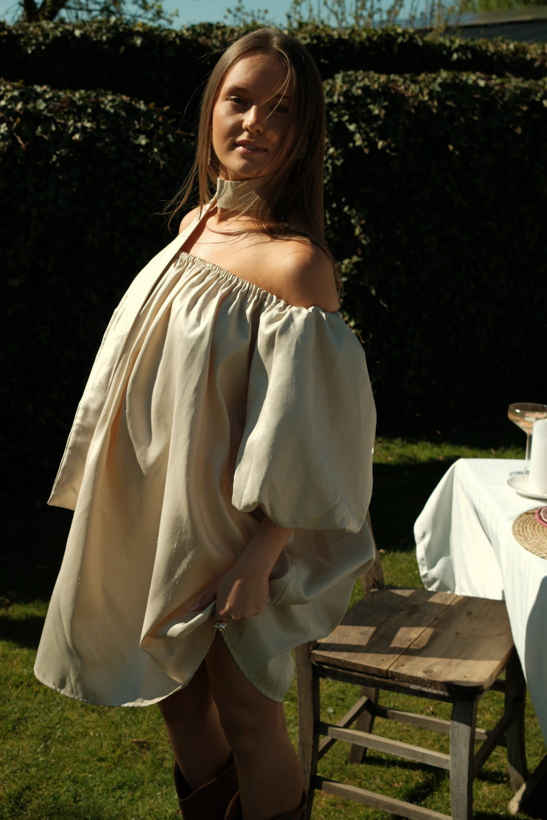 De Jurk Lynn in beige is een vrouwelijke off-shoulder jurk met een satijnen glans en...