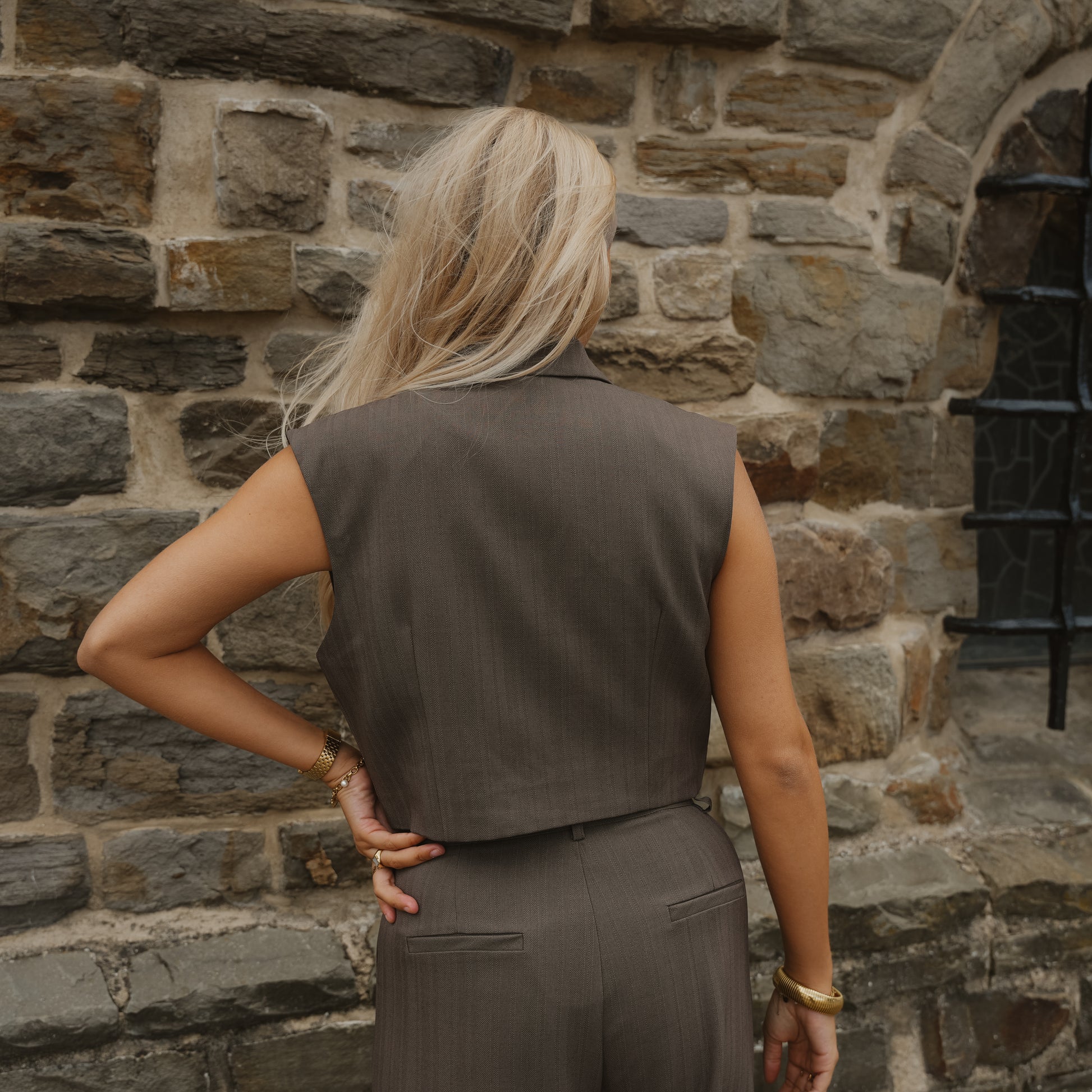 Deze stijlvolle Romy gilet coffee combineert elegantie met een moderne uitstraling, perfect voor zowel zakelijke als casual gelegenheden. De cropped pasvorm en dubbele knoopsluiting geven de blazer een klassieke touch, terwijl de bordeaux kleur zorgt voor een verfijnde look. Draag de Romy gilet met een bijpassende pantalon voor een complete outfit of combineer hem met een jeans voor een casual-chique look.