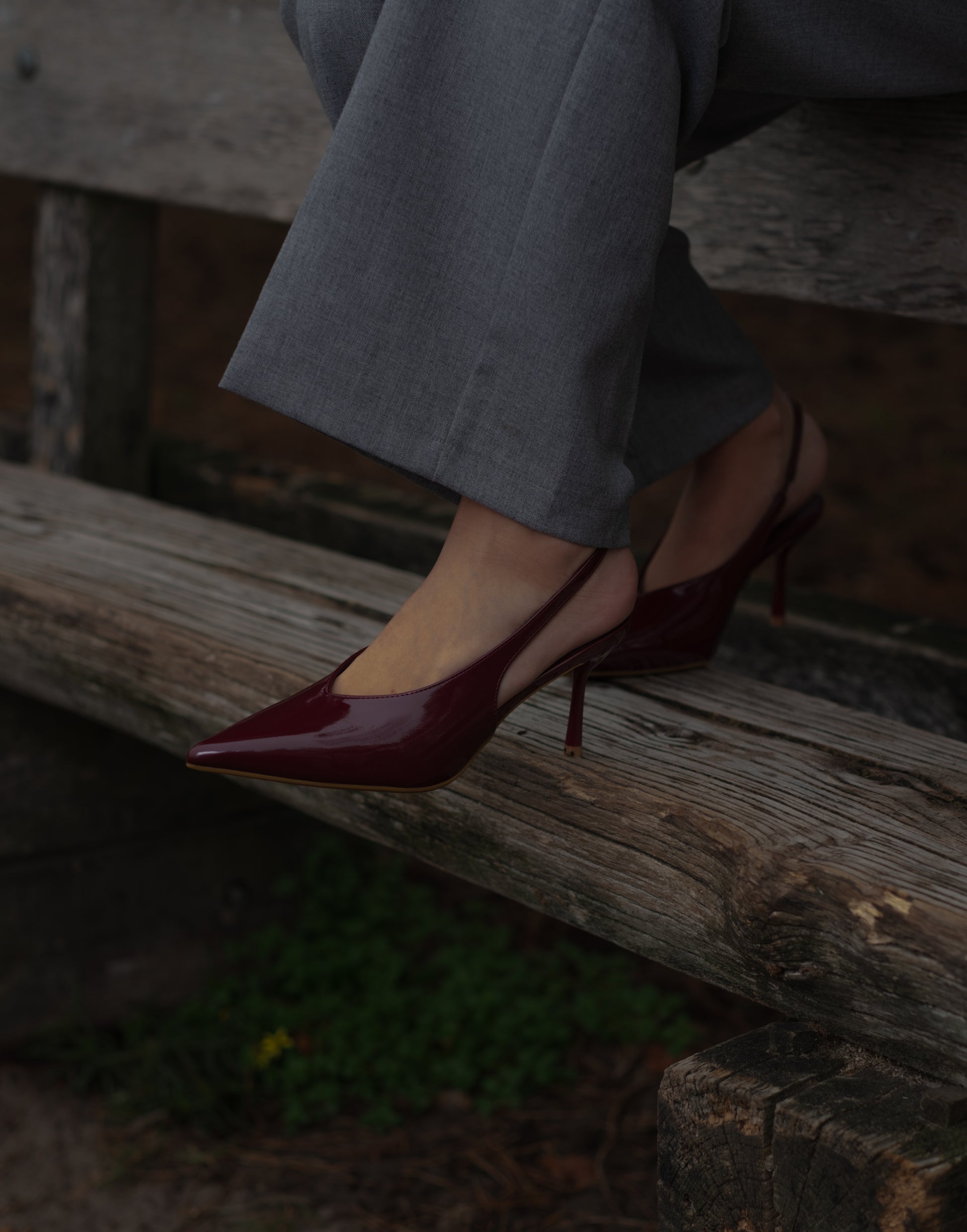 Het Hakje Coco is elegantie in haar puurste vorm. De diepe wijnrode kleur en glanzende lakafwerking geven deze slingback een chique, vrouwelijke uitstraling. De spitse neus en subtiele hak zorgen voor een sierlijke look die zowel klassiek als modern aanvoelt. Perfect voor feestelijke gelegenheden of om je dagelijkse outfit een stijlvolle boost te geven!