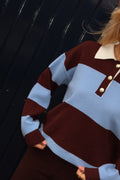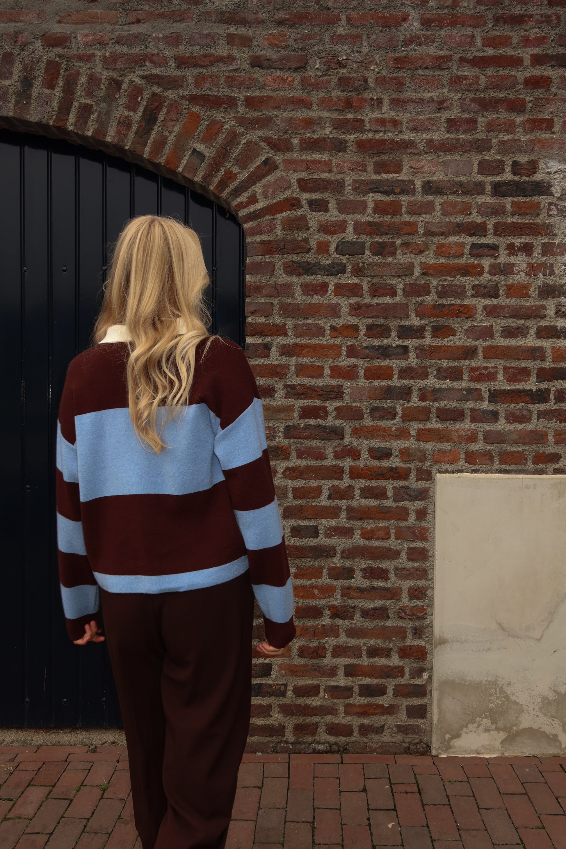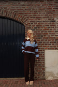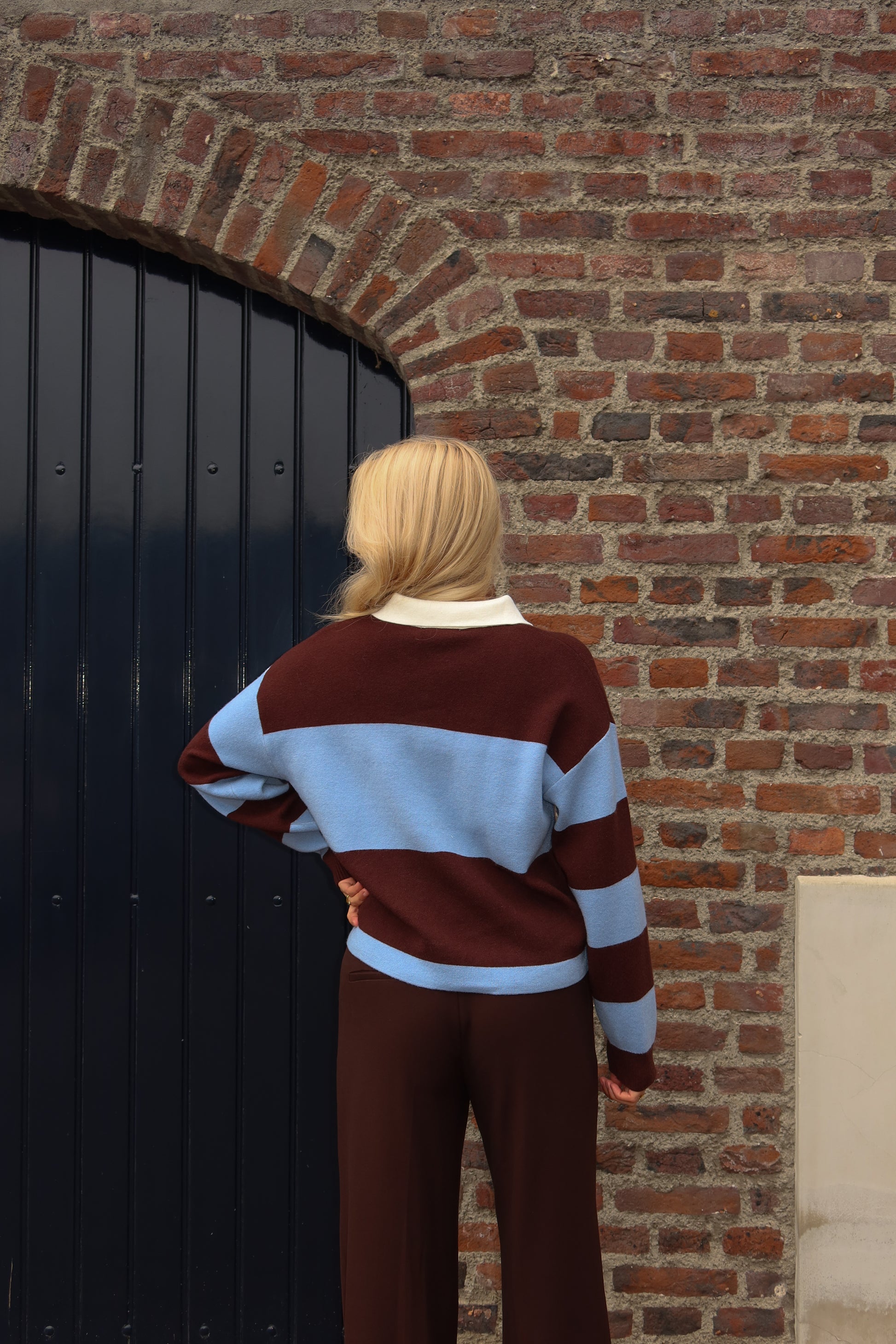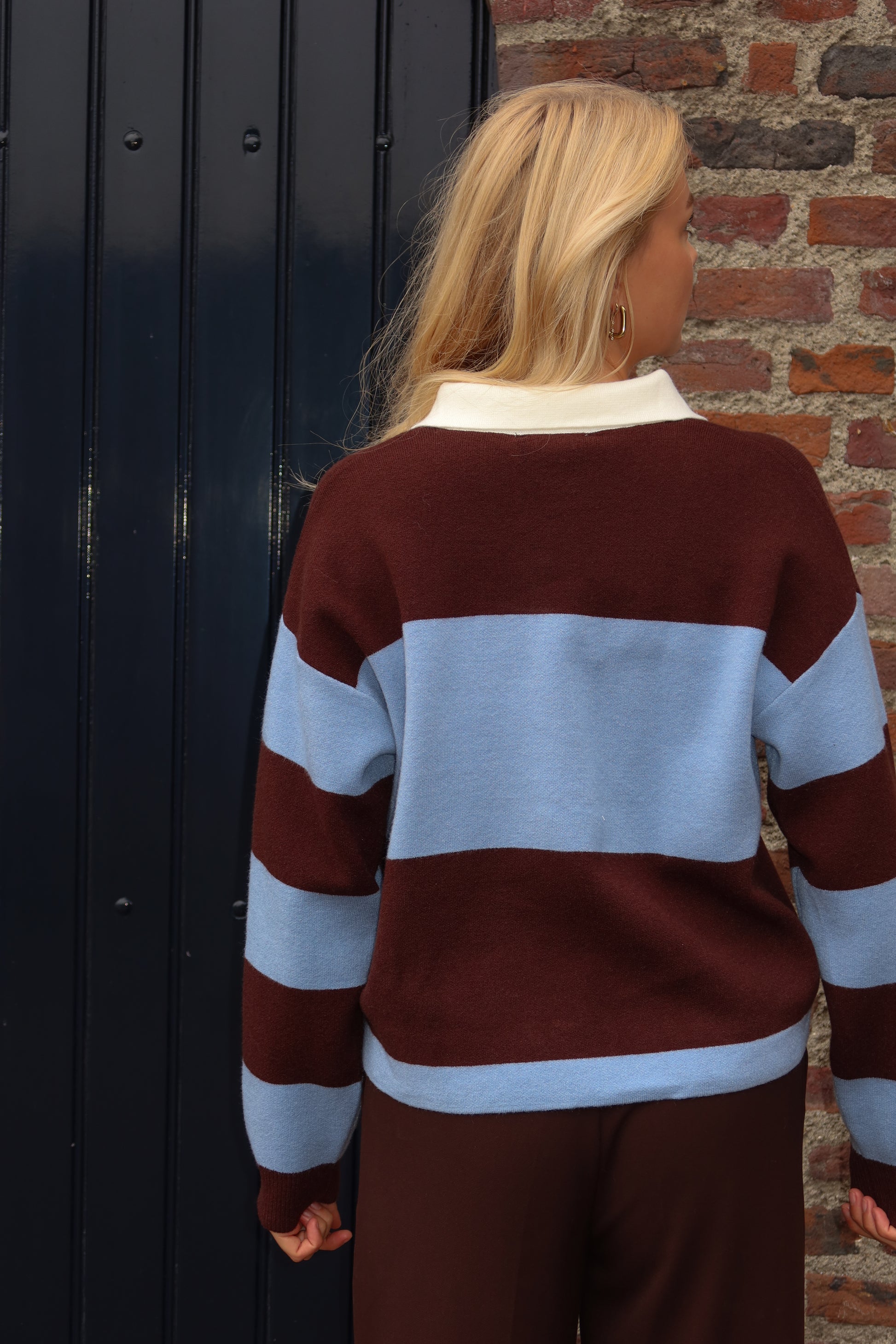 De Polo Bonny blauw combineert sportieve charme met een vrouwelijke twist. De brede strepen in chocoladebruin en blauw zorgen voor een frisse, moderne look, terwijl de contrasterende kraag en gouden knoopdetails een elegante touch toevoegen. De zachte, gebreide stof maakt Bonny comfortabel én stijlvol