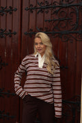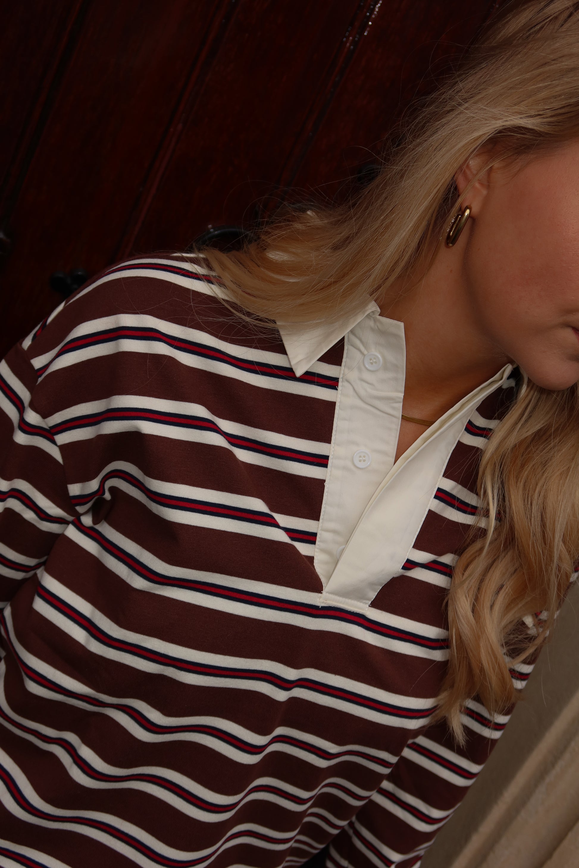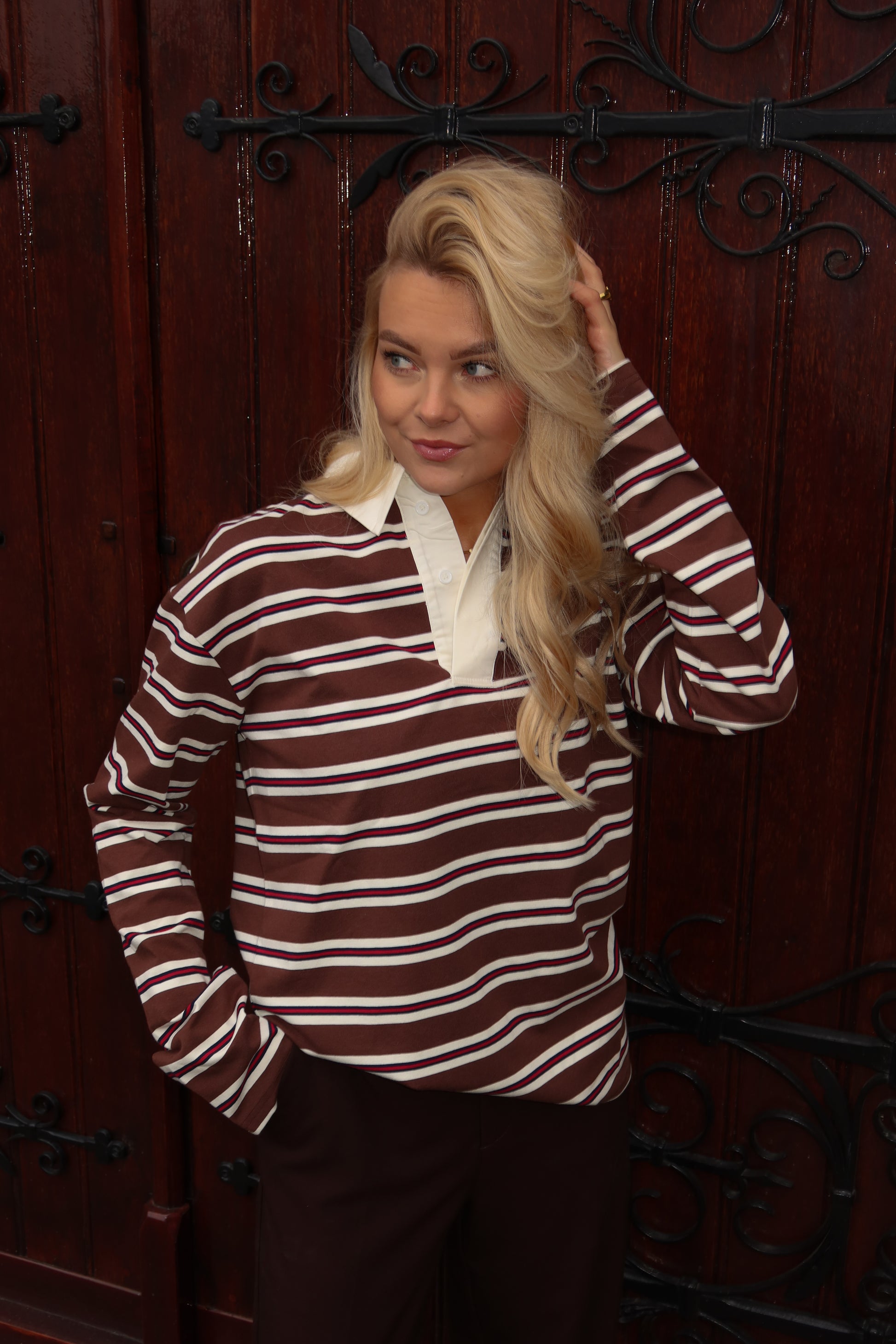 De Frost polo is een sportieve en stijlvolle top met een tijdloos streepdesign in chocoladebruine, crème- en navytinten. De contrasterende witte kraag en knoopsluiting geven een frisse, preppy touch. Gemaakt van een zachte katoenblend die comfortabel aanvoelt en mooi van vorm blijft. De relaxte pasvorm maakt de Frost polo ideaal voor zowel casual als geklede looks.
