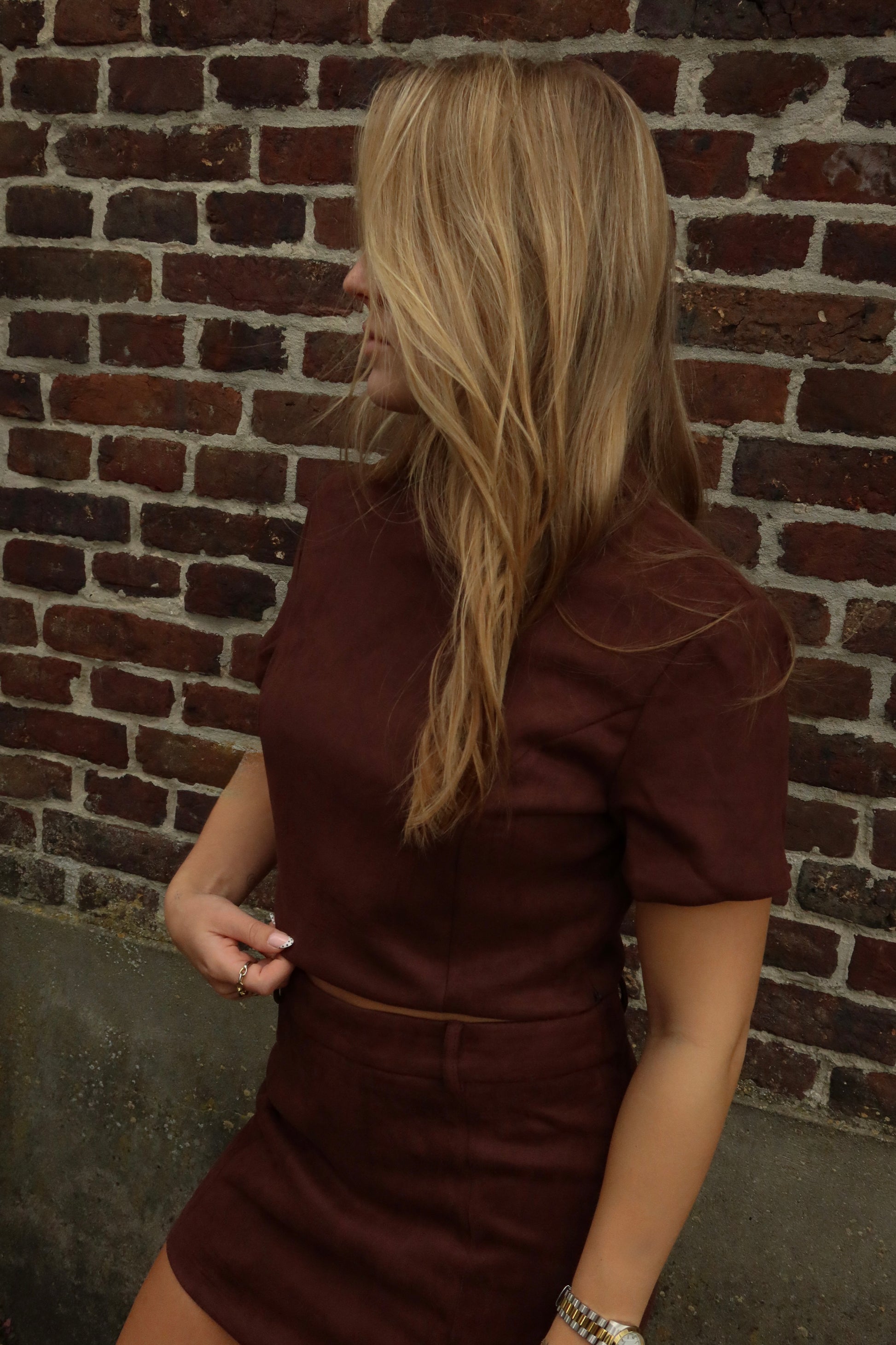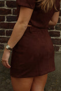 De Rok Mikky in bruin is een aangesloten mini-rok van zachte suèdelook. Het hoge taillemodel zorgt voor een vrouwelijke fit en laat zich moeiteloos combineren met de bijpassende top of een eenvoudige blouse voor een chique, maar speelse look.