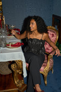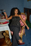 De Yas top zwart is een echte eyecatcher met een feestelijke, maar stijlvolle uitstraling. De glanzende, gelaagde stof creëert een speels volume dat mooi meebeweegt bij elke stap. De subtiele glitters zorgen voor een luxe, avondwaardige look, terwijl de dunne bandjes de top een verfijnde touch geven. Perfect voor een diner, feest of avondje uit