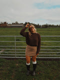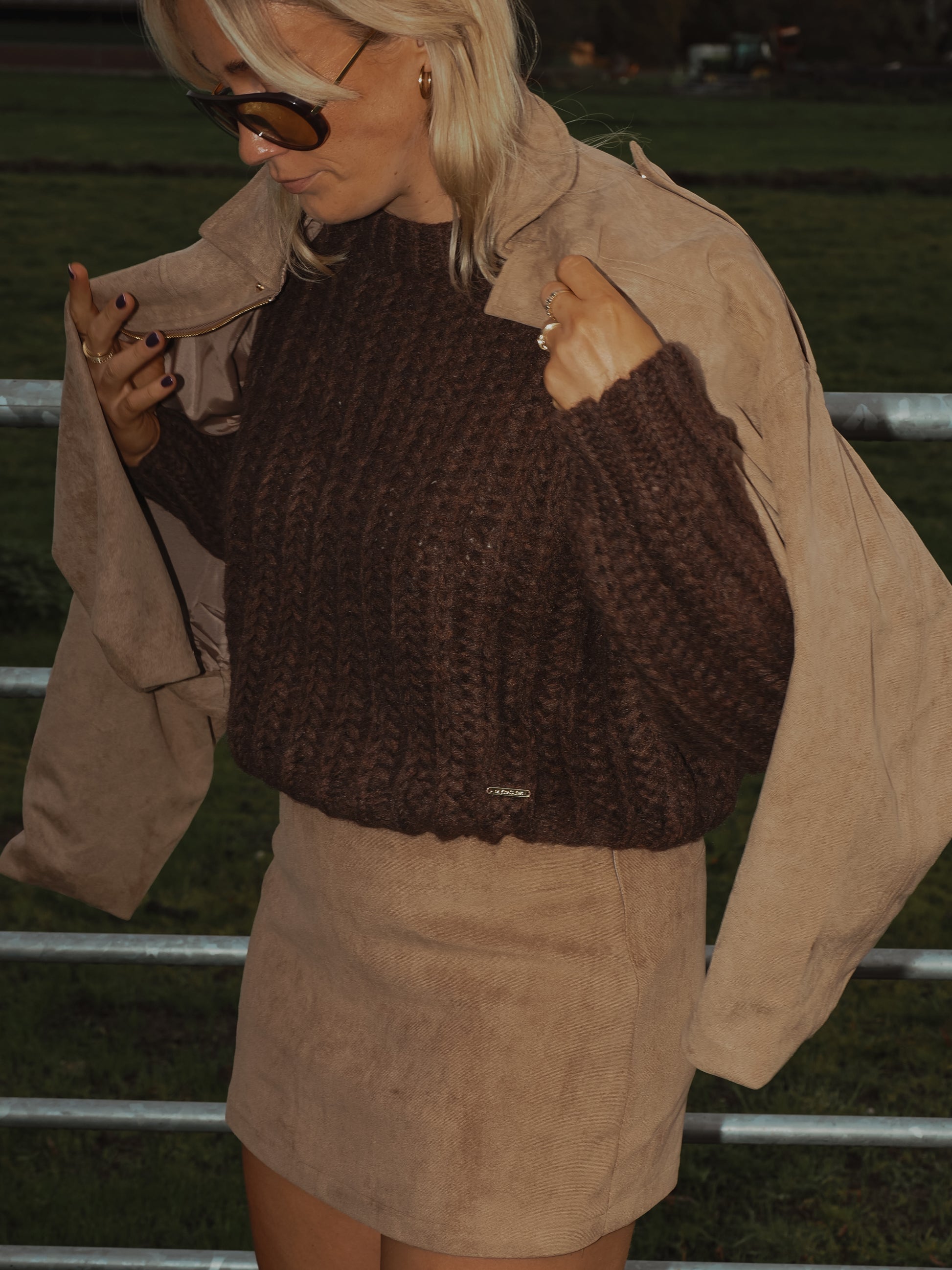De Lau trui bruin zachte chunky knit trui in een diepe chocoladebruine kleur. De grove steek en hoge hals geven een warme, cozy uitstraling, perfect voor koude dagen. Combineer de Lou trui met jeans of een rok voor een nonchalante, stijlvolle herfstlook.