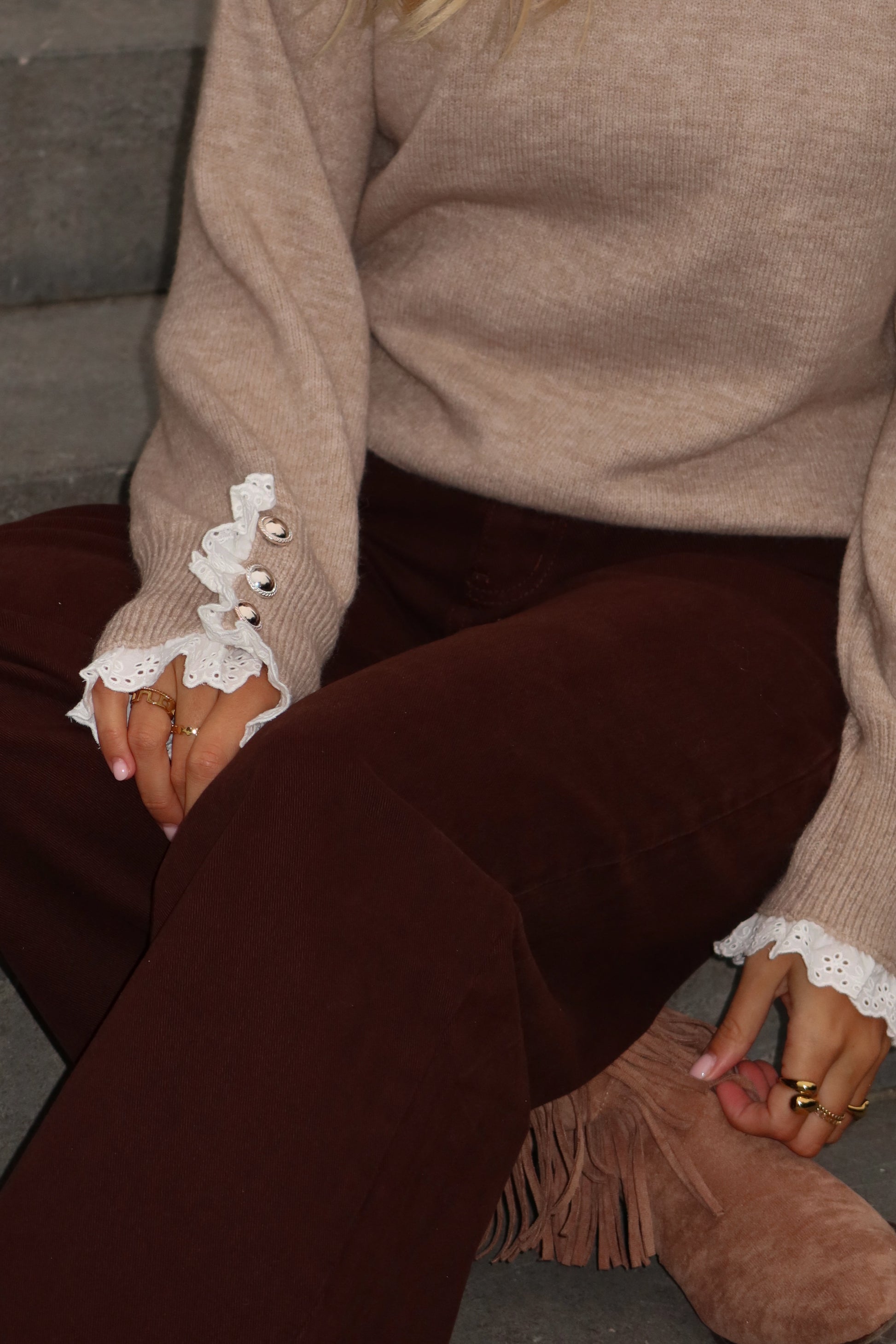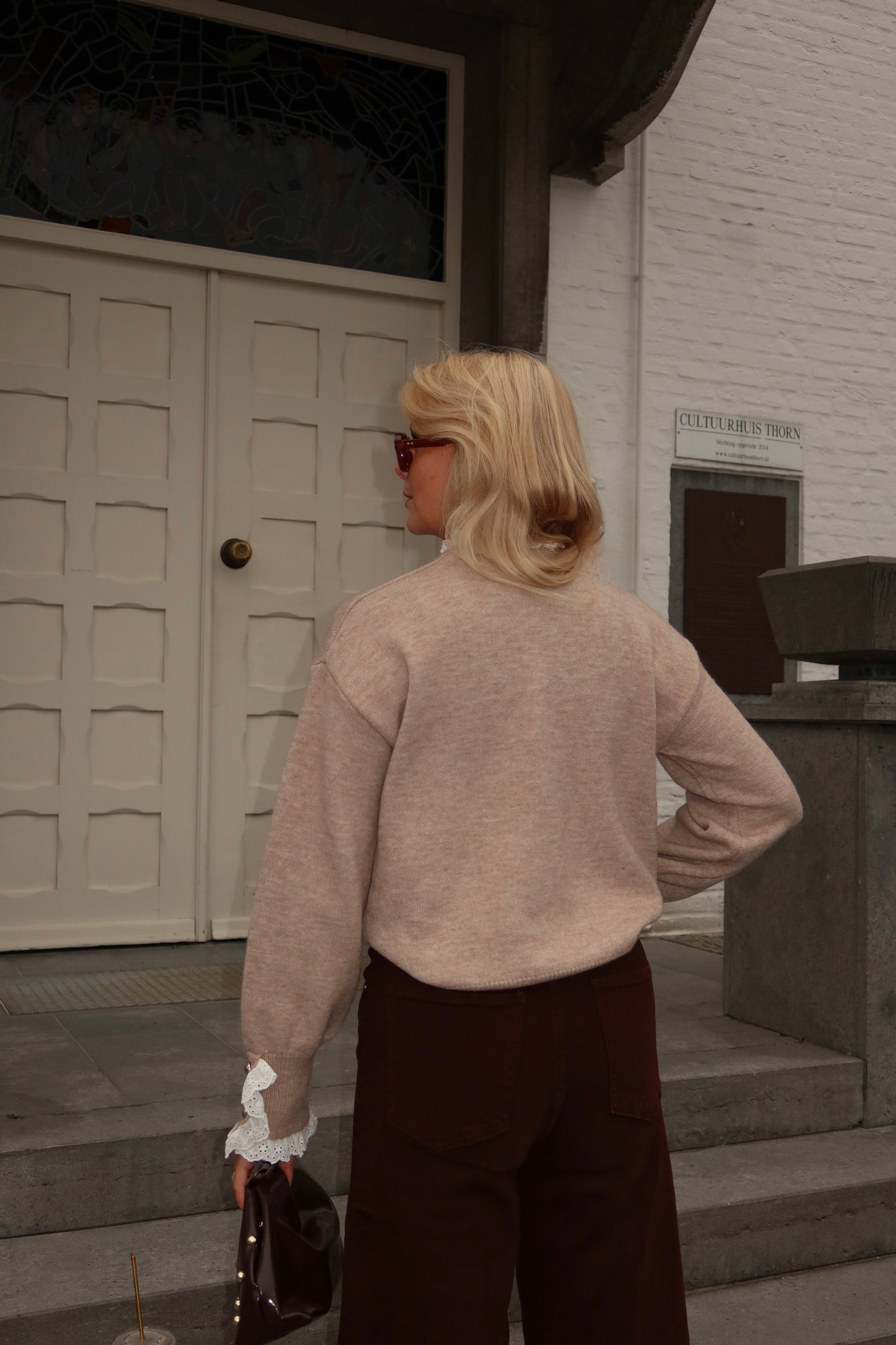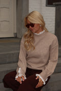 De Pinot trui in taupe is een elegante basic met een speelse twist. De zachte taupekleur maakt hem tijdloos en veelzijdig, terwijl de details aan de mouwen – afgewerkt met romantische kanten ruches en knoopaccenten – zorgen voor een vrouwelijke en unieke uitstraling.