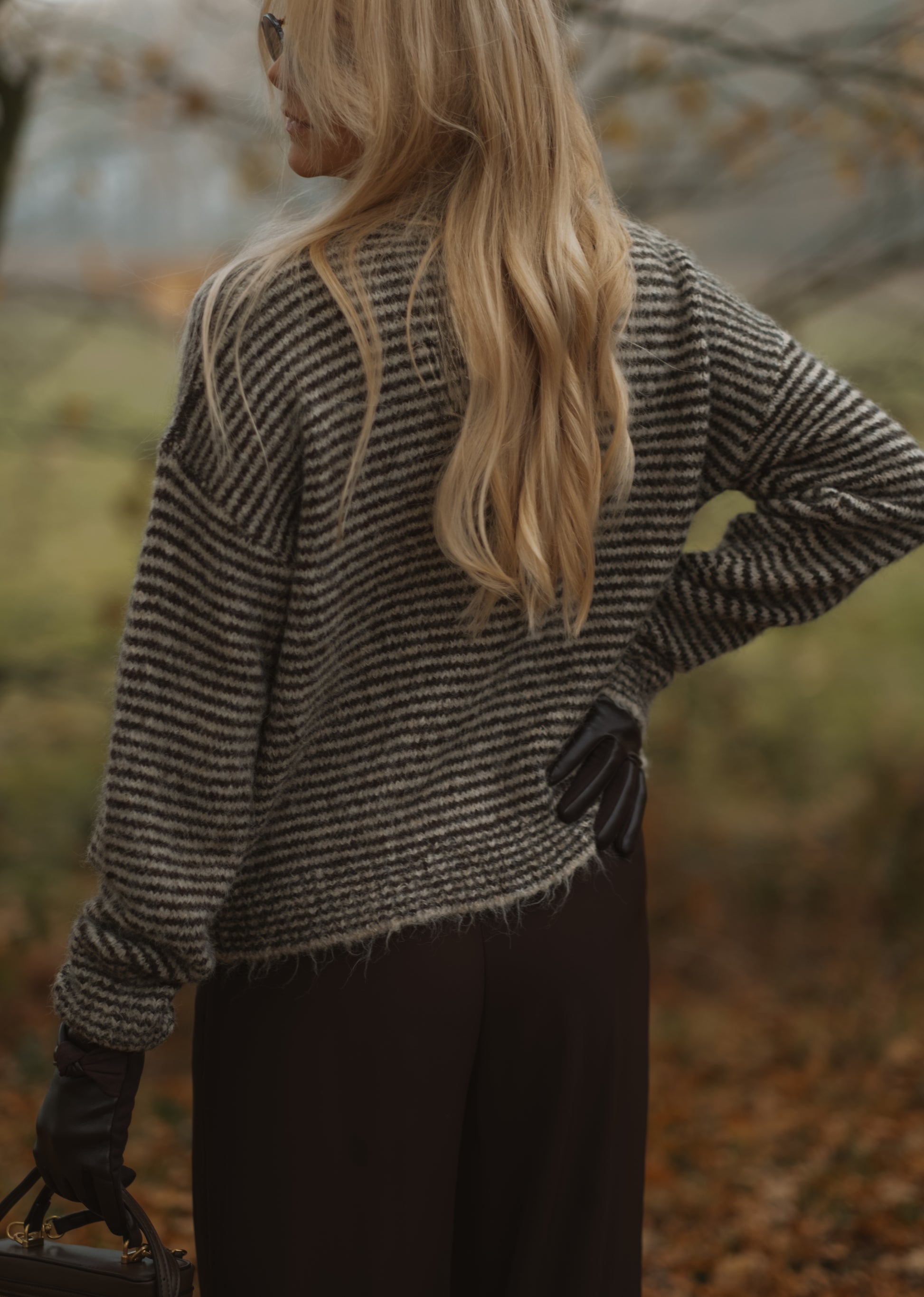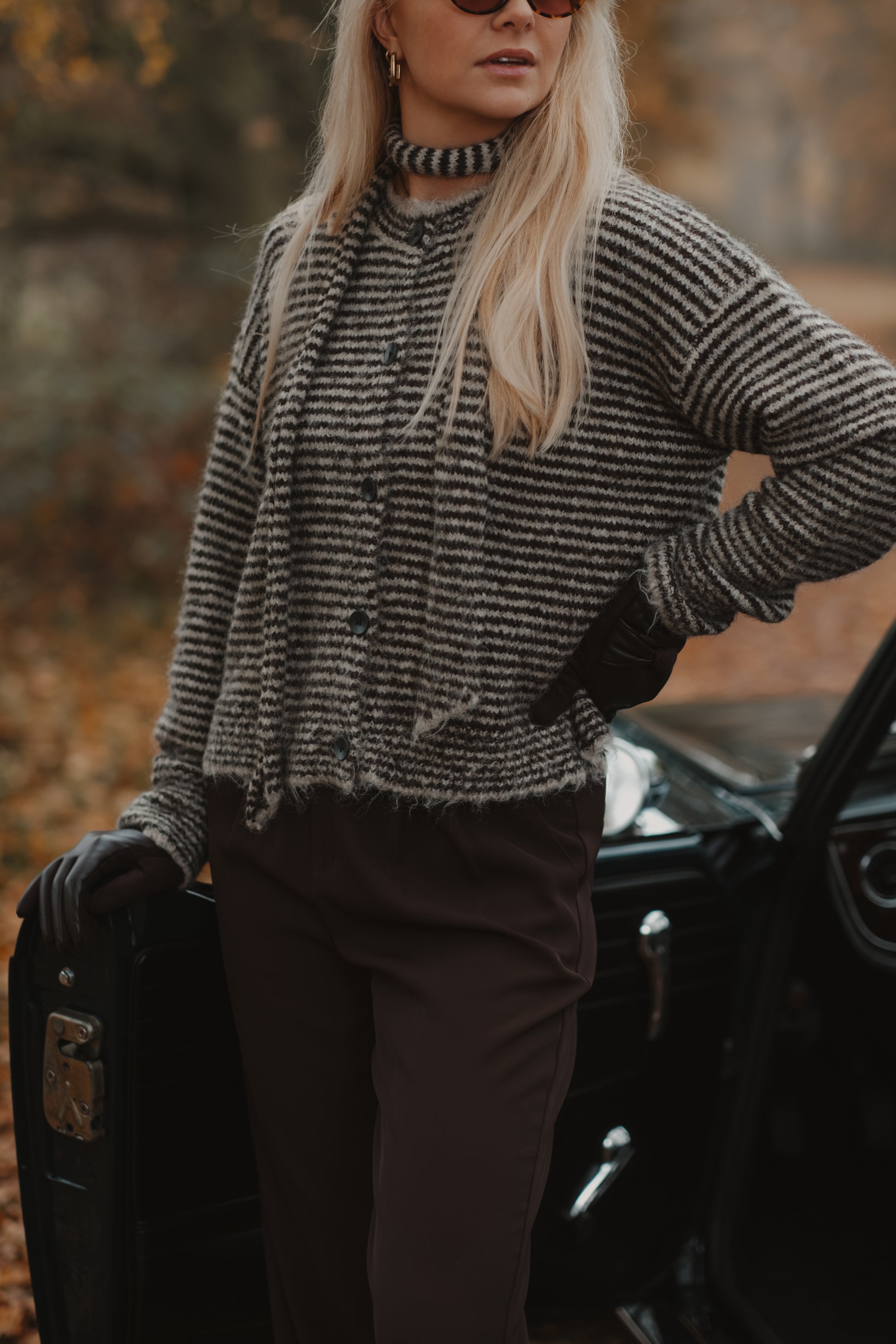 De Wavy trui bruin/creme deze speelse knit combineert zachte bruine en creme strepen voor een nonchalante, eigentijdse look. De losse pasvorm en lange ceintuur geven de trui een unieke twist, perfect om zowel open als dicht te dragen. Ideaal voor een comfortabele maar stijlvolle outfit met een vleugje retro.