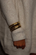 De Vina armband is een echte eyecatcher die elke look een chique upgrade geeft. De brede, spiraalvormige structuur zorgt voor een moderne en krachtige uitstraling, terwijl de goudkleur een luxe touch toevoegt. Draag de Vina solo voor een subtiel statement of combineer meerdere armbanden voor een bold effect. Perfect te matchen met zachte knitwear of een stijlvolle avondlook.
