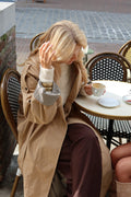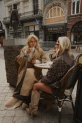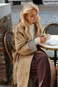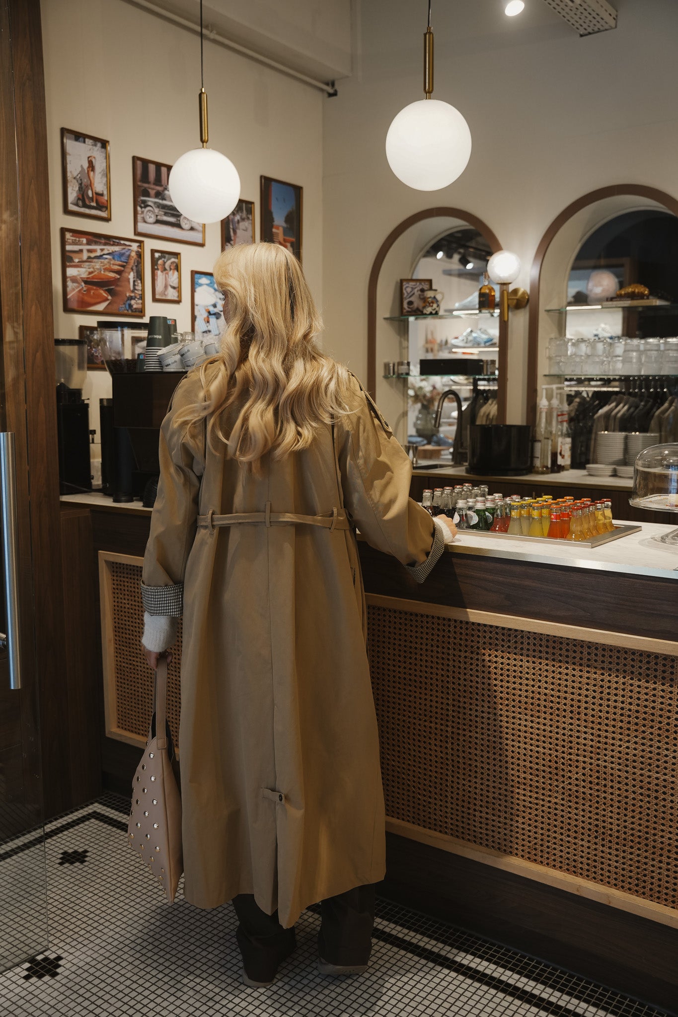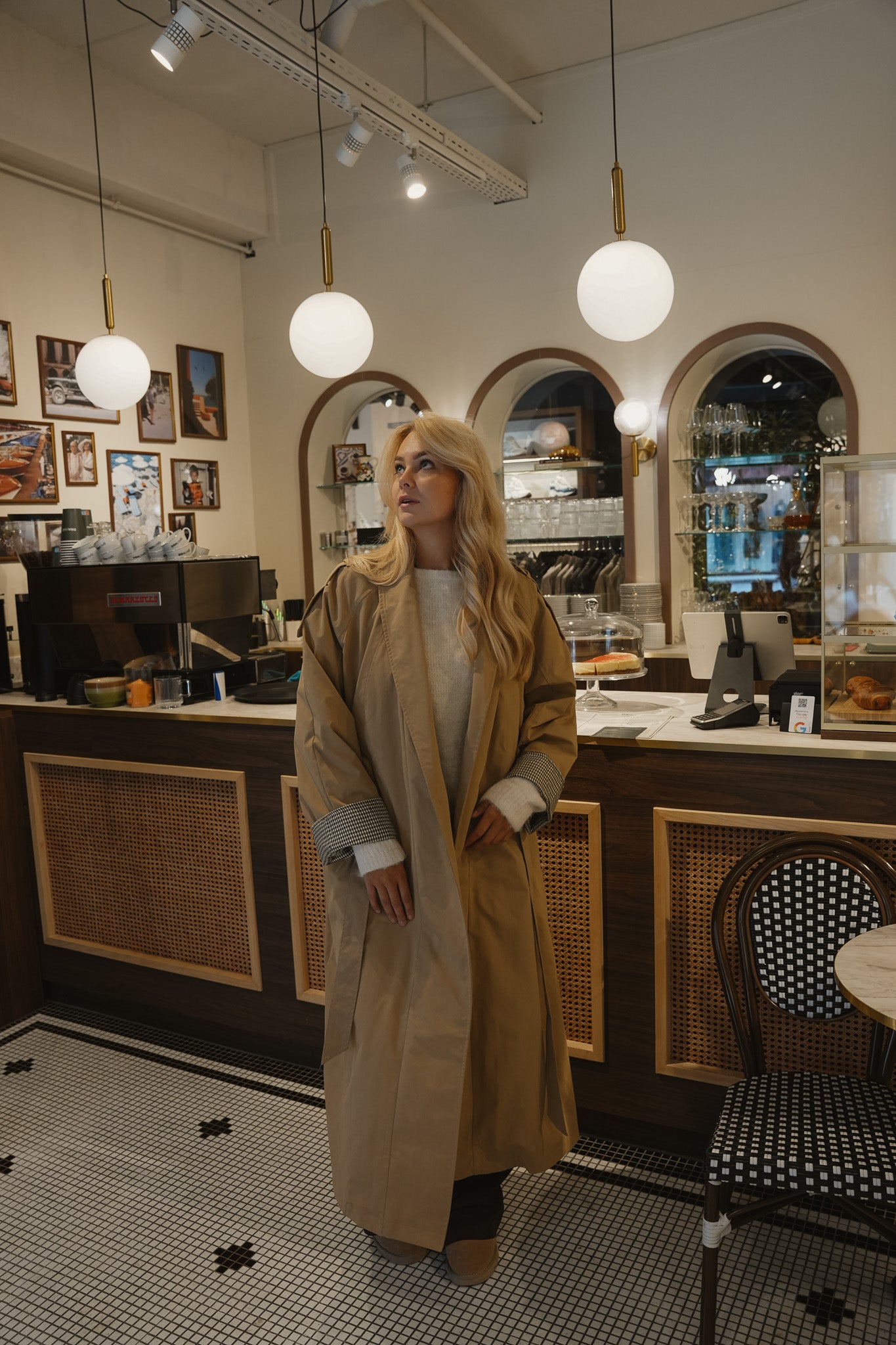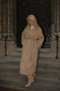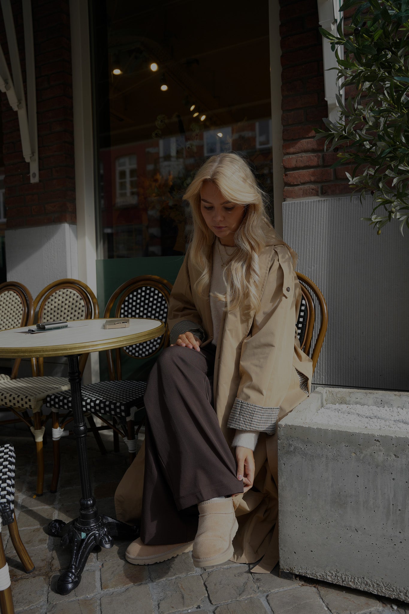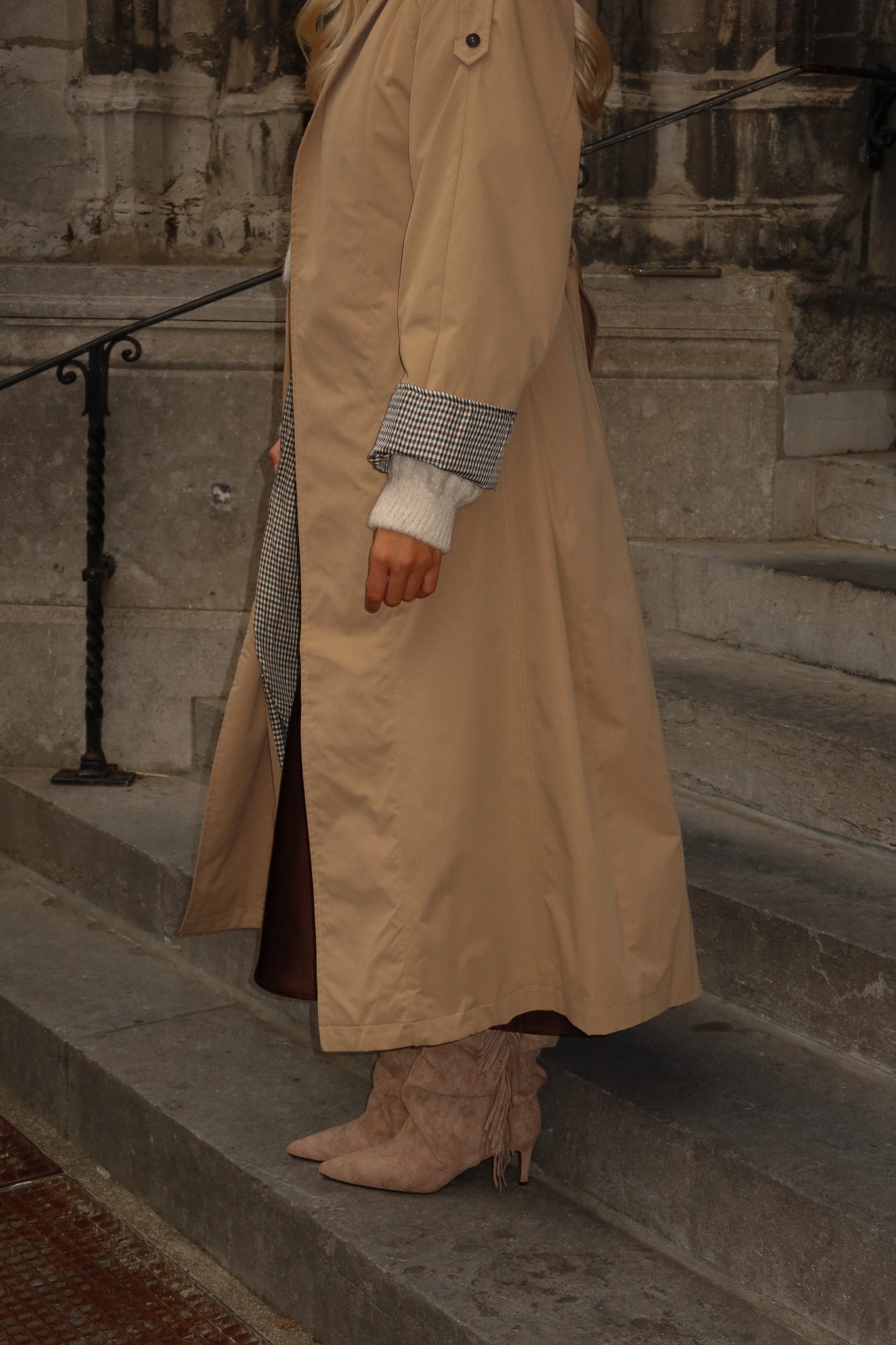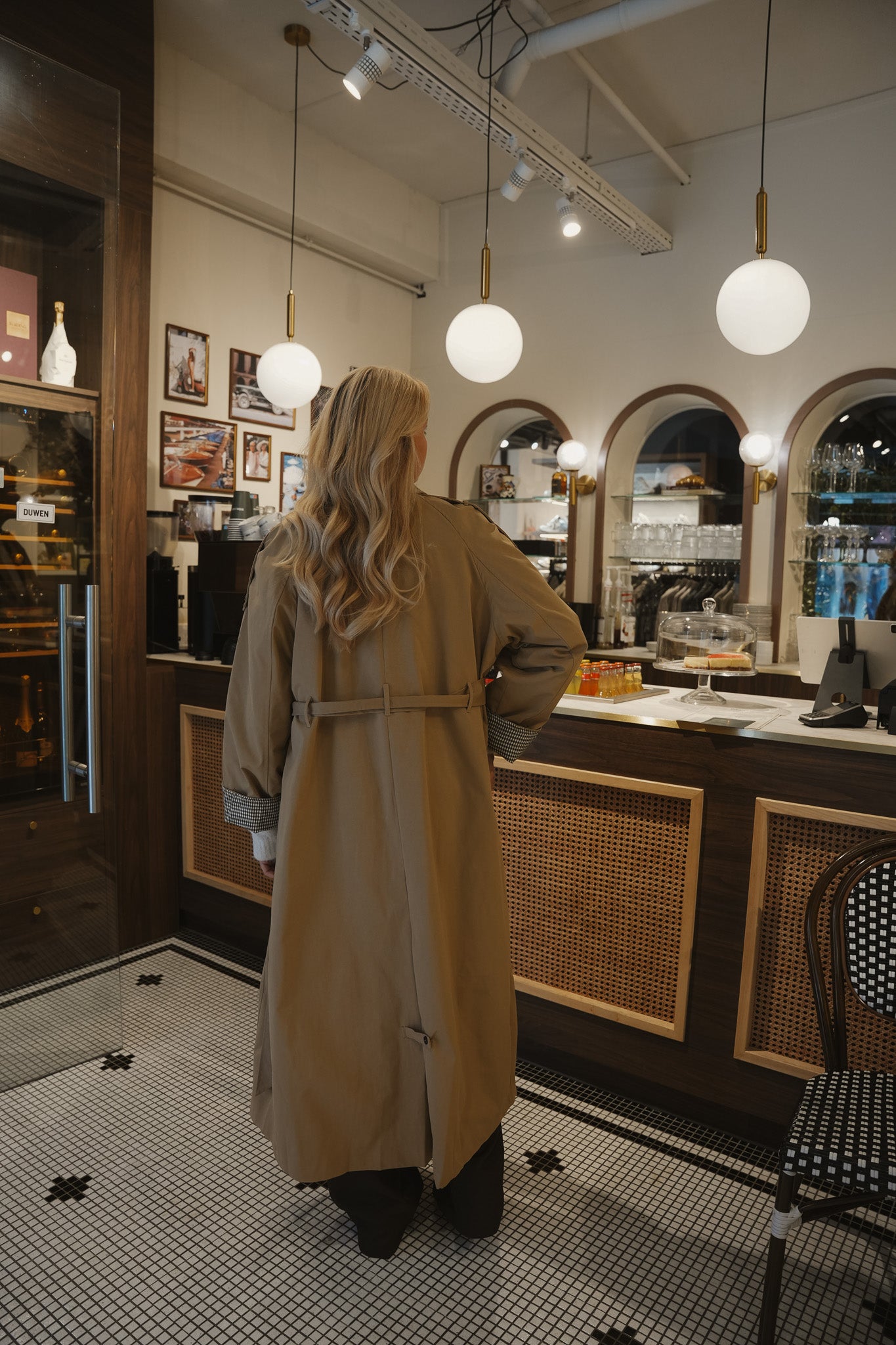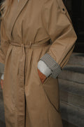 De Moya jas is een tijdloze trenchcoat met een moderne twist. De lichte camel kleur en het rechte, lange silhouet geven de jas een klassieke look, terwijl de geruite binnenvoering zorgt voor een verrassend detail. De omgeslagen mouwen met ruitmotief voegen extra stijl toe, perfect voor een casual-chique herfstoutfit. Draag haar open over een knit of sluit met de riem voor een meer geklede look.