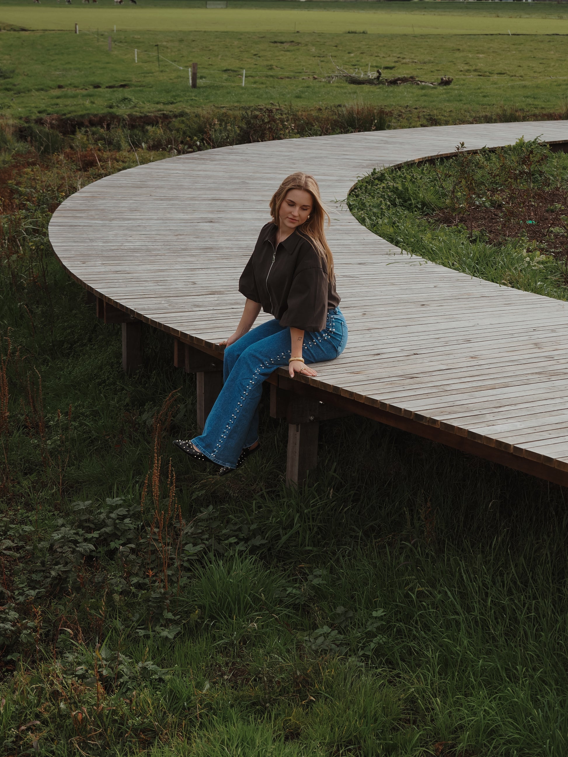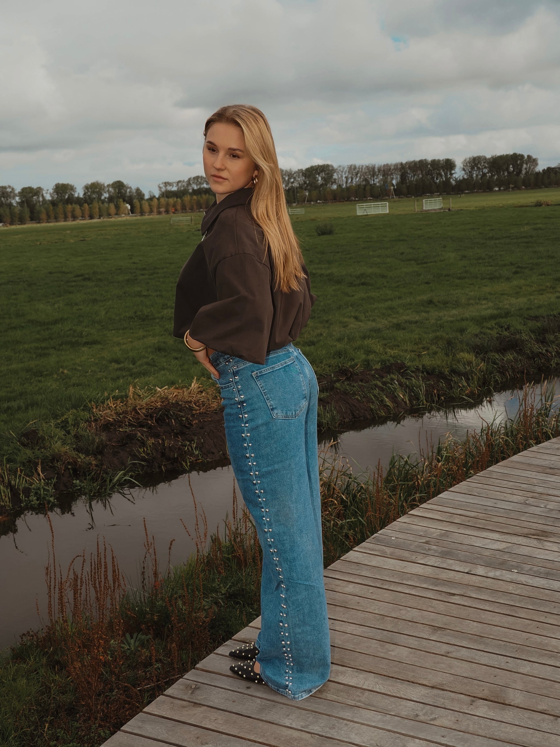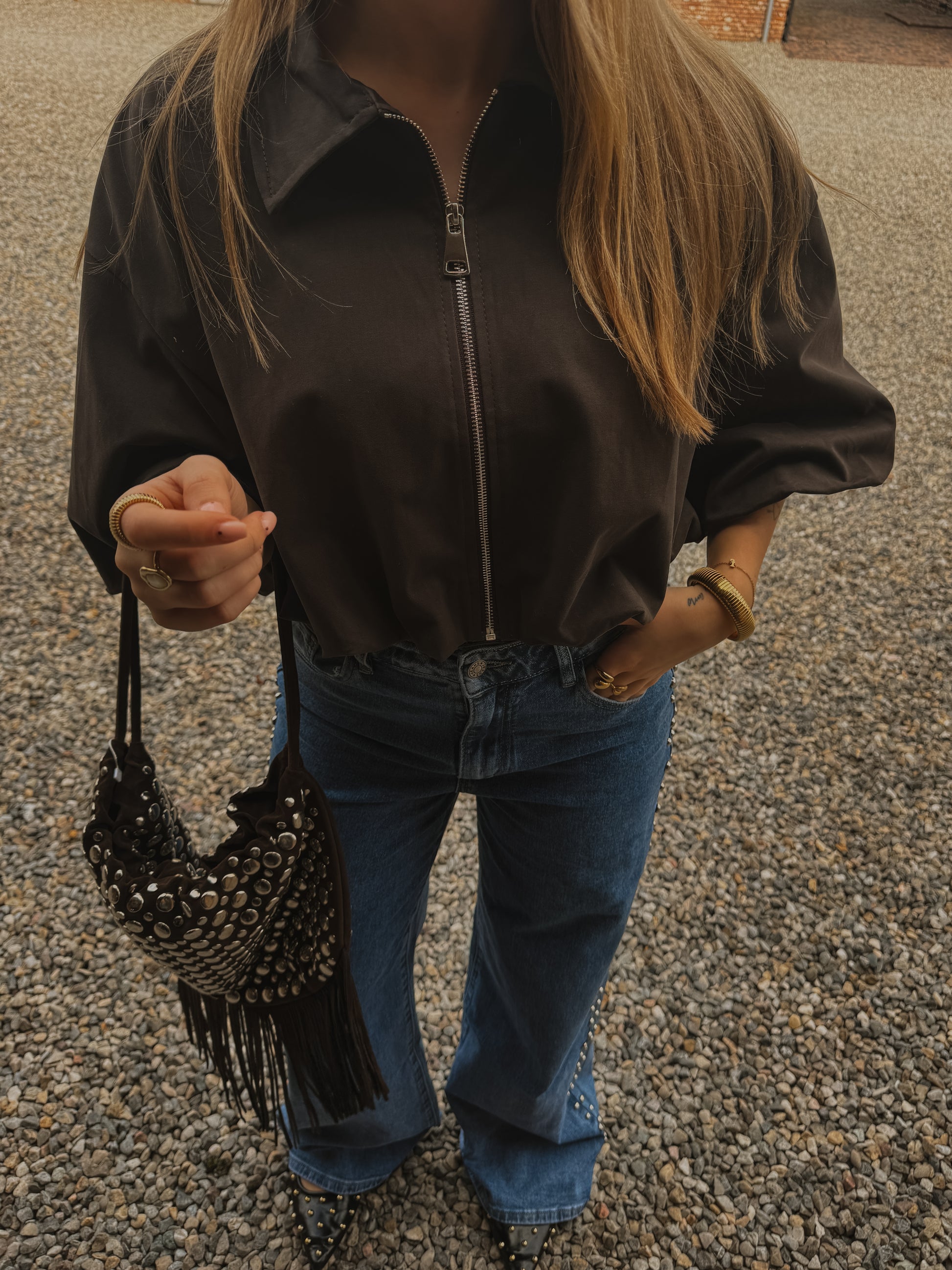 Bent jasje donkerbruin Een cropped jasje met een moderne, boxy fit en korte, wijde mouwen. De diepe donkerbruine kleur geeft een warme, stijlvolle uitstraling, terwijl de rits en kraag zorgen voor een stoere touch. Perfect om gelaagd te dragen over een top of trui, en ideaal om een casual outfit direct meer klasse te geven.