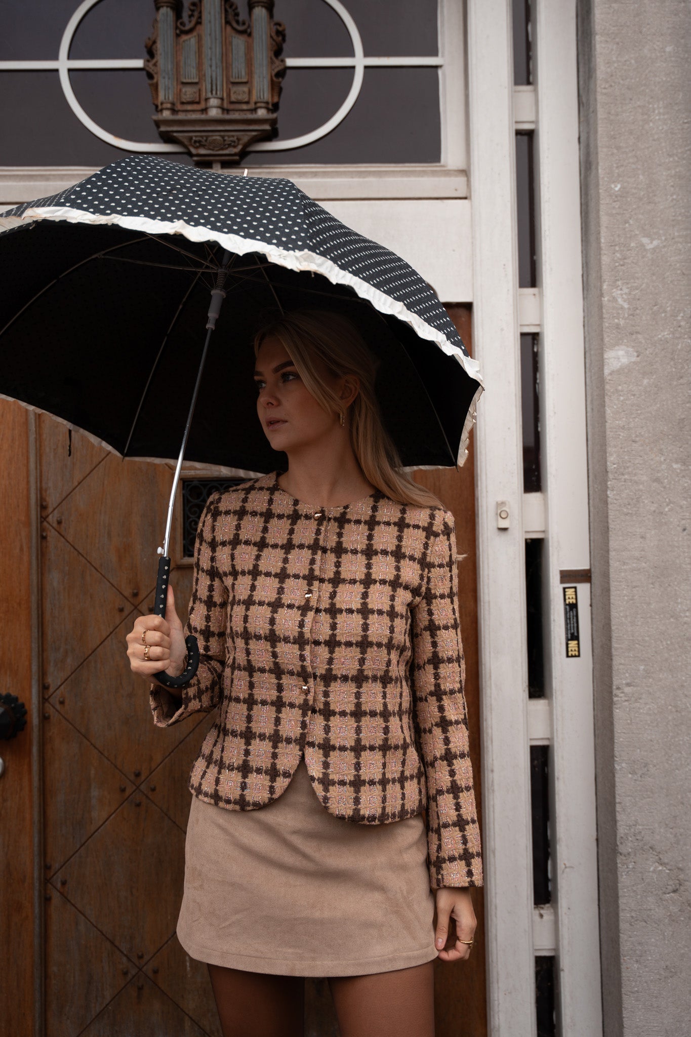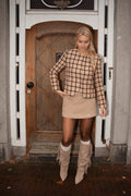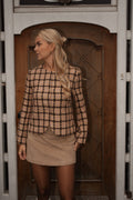 De Glow jacket beige is een verfijnd jasje met een klassieke, vrouwelijke uitstraling. Het subtiele ruitpatroon in warme beige en bruintinten geeft het design een luxueuze, vintage feel, terwijl de rechte snit met afgeronde zoom zorgt voor een elegante pasvorm. De goudkleurige knopen voegen een chique accent toe dat het geheel afmaakt. Perfect te combineren met een suède rok of denim voor een tijdloze, stijlvolle look met een moderne twist