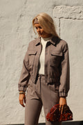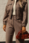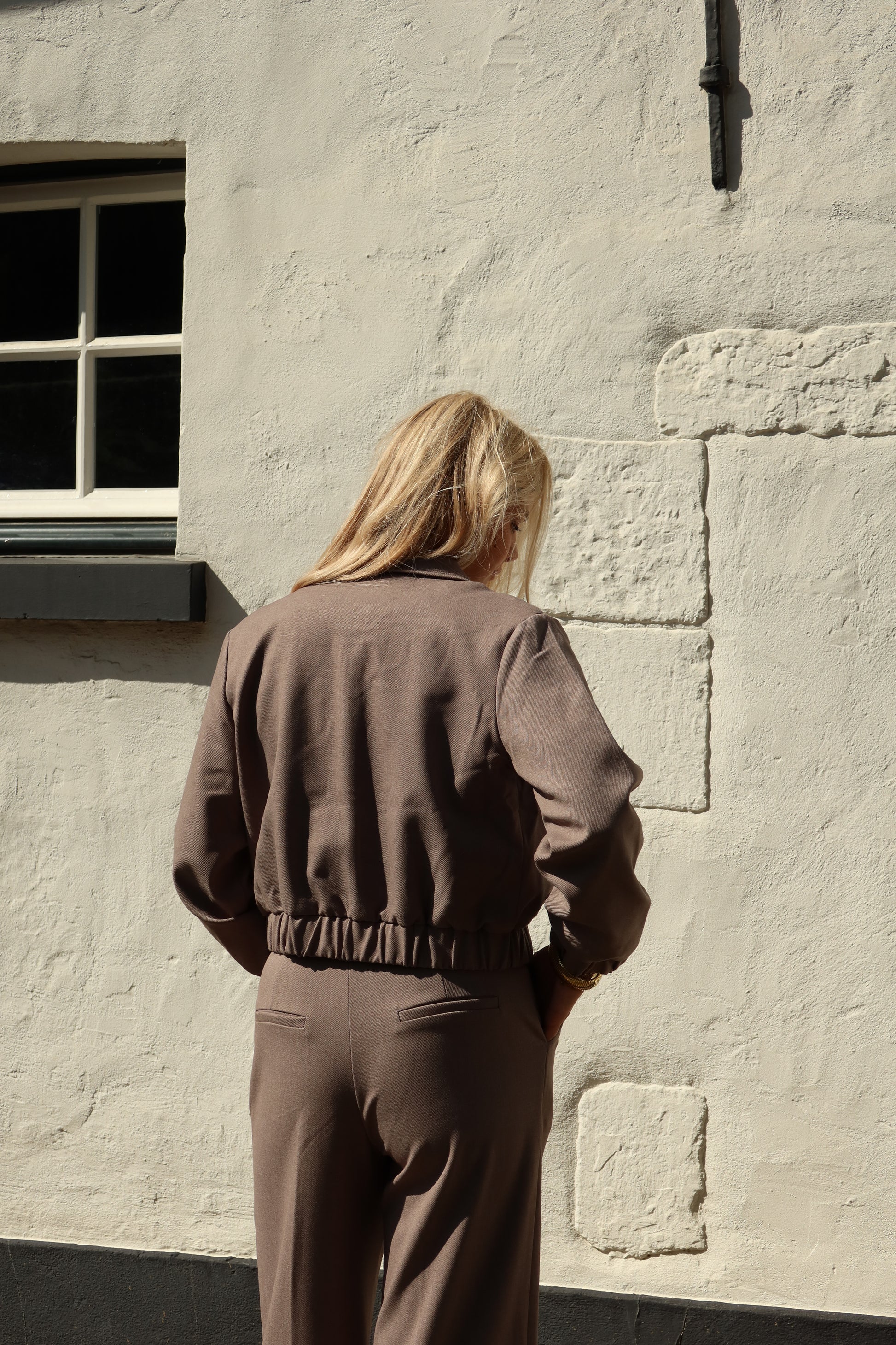 Het Jasje Jaro in taupe is een stoere en toch vrouwelijke toevoeging aan je garderobe. Het korte model met elastische taille en manchetten geeft een speels, bomberjack-effect. De klepzakken en drukknopen zorgen voor een moderne, utility-look. Gemaakt in een neutrale taupe tint die makkelijk te combineren is, zowel casual met denim als chic met de bijpassende pantalon.