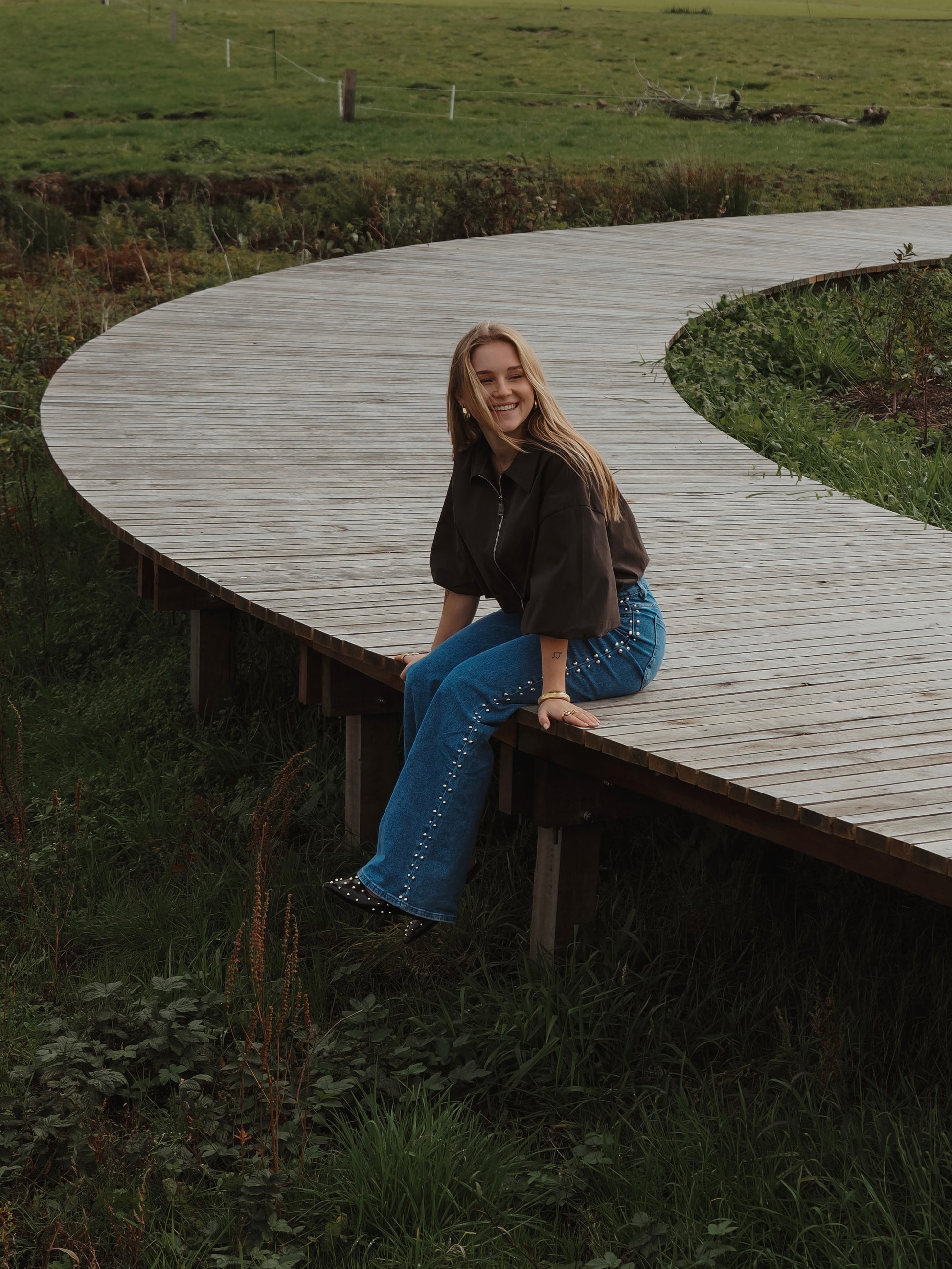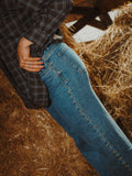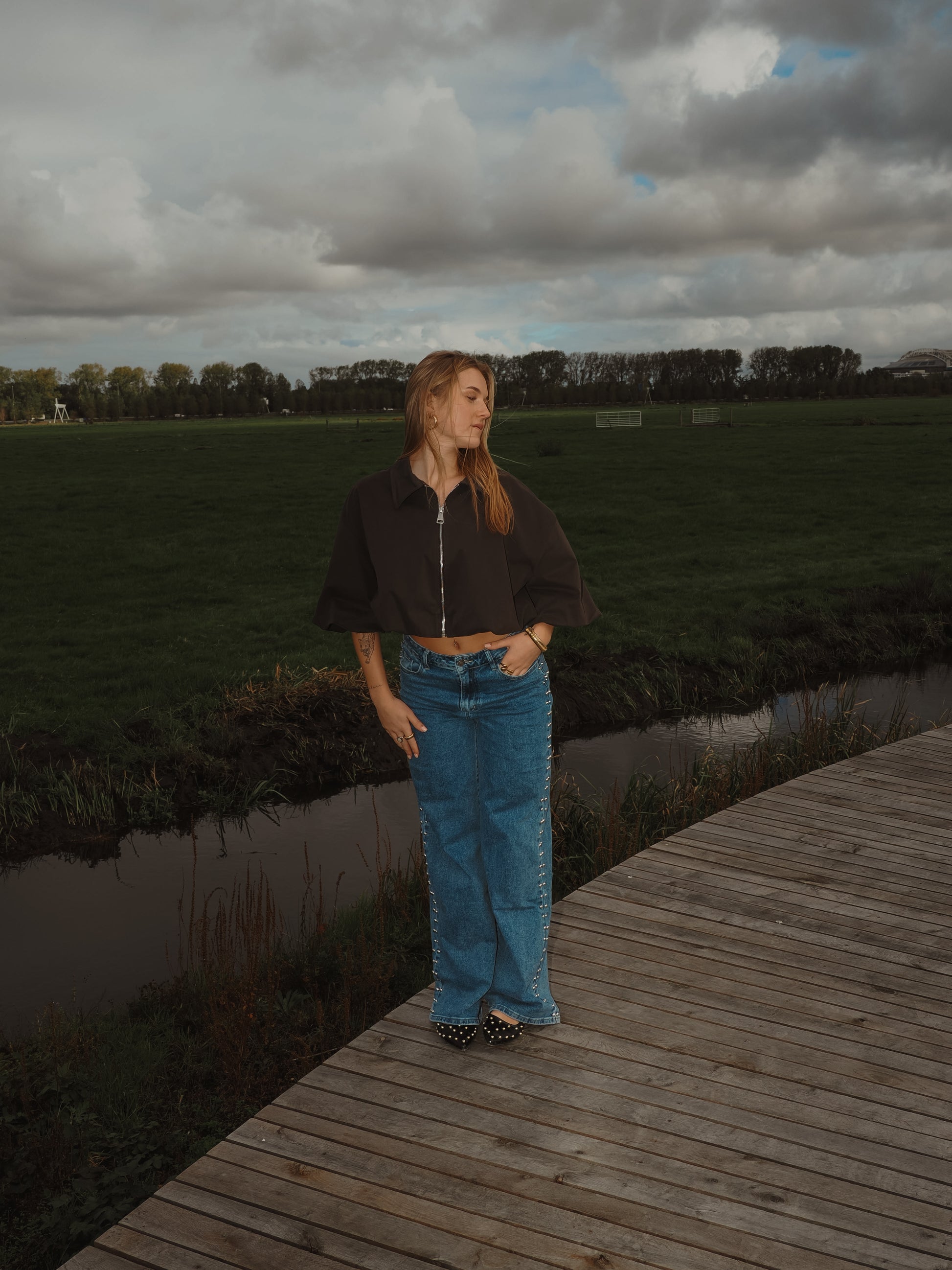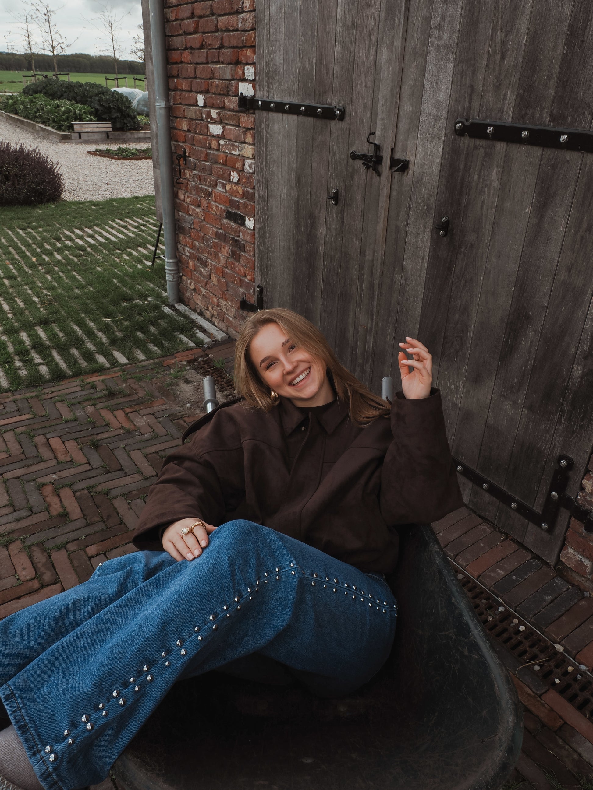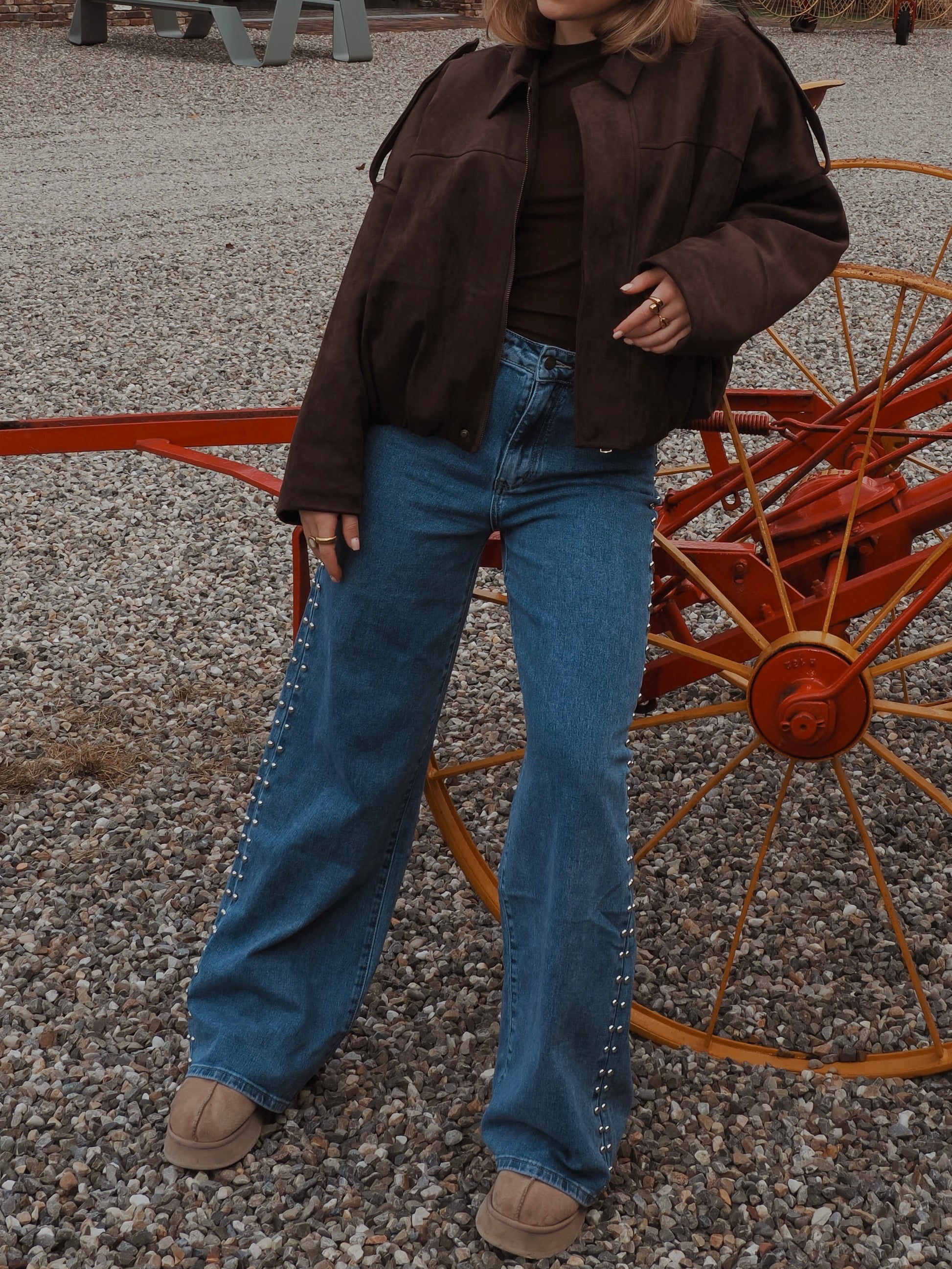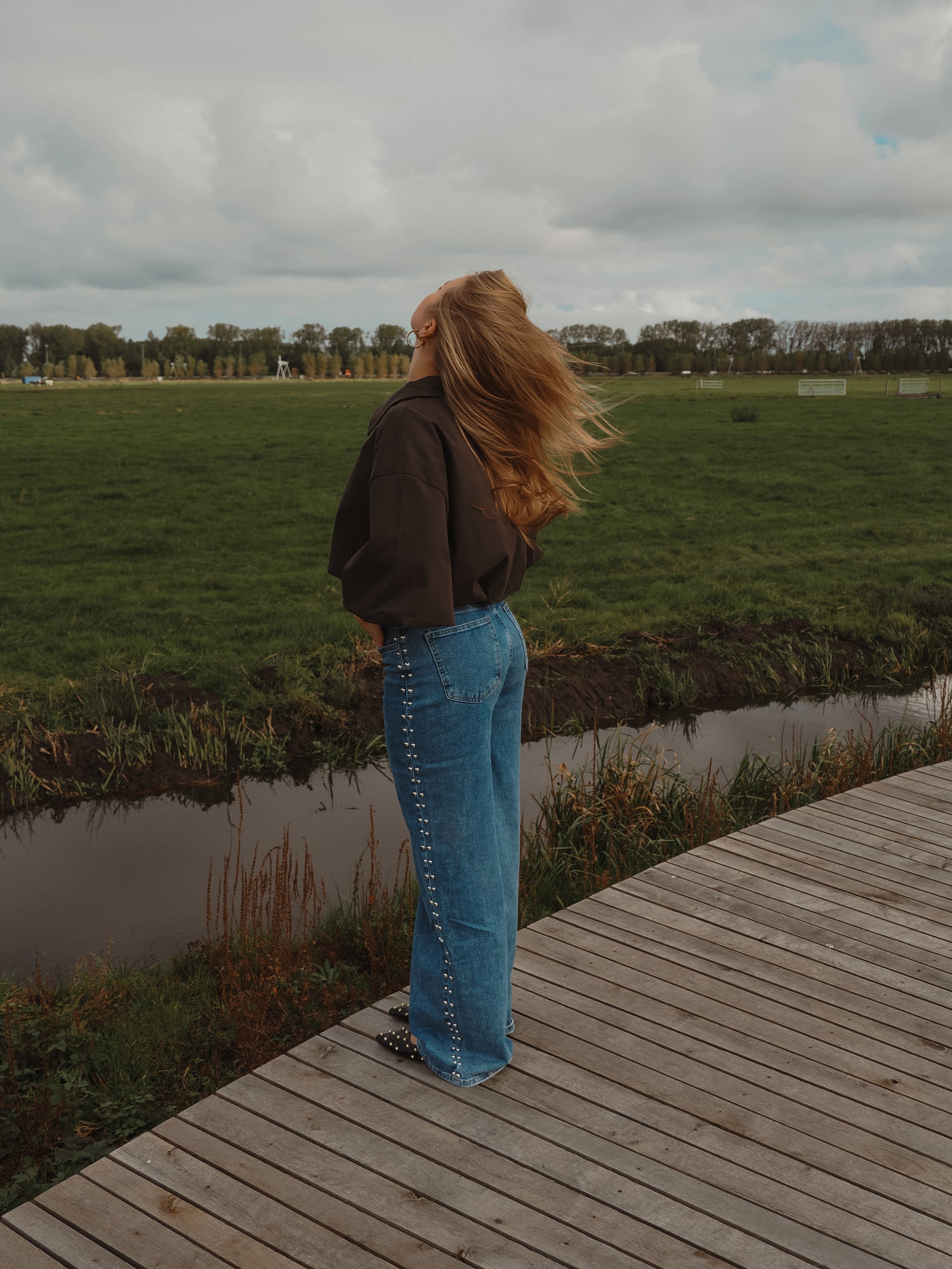 De Riza jeans blauw is een trendy denim met een rechte wijdere pijp, en stoere zilverkleurige studs langs de zijnaden. De middenblauwe wassing geeft de jeans een casual maar opvallende uitstraling. Perfect te combineren met een knit of blazer voor een moderne, edgy look.