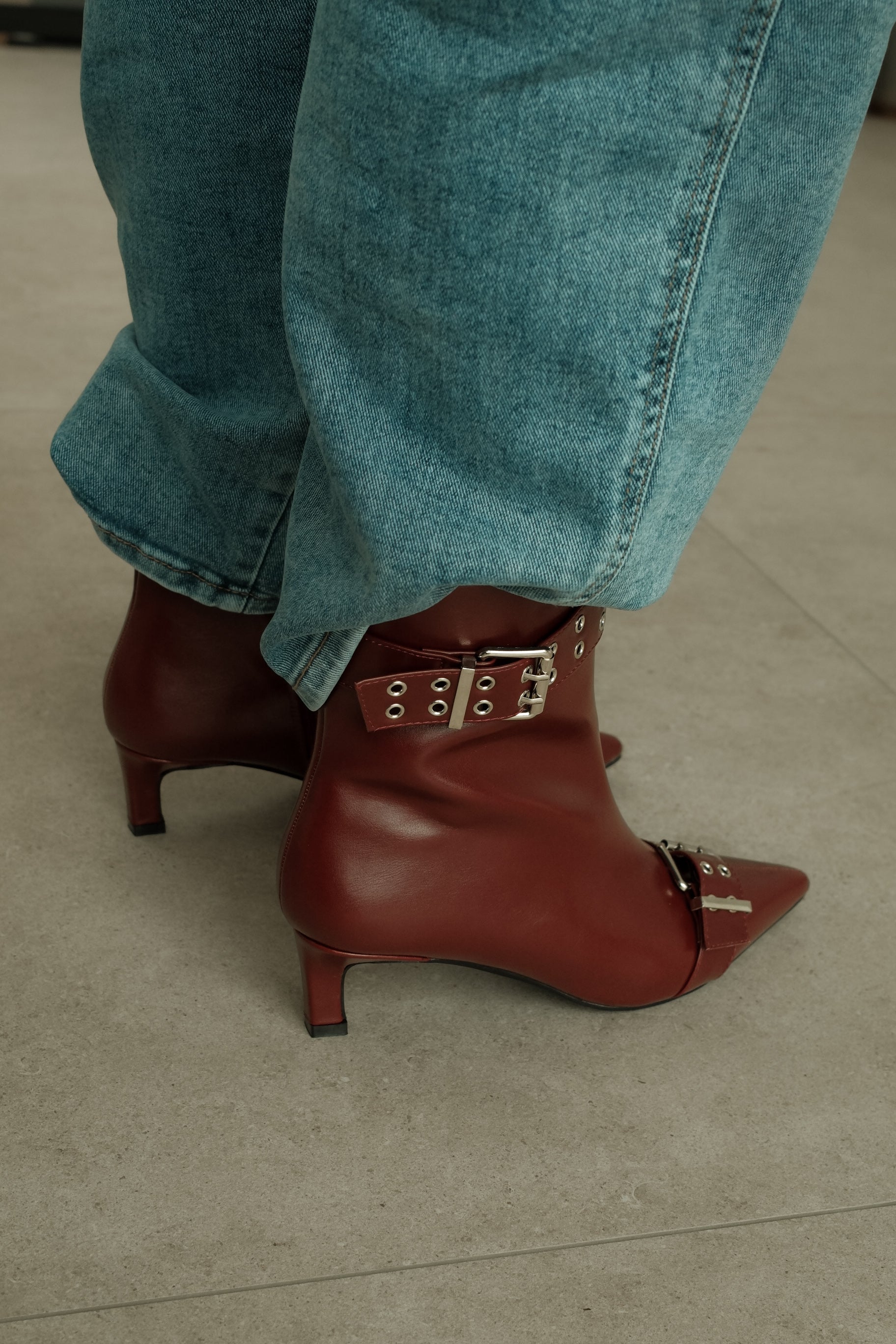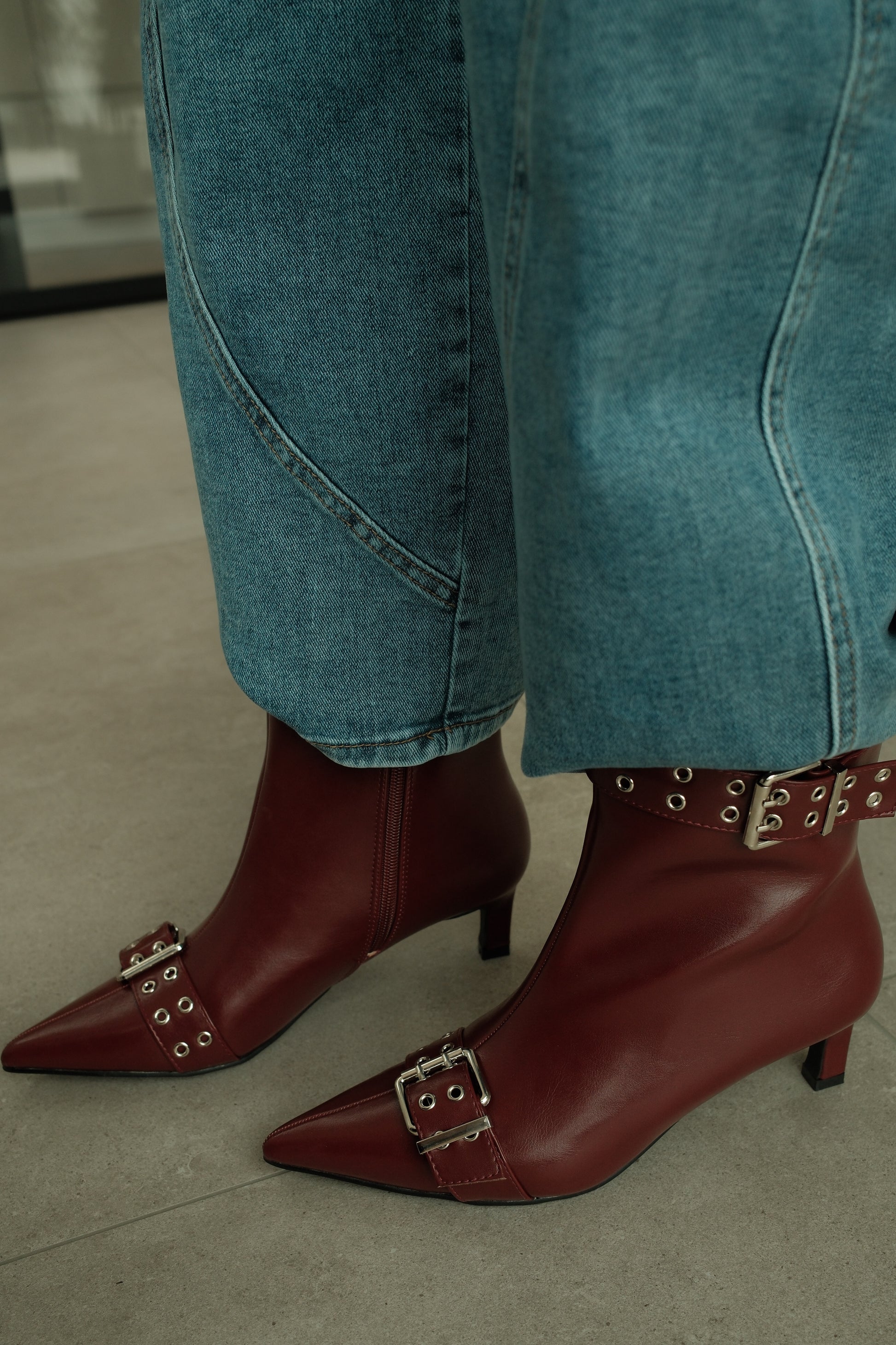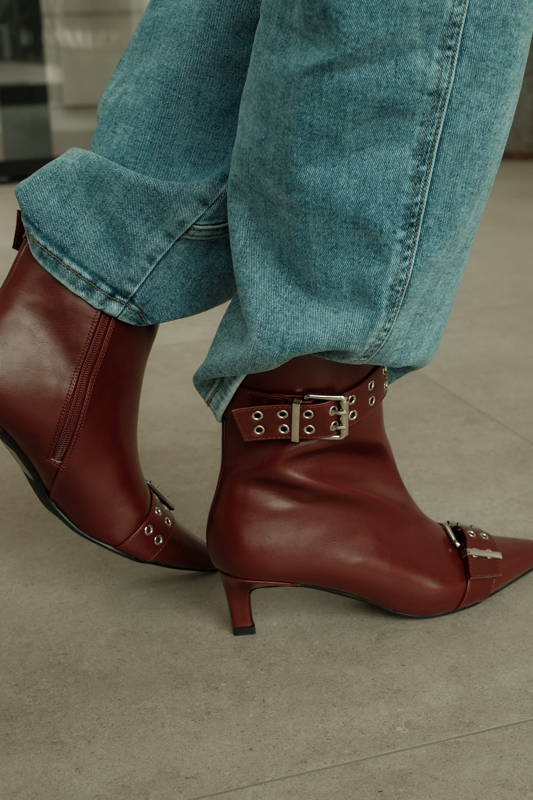 De Laars Didi is een elegante enkellaars in een diepe bordeaux kleur met een stoere twist. Het gladde materiaal geeft een luxe uitstraling, terwijl de siergesp met metalen oogdetails zorgt voor een krachtig en modieus accent. De subtiele hak biedt comfort en een vrouwelijke look, ideaal voor zowel dagelijks gebruik als geklede outfits.