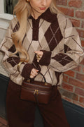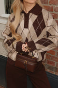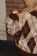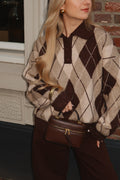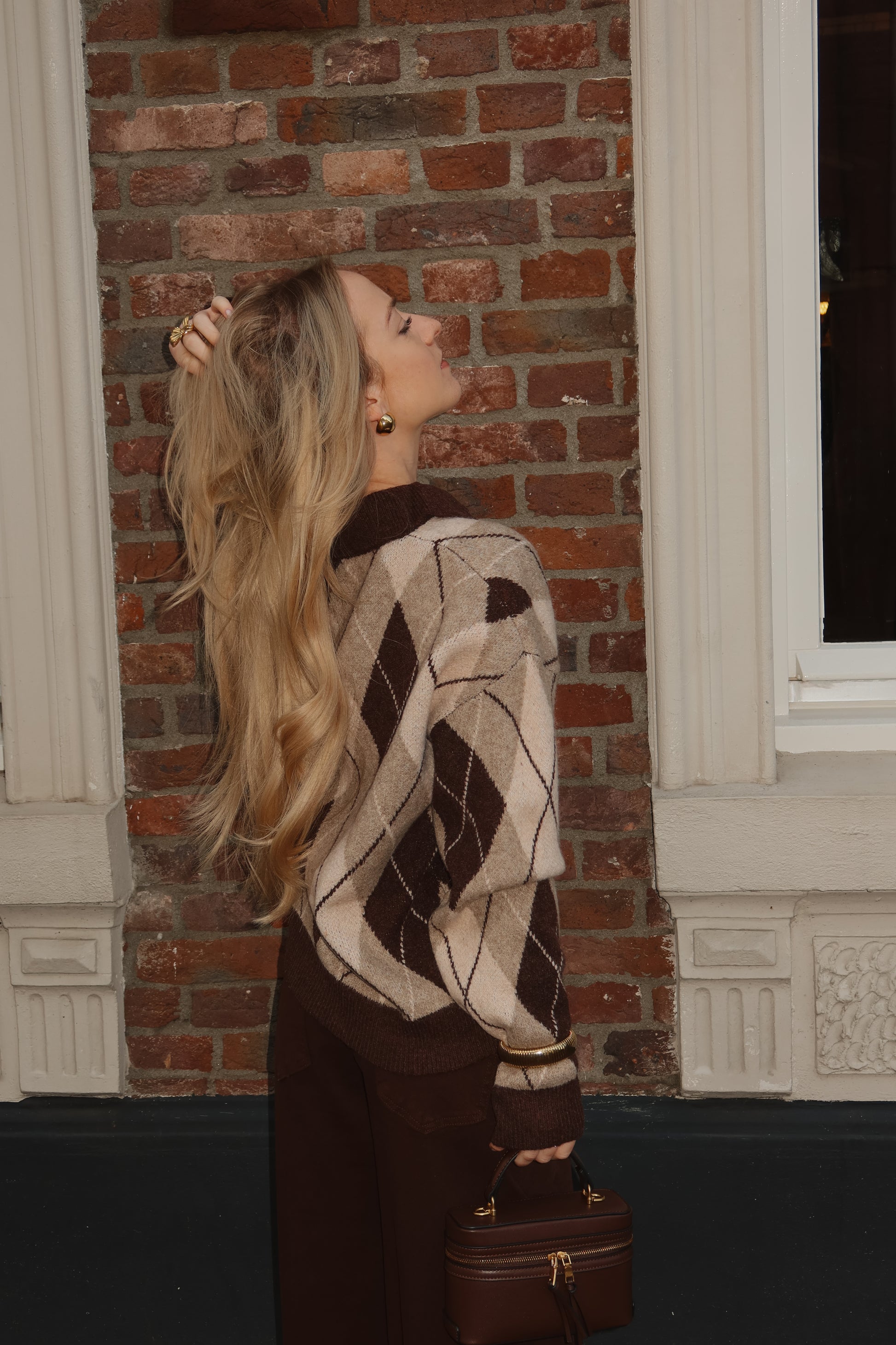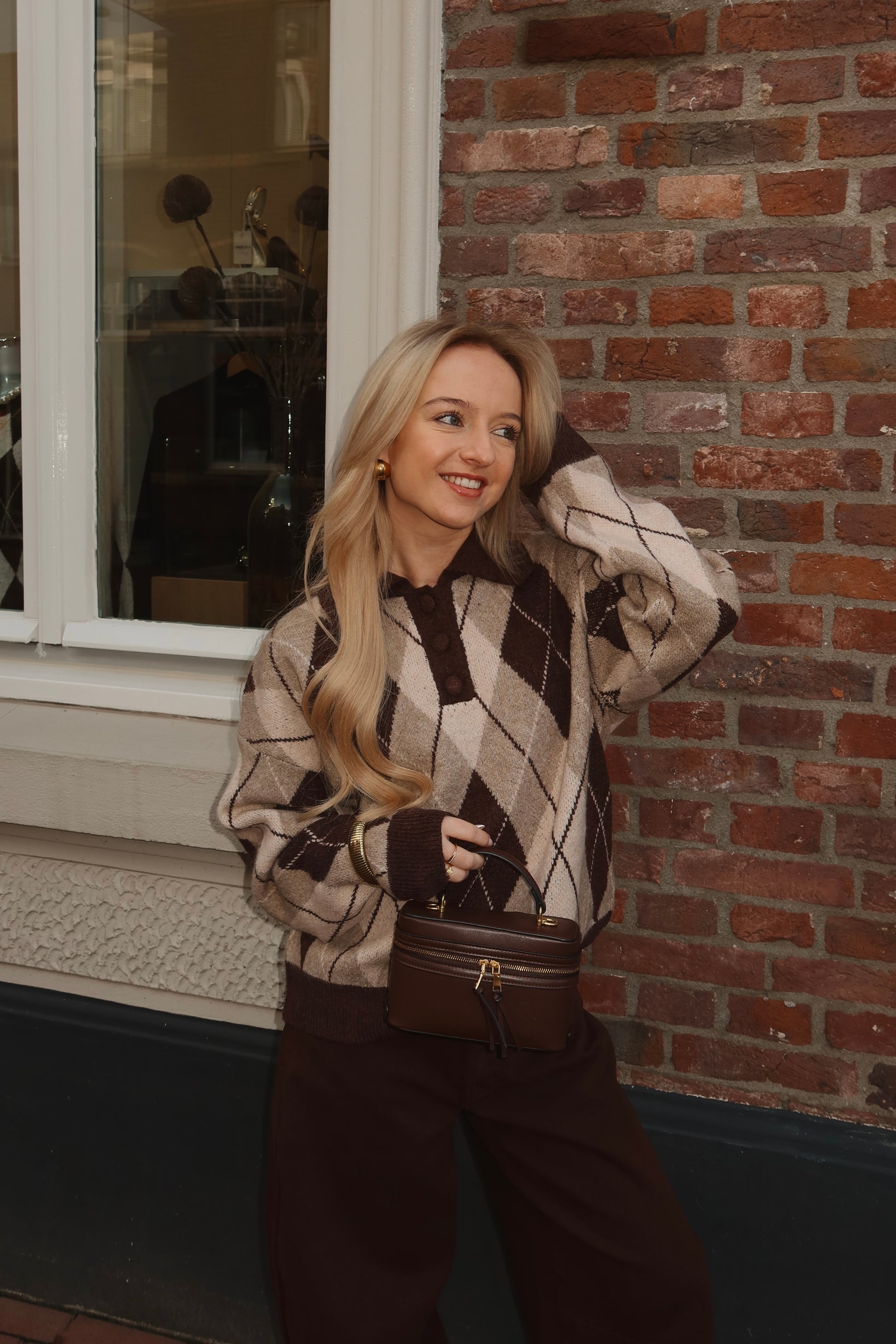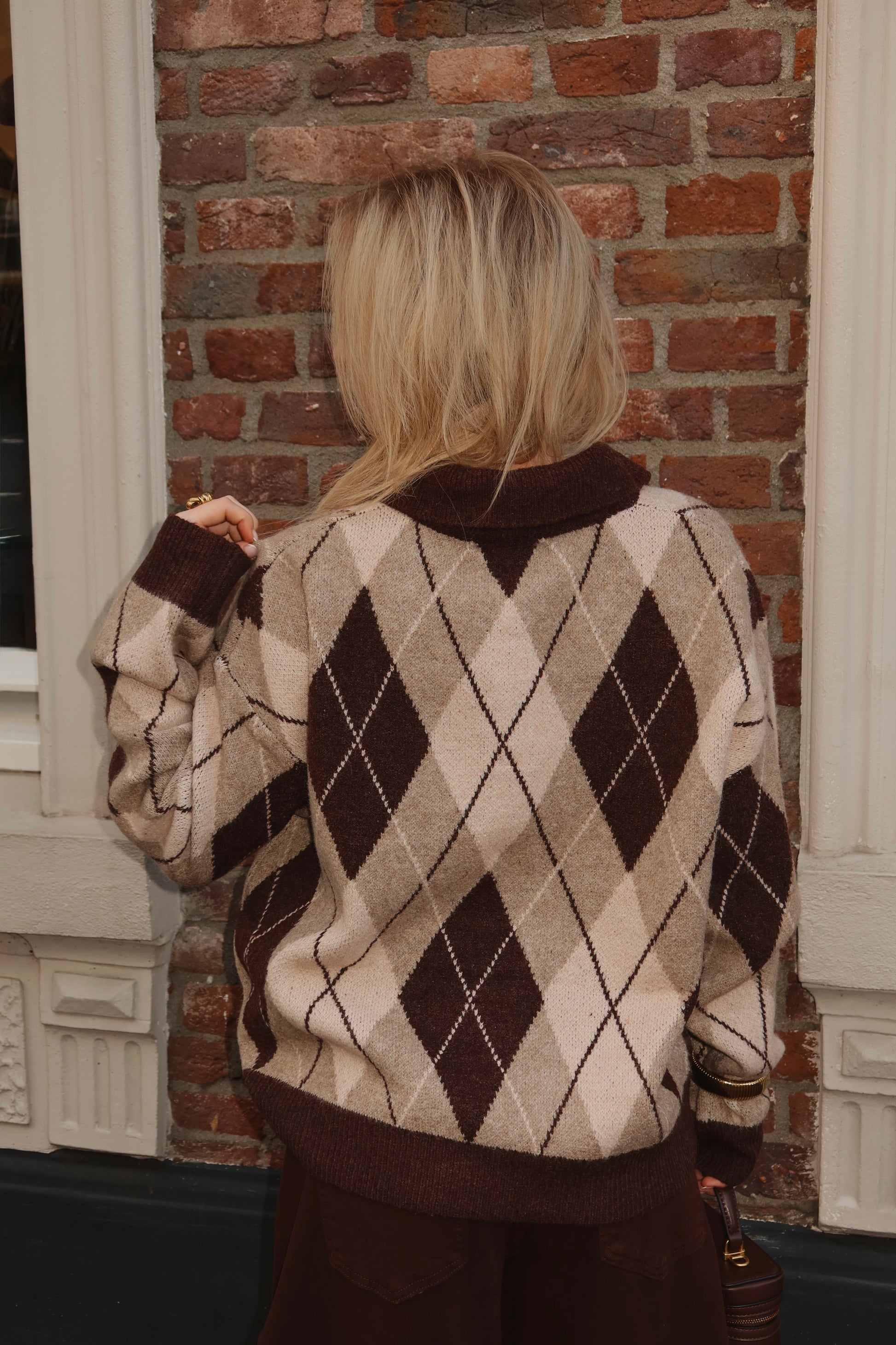 De Mavie polo de Mavie polo is een warme trui met een opvallend ruitpatroon in chocolade en zandtinten. De zachte, gebreide stof voelt comfortabel aan en geeft een luxueuze, retro uitstraling. Dankzij de relaxte pasvorm en de klassieke kraag combineert deze polo moeiteloos stijl en comfort. Perfect te dragen met een bruine pantalon of denim voor een moderne, cozy look met een vintage twist.