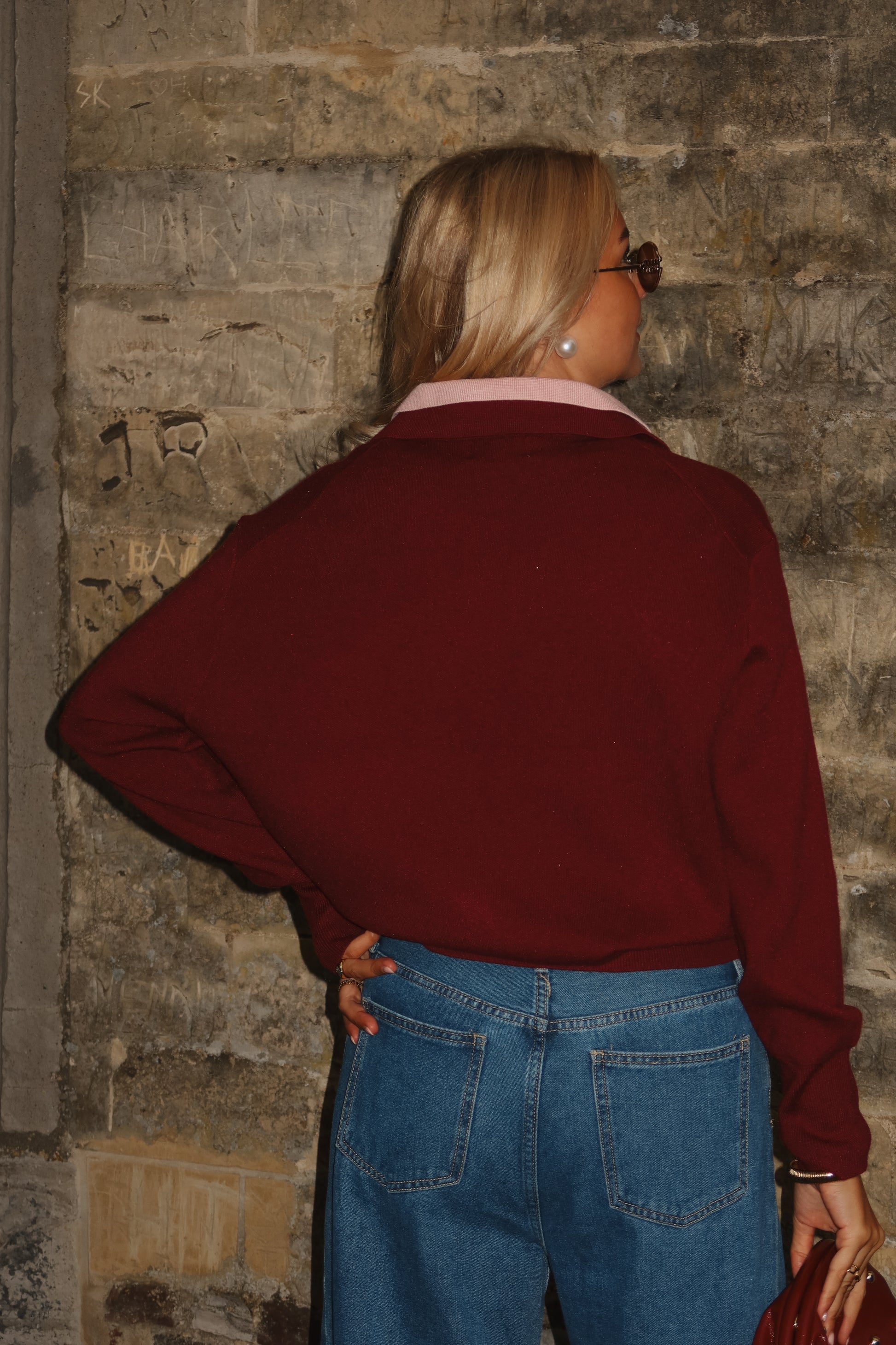De Runa polo is een knit met klassieke kraag en knoopsluiting in een rijke bordeaux kleur. De lichtere kraag in roze contrasteert subtiel en geeft de polo een speelse, moderne twist. Dankzij de relaxte fit en het tijdloze design is dit een perfecte combinatie van comfortabel en chic.