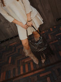 De Hailey tas bruin statement schoudertas in een suède-look met opvallende zilverkleurige studs en speelse franjes. De rijke bruine tint en zachte textuur geven een boho-chique uitstraling. Perfect om elke outfit een stoere, stijlvolle twist te geven.