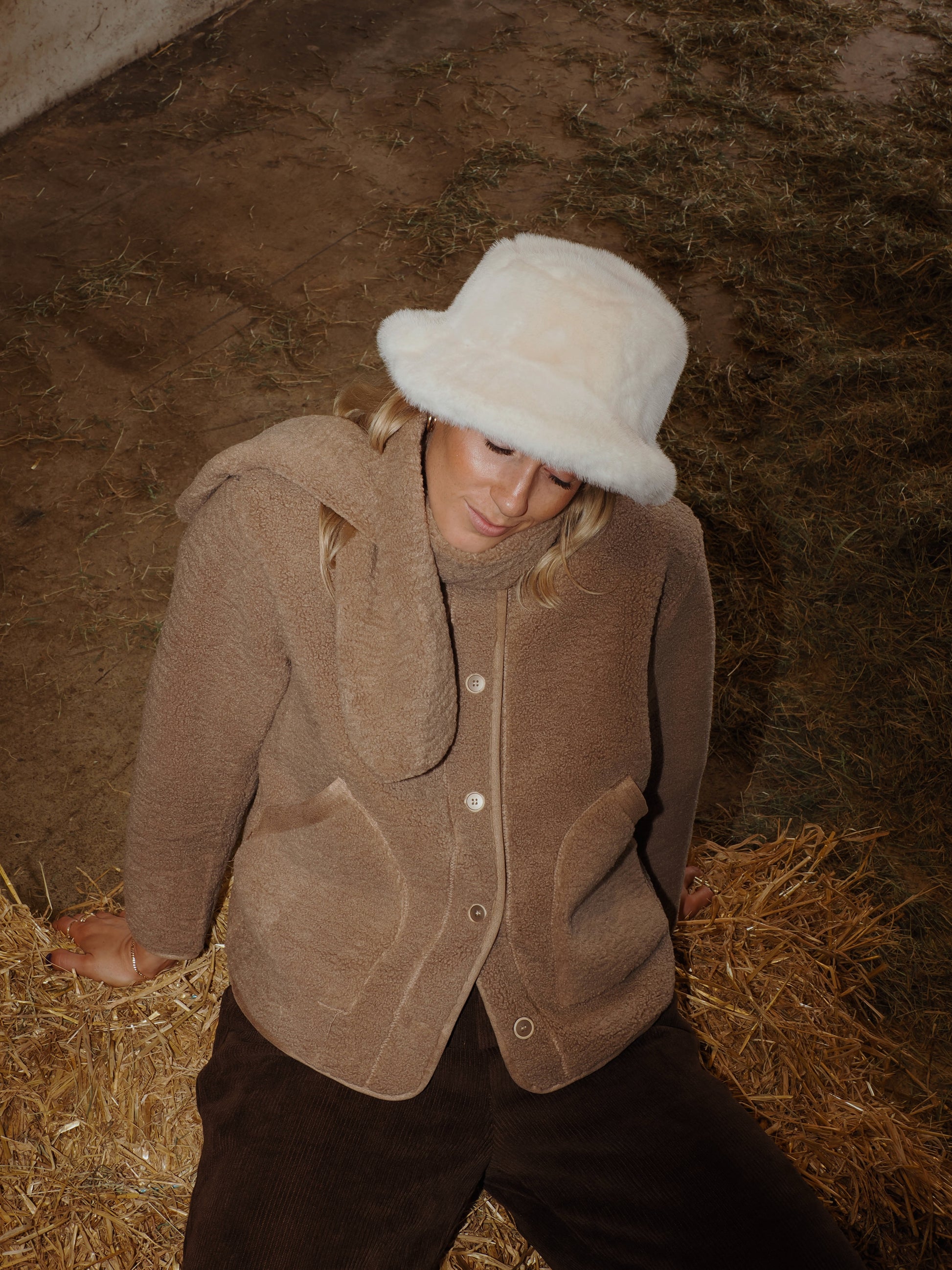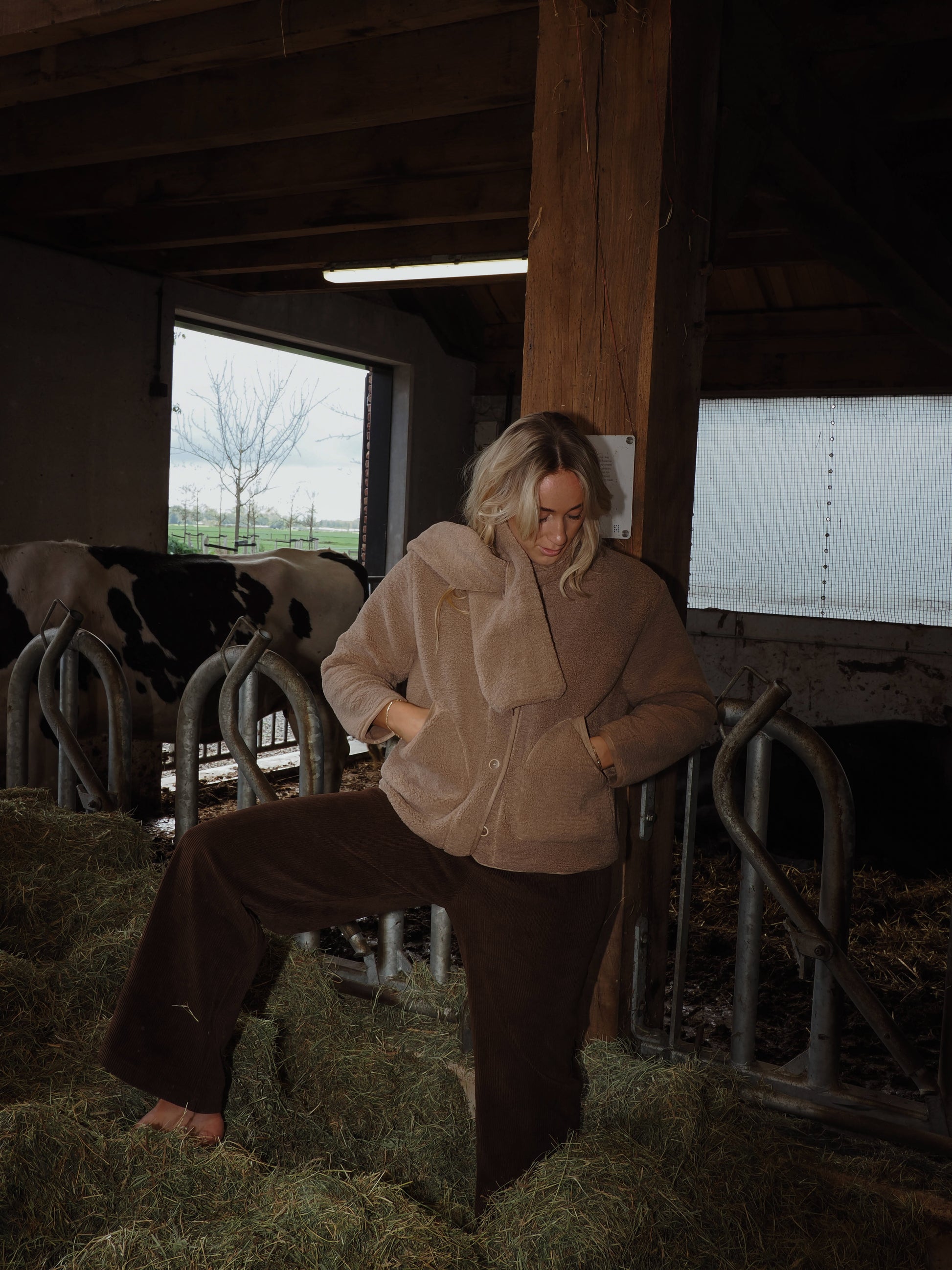 De Fano jas camel is een heerlijk zachte teddyjas in een warme camel tint. Het losse model met opgestikte zakken en bijpassende sjaal geeft een cozy, eigentijdse look. Perfect voor frisse dagen waarop comfort en stijl samenkomen.