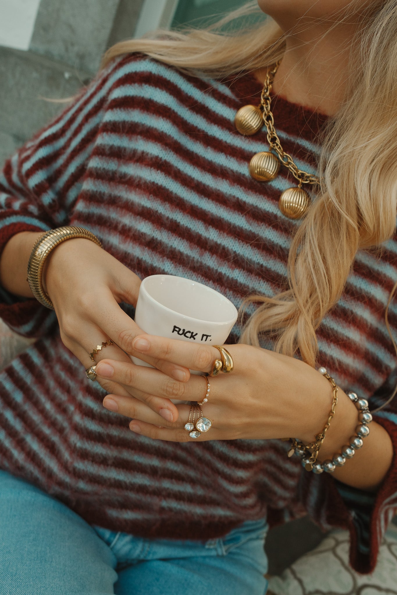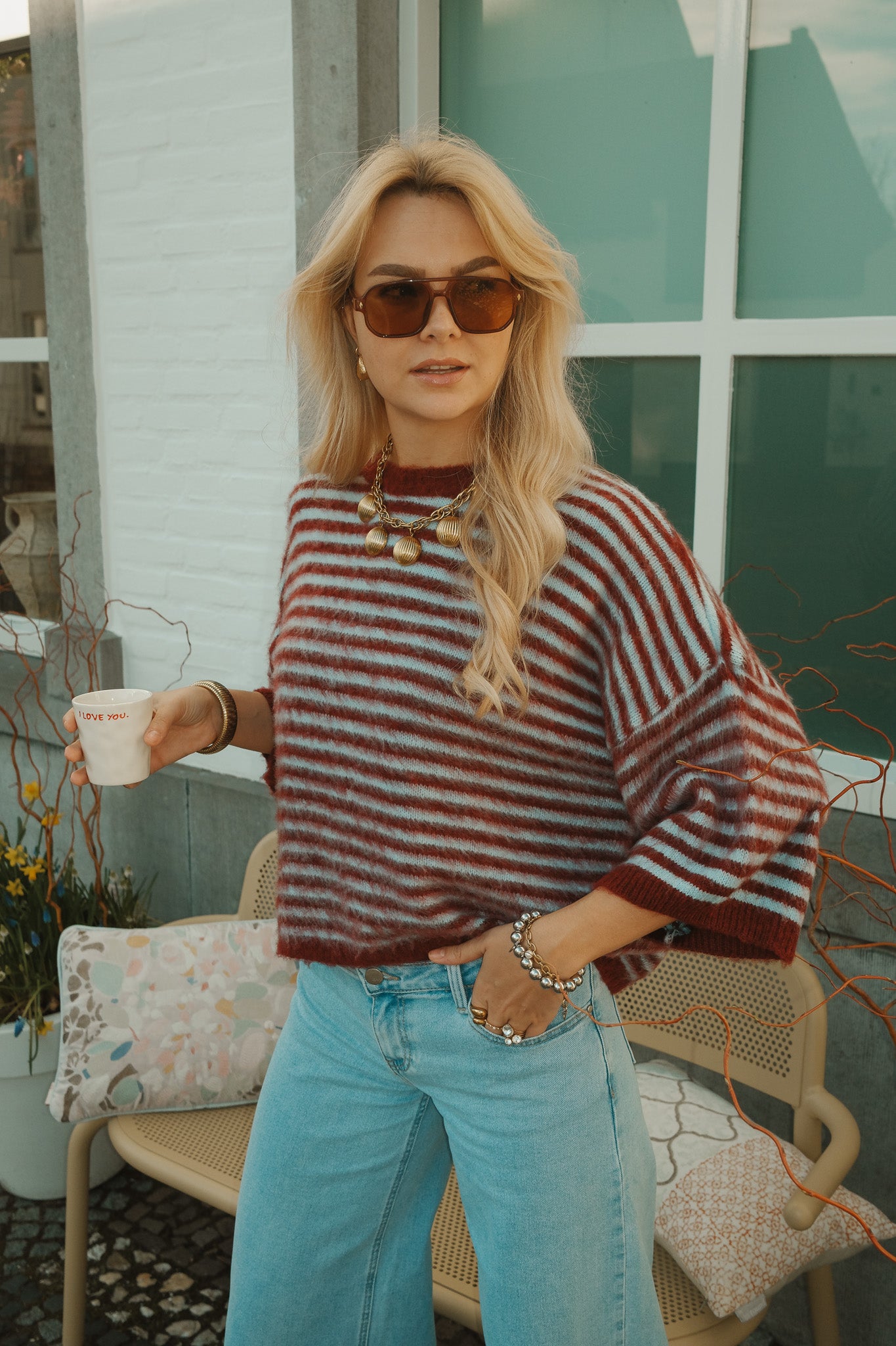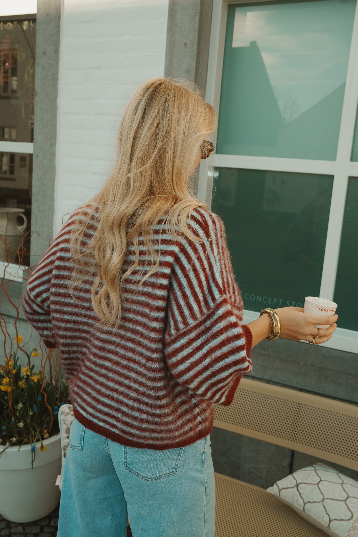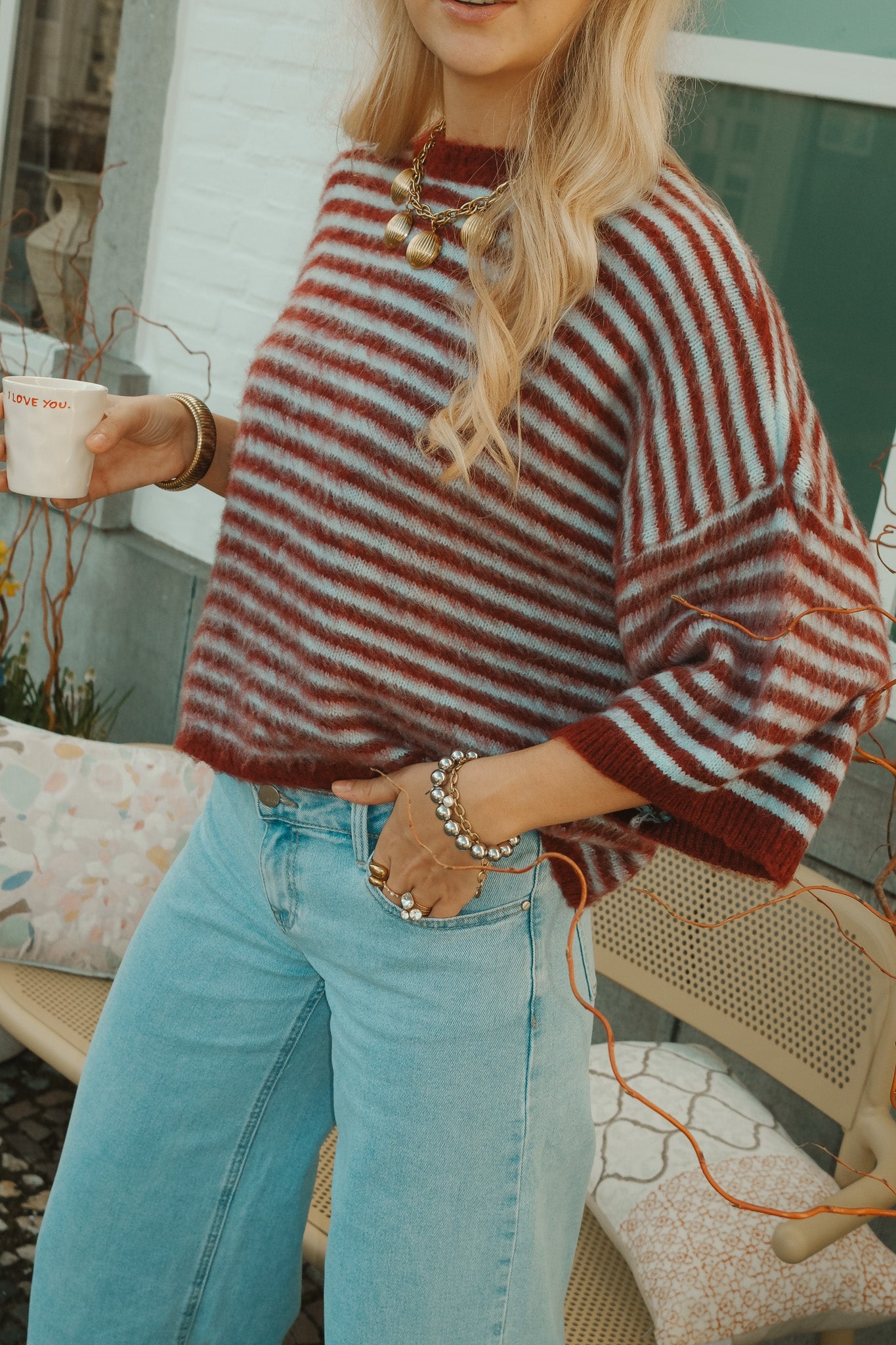 De Jules knit is een zachte statement trui met een warme bordeaux basis en fijne lichtblauwe strepen. De fluffy structuur en losvallende fit geven een comfortabele, luxe uitstraling. Perfect te combineren met denim voor een stijlvolle, effortless look.