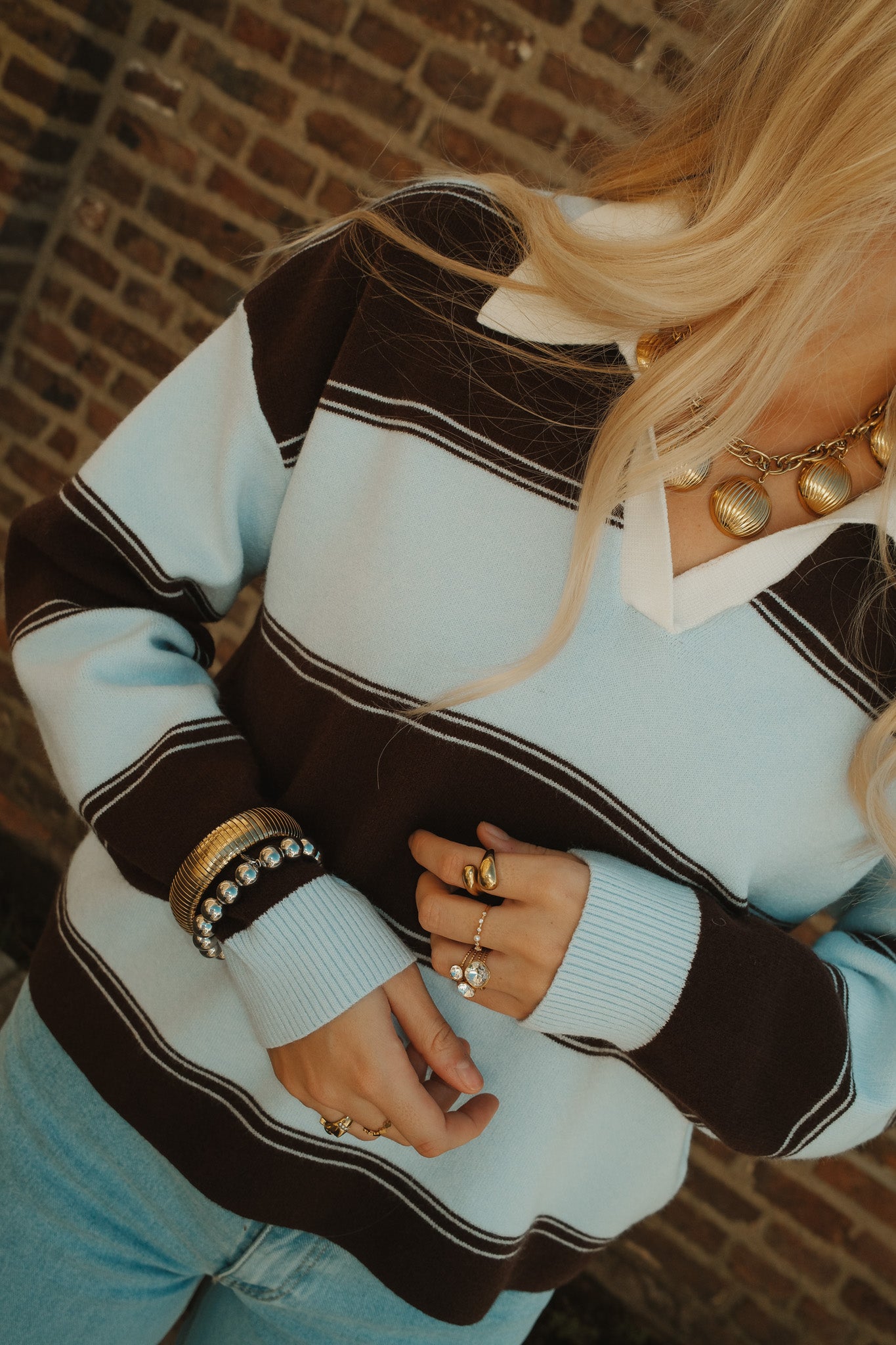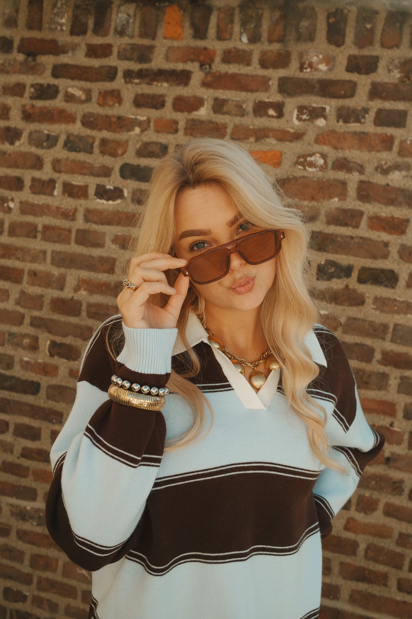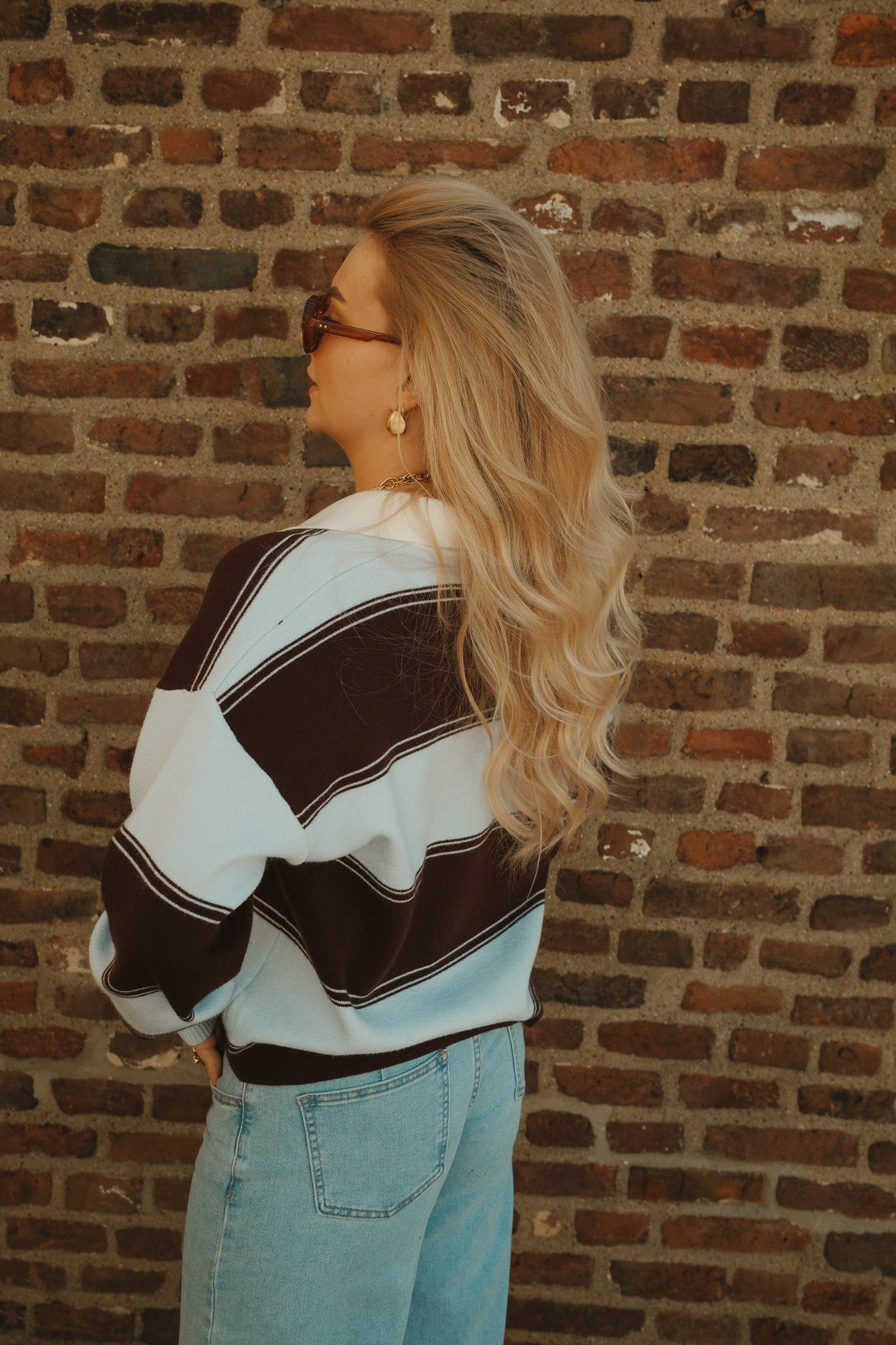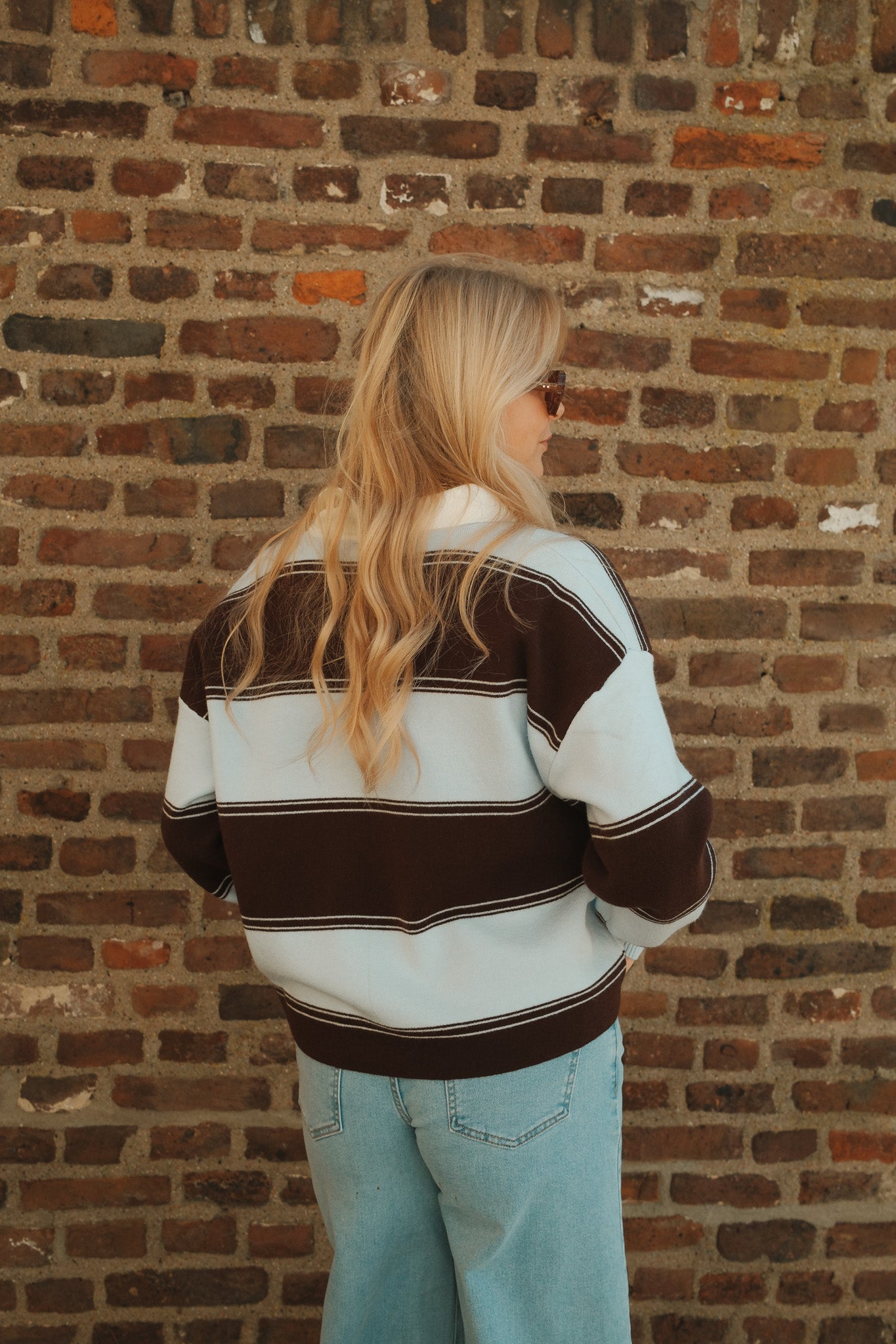 De Nora long sleeve polo is een stijlvolle essential met een sportieve twist. De brede strepen in lichtblauw en diepbruin geven een krachtig contrast, terwijl de witte kraag en V-hals zorgen voor een frisse, klassieke touch. De zachte stof en comfortabele fit maken haar perfect voor een effortless everyday look. Combineer met denim voor casual chic of draag haar met een pantalon voor een meer geklede uitstraling