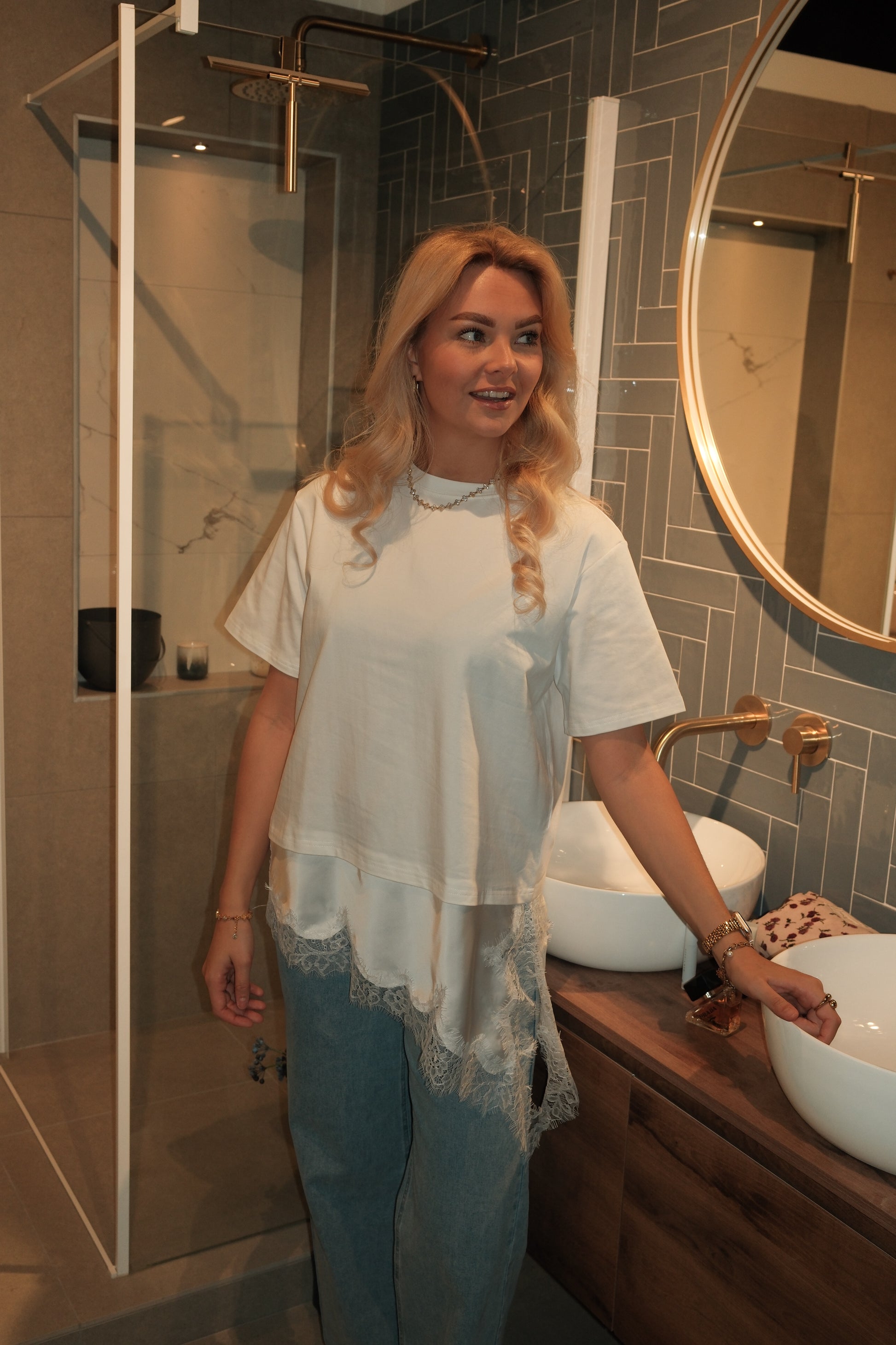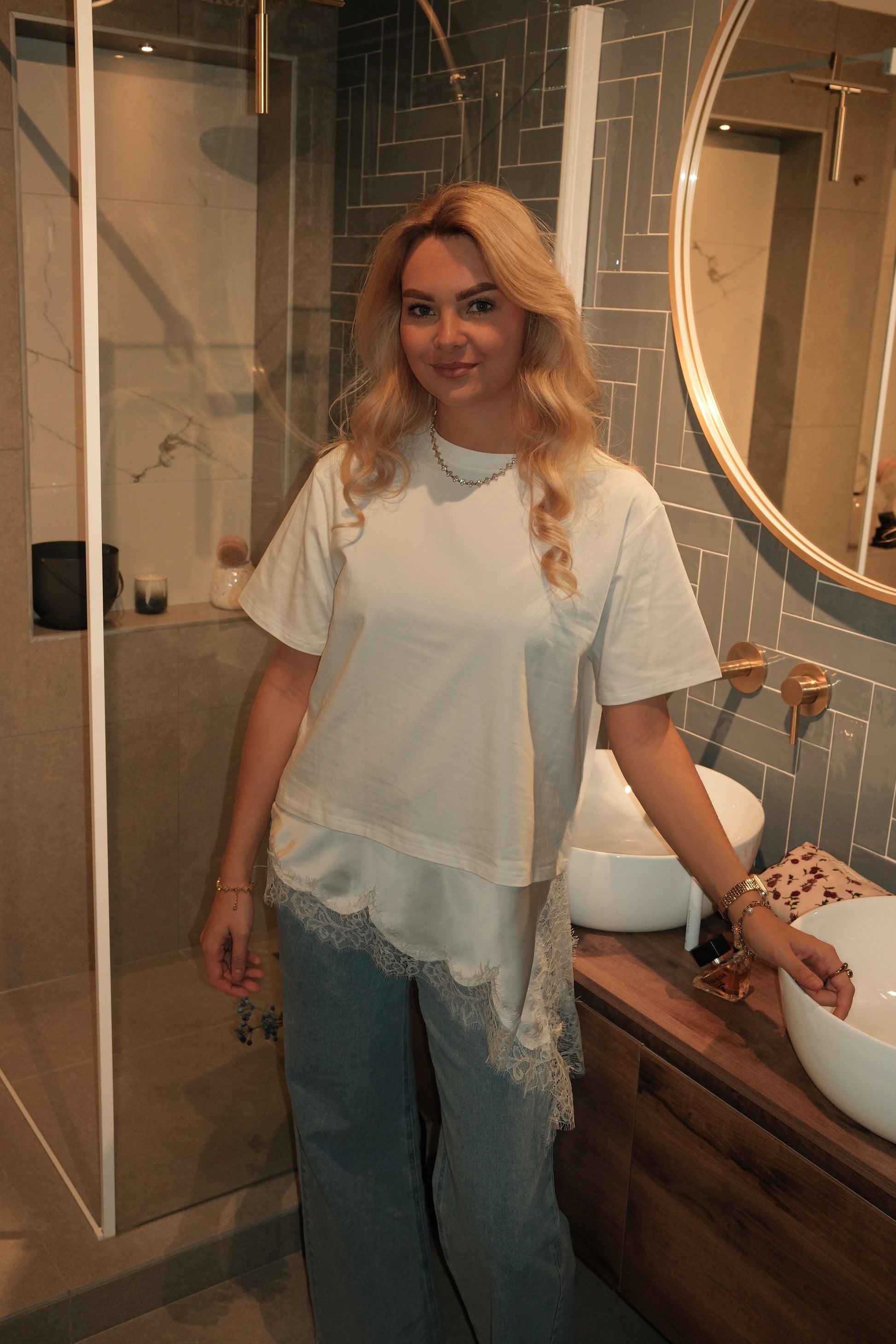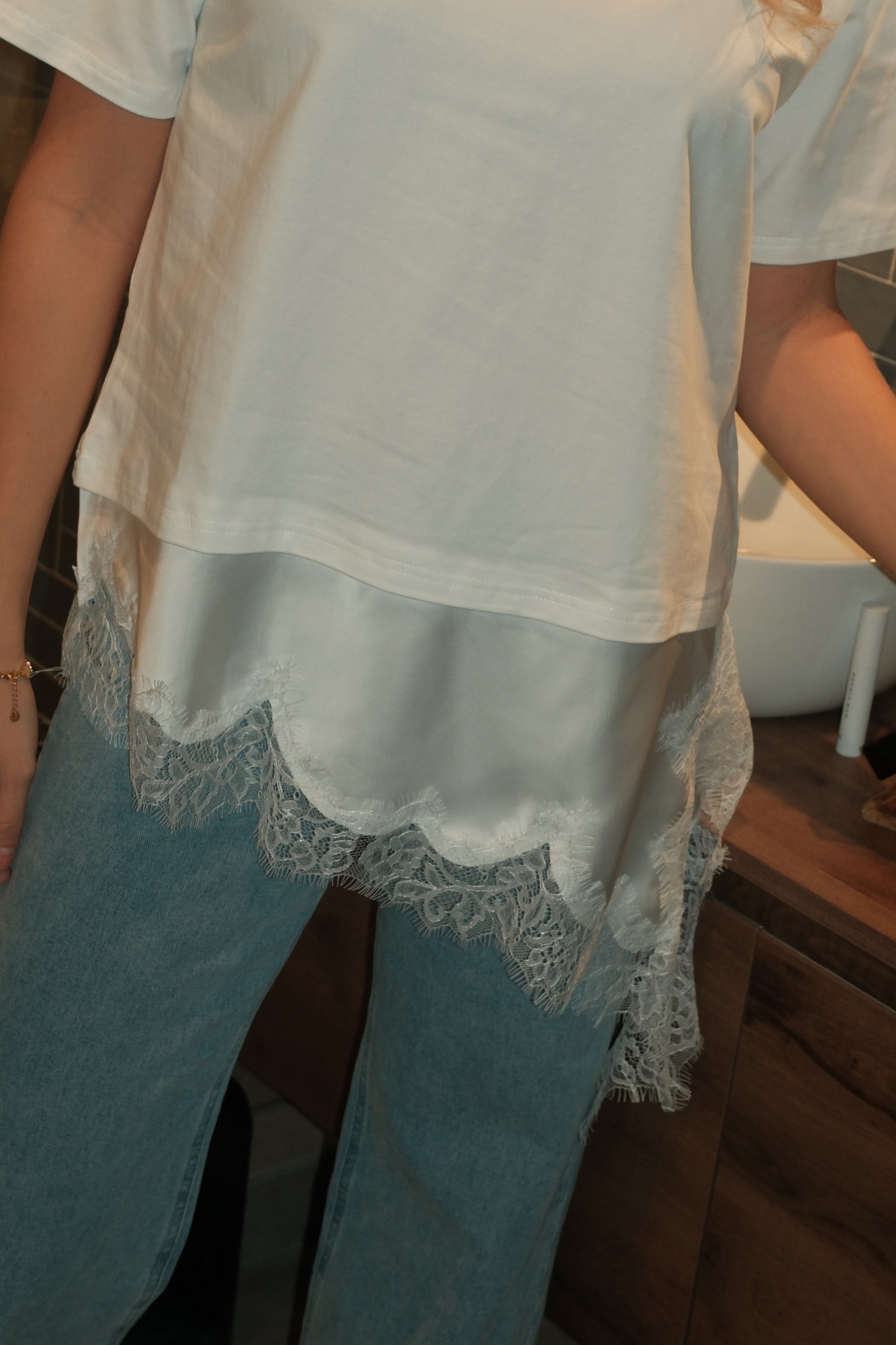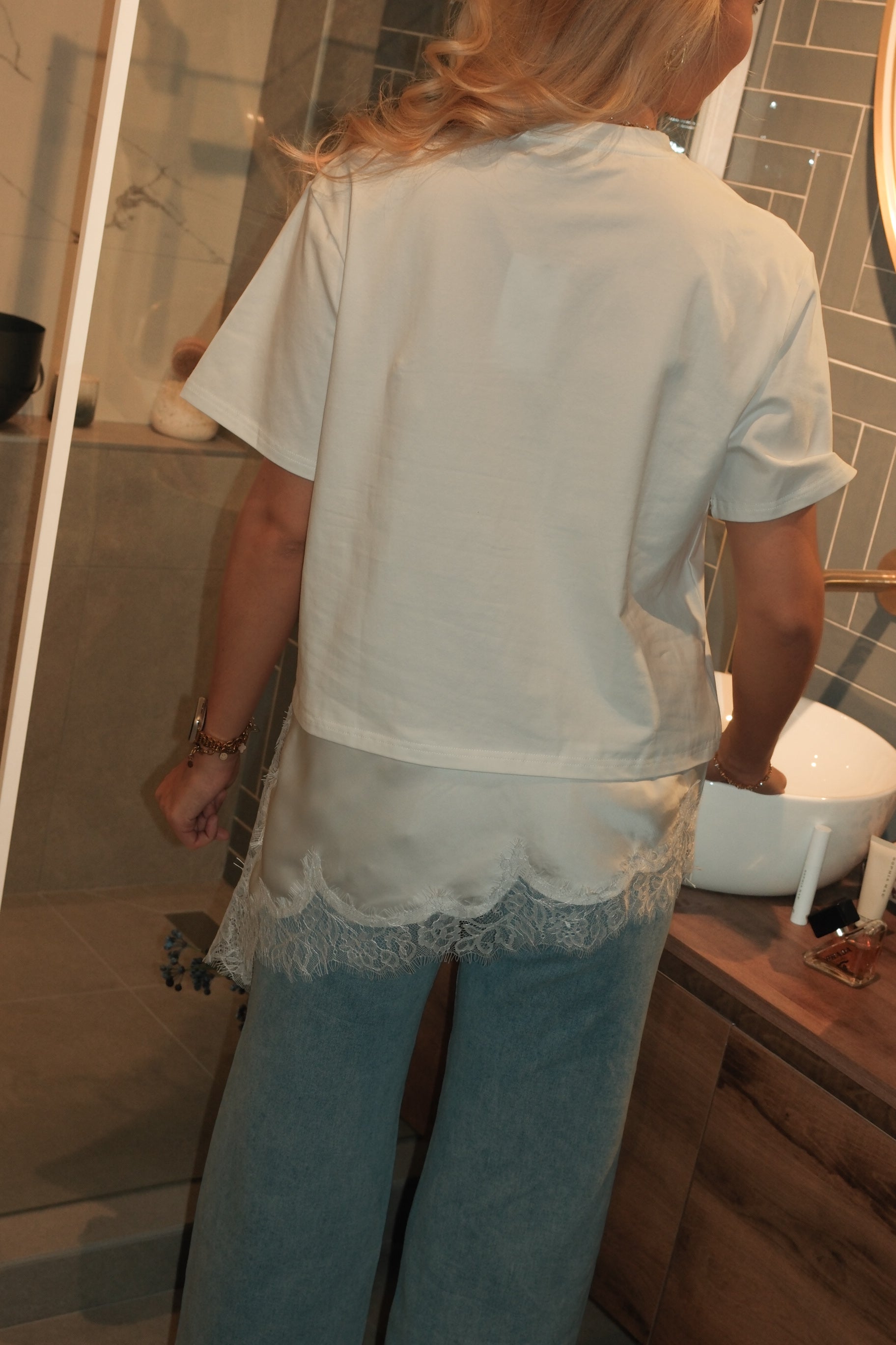 De Shirt Liv is een basic T-shirt in het wit met een rechte, comfortabele pasvorm en ronde hals. De onderzijde is afgewerkt met een satijnen laag en subtiel kant voor een vrouwelijke, speelse touch. Perfect om casual te dragen op een jeans, maar ook mooi te combineren met een sjaaltje of blazer voor een geklede look.