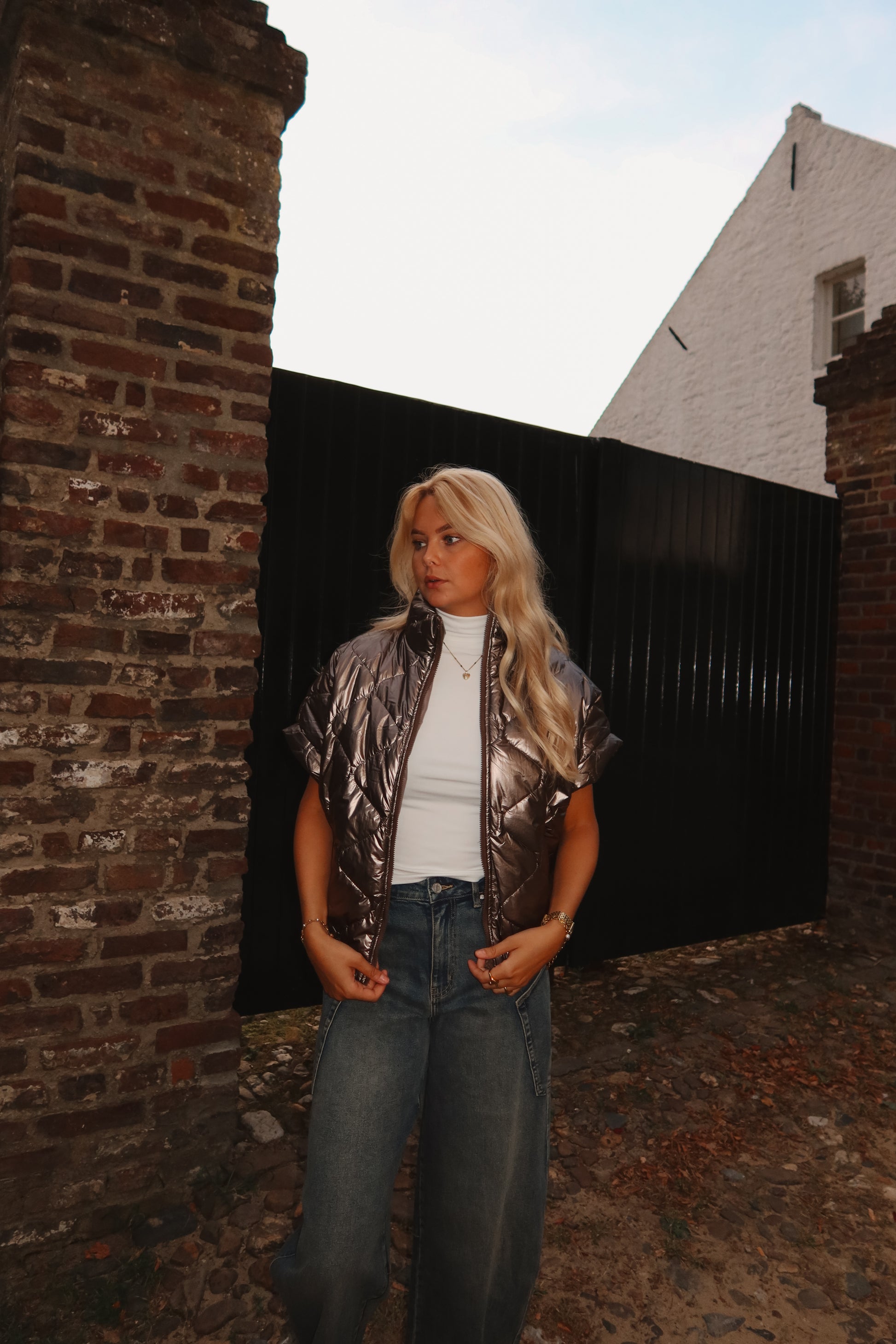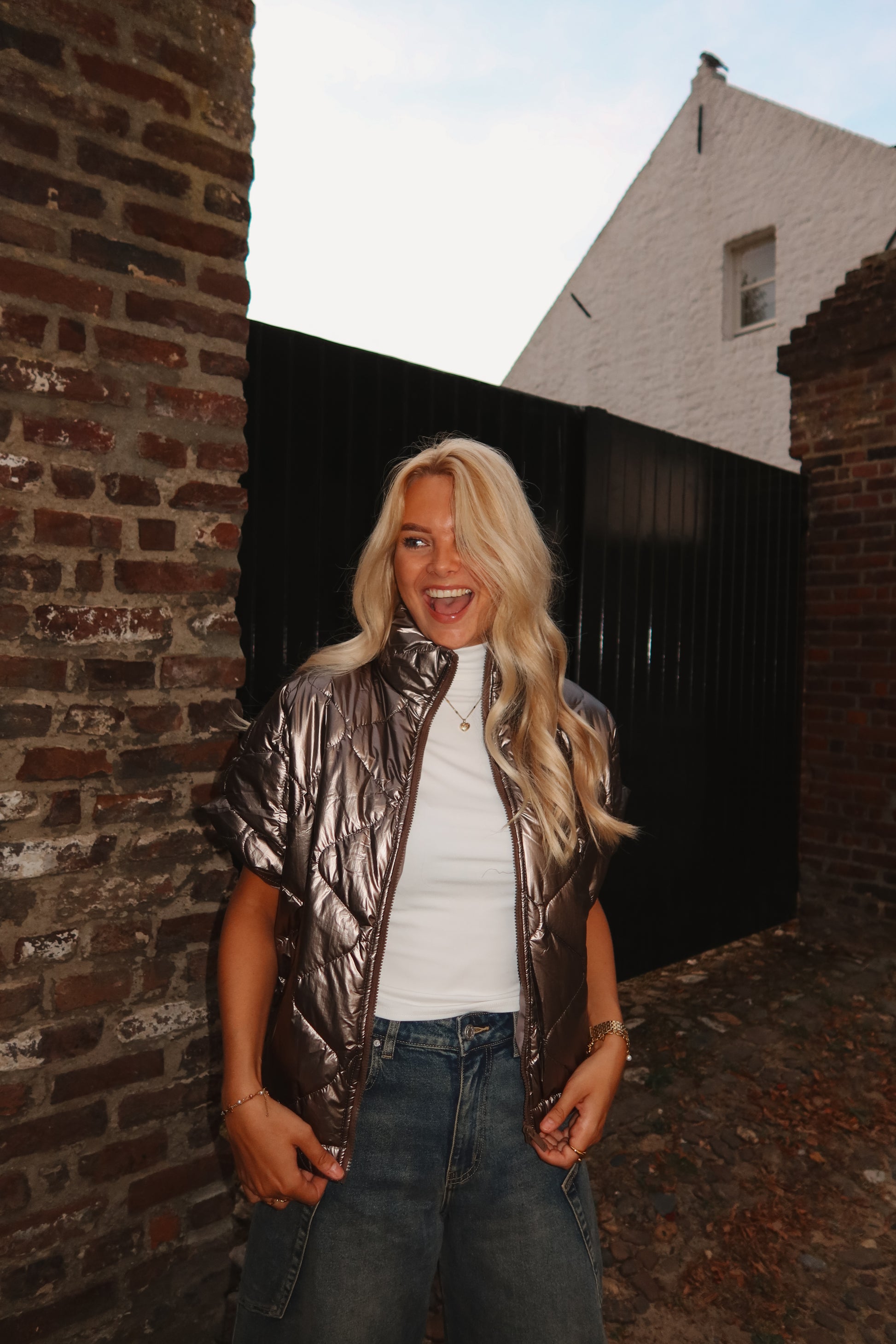 Bodywarmer Aro taupe is de perfecte combinatie van trendy en praktisch. De choco-kleurige metallic glans geeft dit item een moderne, opvallende look, terwijl de korte mouw en lichte vulling zorgen voor comfort en draaggemak. Ideaal om te dragen over een trui of basic top voor een stoere, gelaagde outfit.