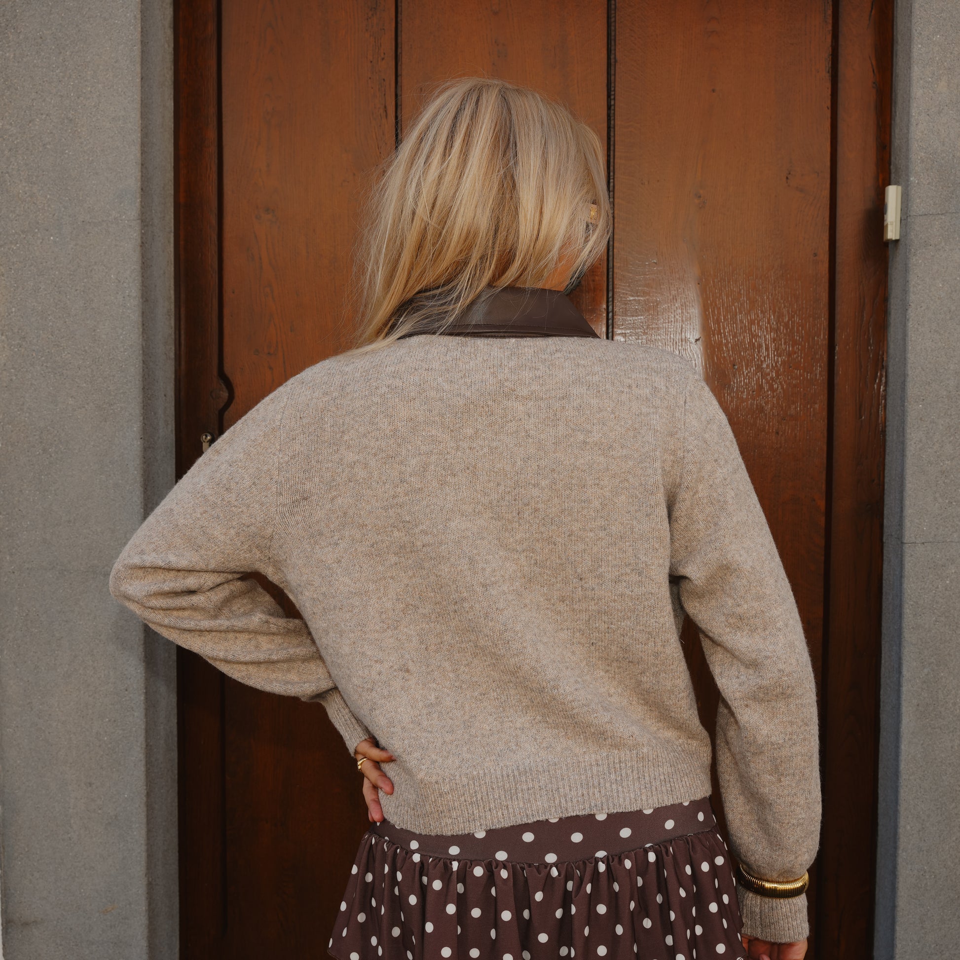 De Cardigan Top Rea in taupe combineert warmte met een modieuze twist. Het zachte breisel voelt comfortabel aan, terwijl de contrasterende kraag in donkerbruin kunstleer een opvallend detail toevoegt. Afgewerkt met goudkleurige knopen en subtiele zakjes is dit vest zowel stijlvol als veelzijdig – perfect om casual te dragen of chiquer te stylen met een rok of pantalon.
