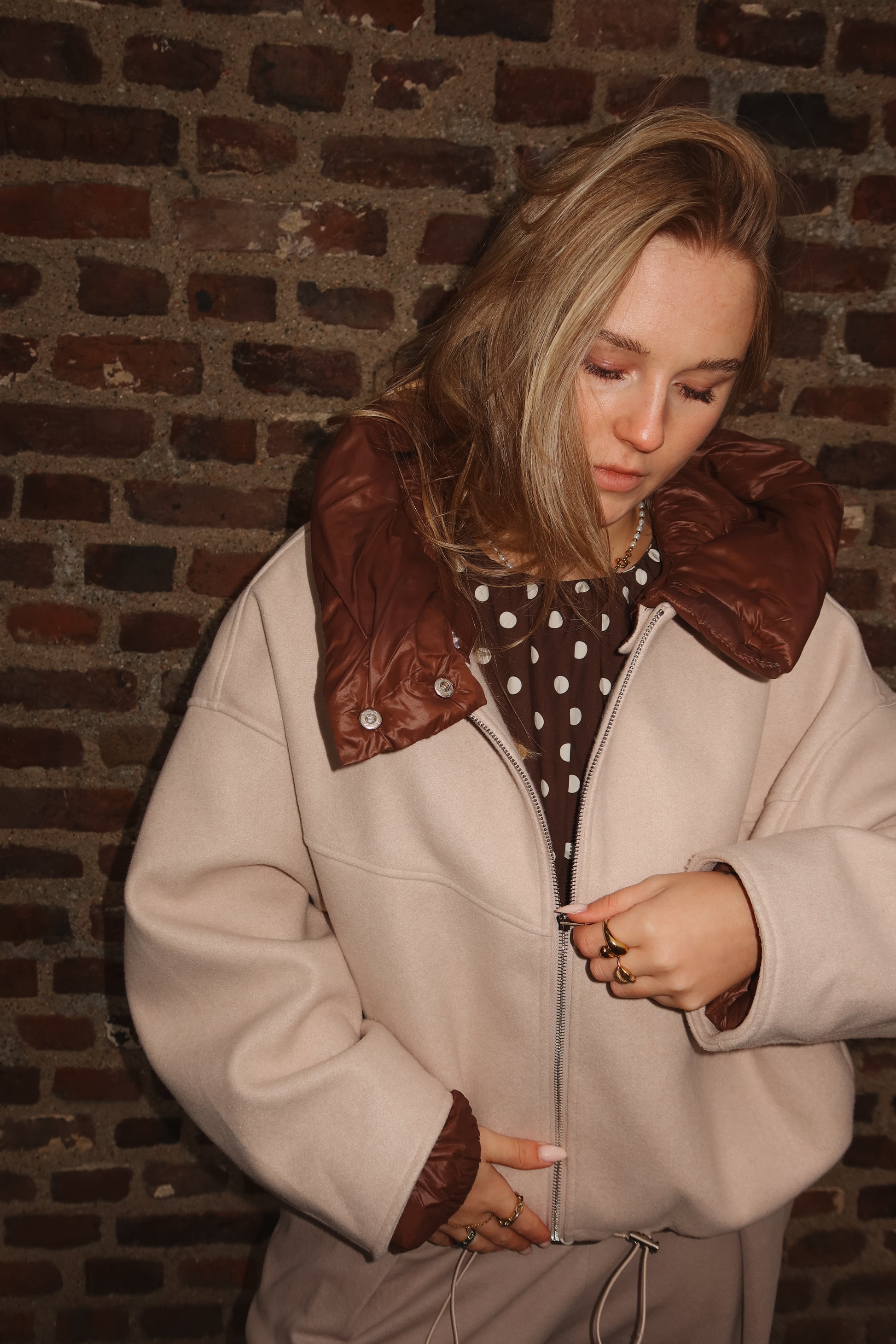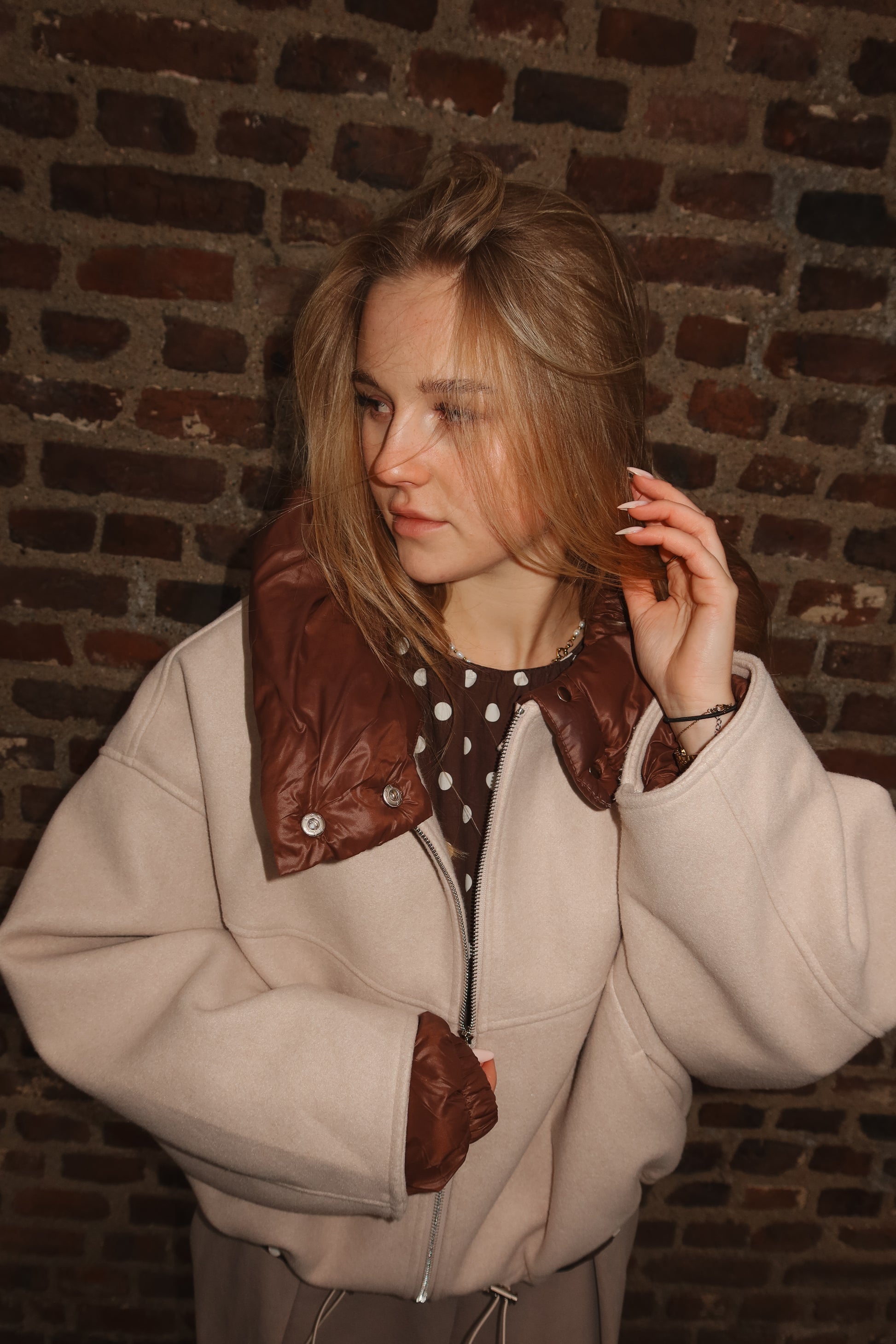 De Jas Aya in beige is een moderne, sportieve jas met een trendy twist. Het oversized model heeft een stoere rits en verstelbare koorden in de taille voor een speels effect. De Bruine details aan de kraag en mouwen geven de jas een verrassend contrast en maken hem extra stijlvol. Perfect voor frisse dagen waarop je er warm én fashionable uit wilt zien.