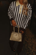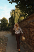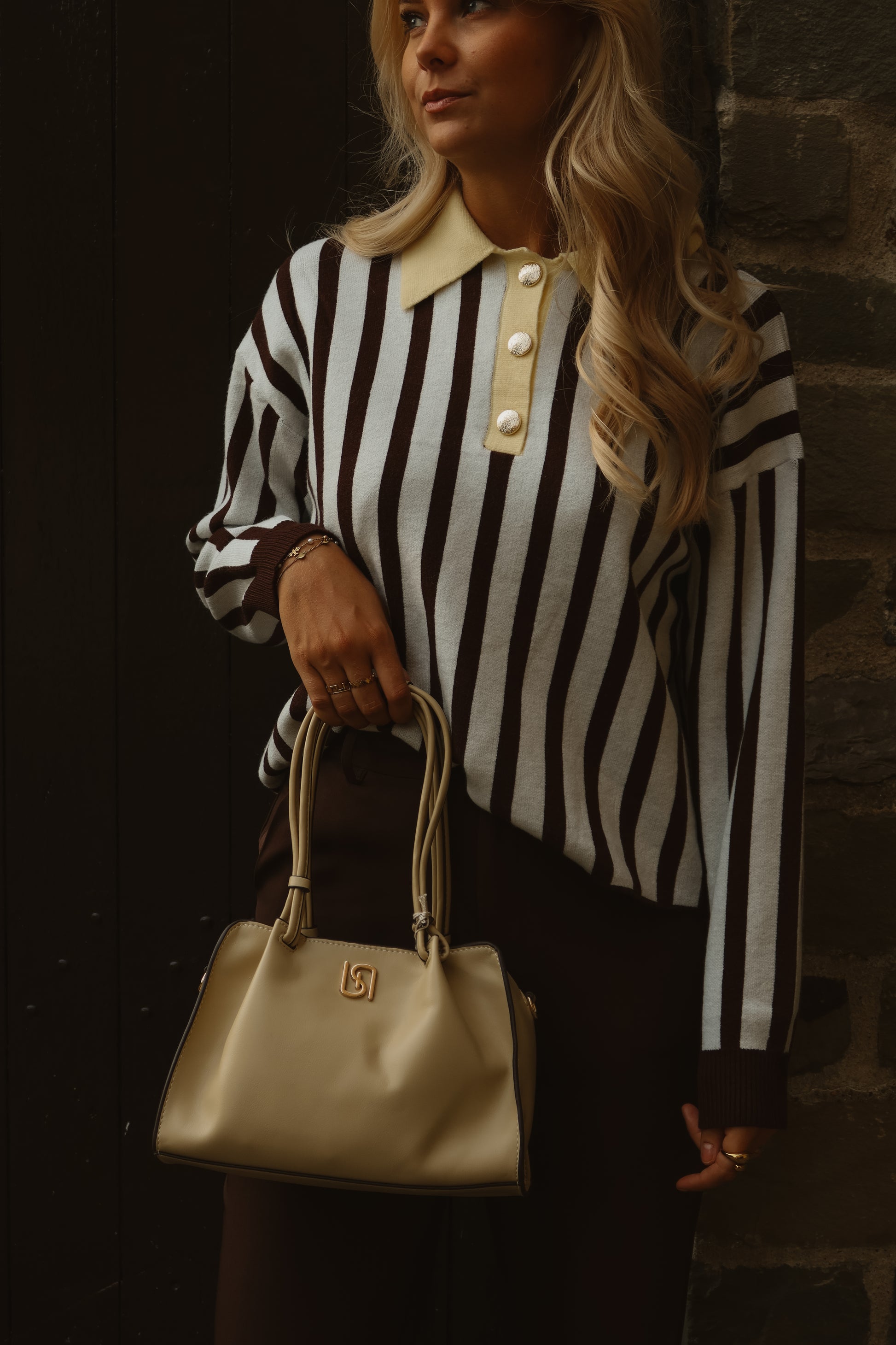 De Polo Kaya in bruin combineert een speels streeppatroon met een stijlvolle retro touch. De contrasterende kraag en knopenbies in zachtgeel geven de polo een frisse twist. Dankzij de losse pasvorm en zachte knit voelt hij comfortabel aan én oogt hij moeiteloos chic. Perfect te stylen met een wide leg pantalon of je favoriete denim voor een moderne, nonchalante look.