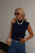 De Lina top is een mouwloze knit in diep navyblauw met een aangesloten pasvorm. Het tijdloze design maakt hem eindeloos te combineren: draag casual met denim of classy met een pantalon.