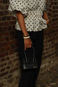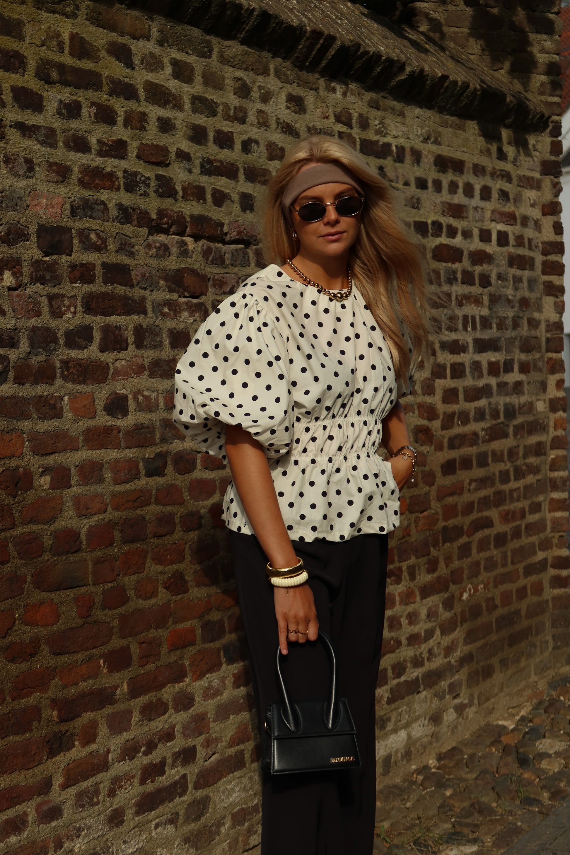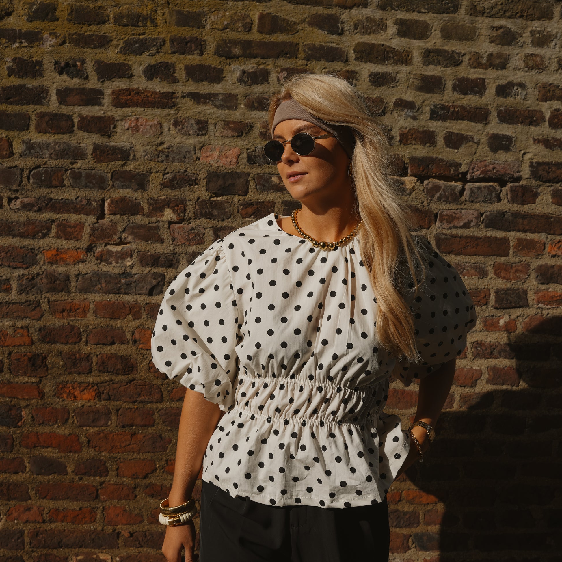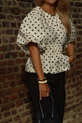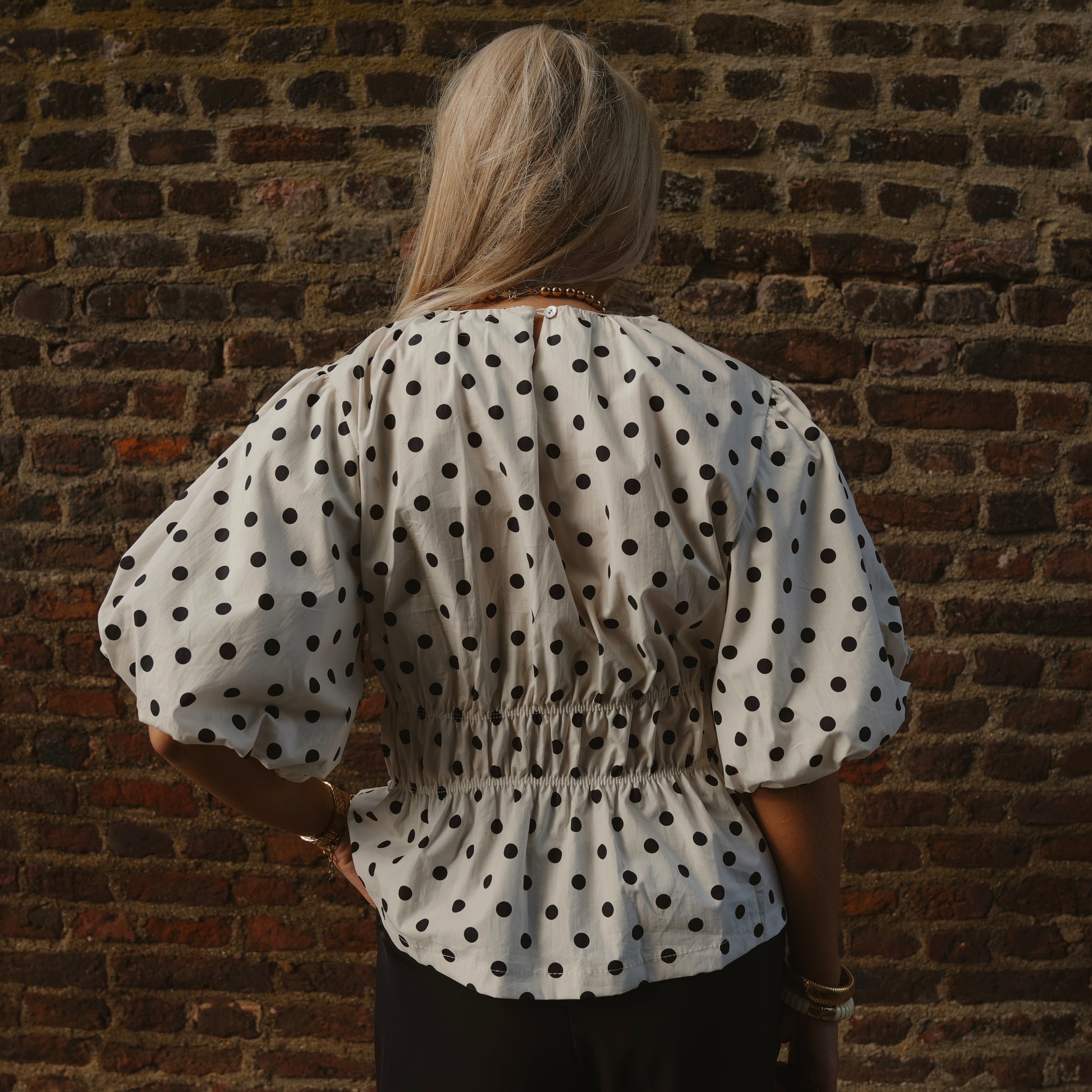 De Top Mara in creme is een speelse blouse met witte polkadots en korte pofmouwen. De elastische taille accentueert je silhouet, terwijl de luchtige stof zorgt voor comfort. Perfect te stylen met een pantalon of denim voor een moeiteloos stijlvolle look.