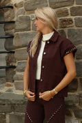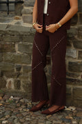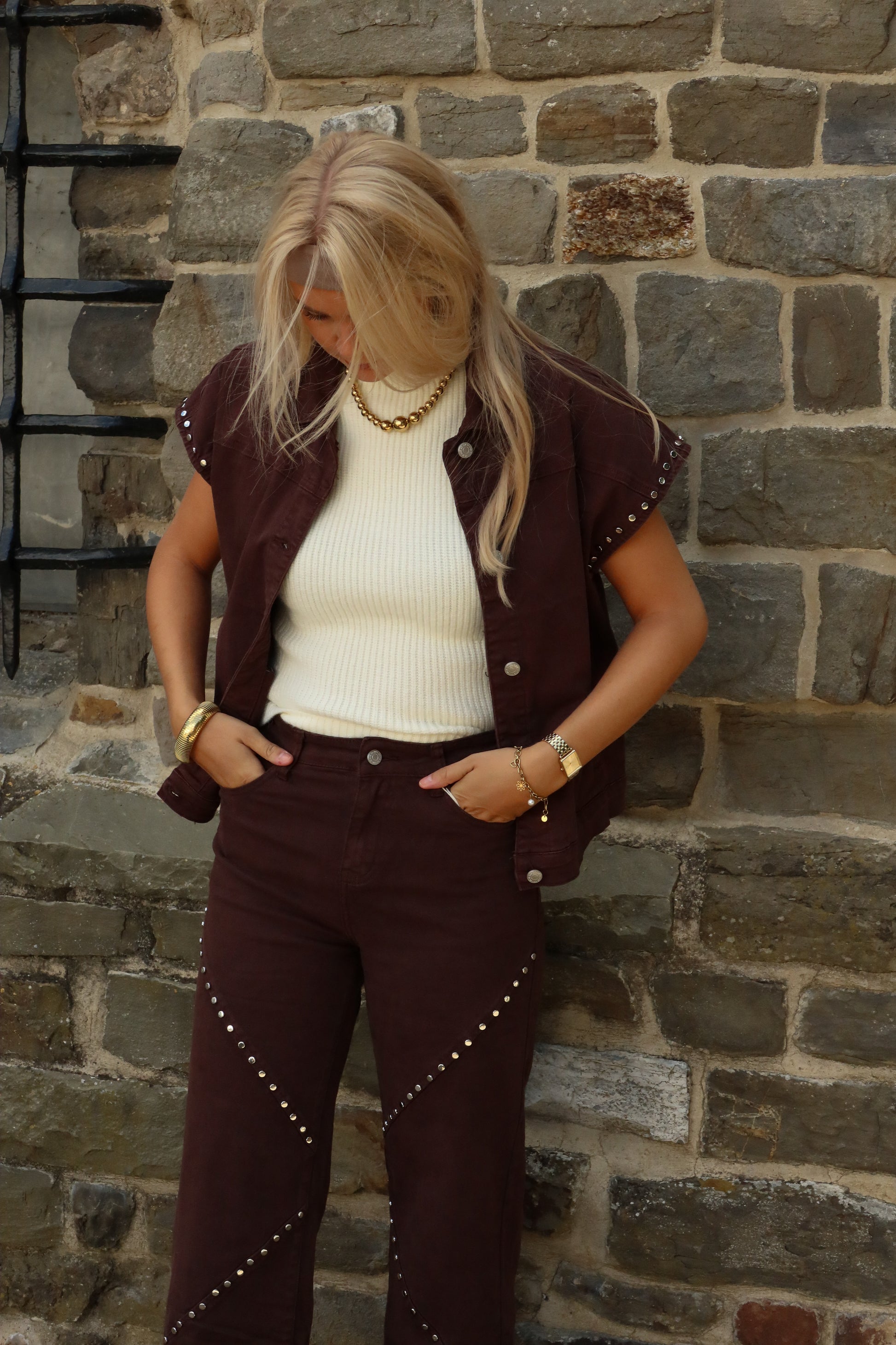 Top Zano bruin is een stoere mouwloze spijkertop met een moderne twist. Gemaakt van stevige denimstof in een diepe bruine tint, afgewerkt met zilverkleurige knopen en studs langs de schouders voor een edgy detail. De rechte, iets losvallende fit maakt hem makkelijk te combineren: draag hem casual open over een top of body, of als statement piece dichtgeknoopt met de bijpassende spijker jeans Zano.